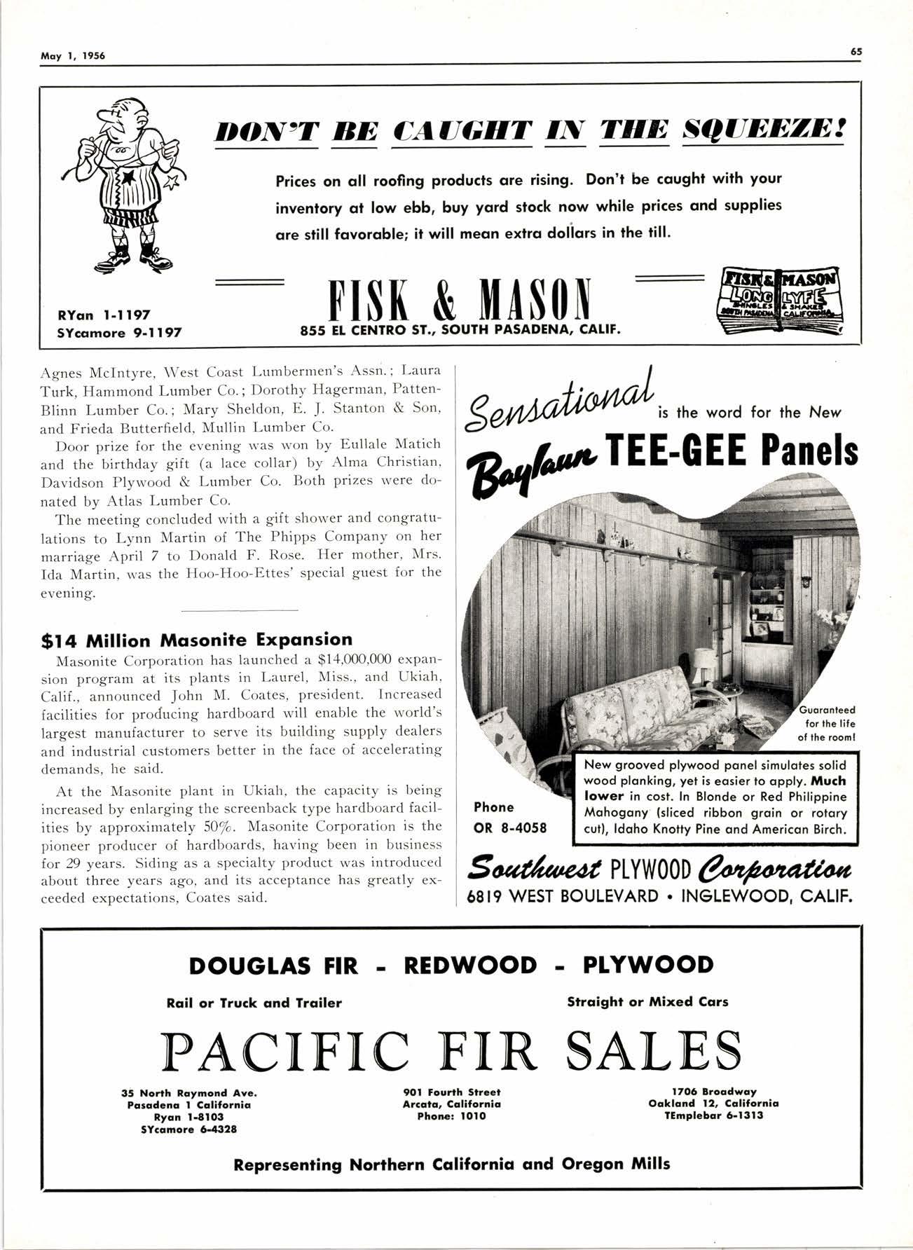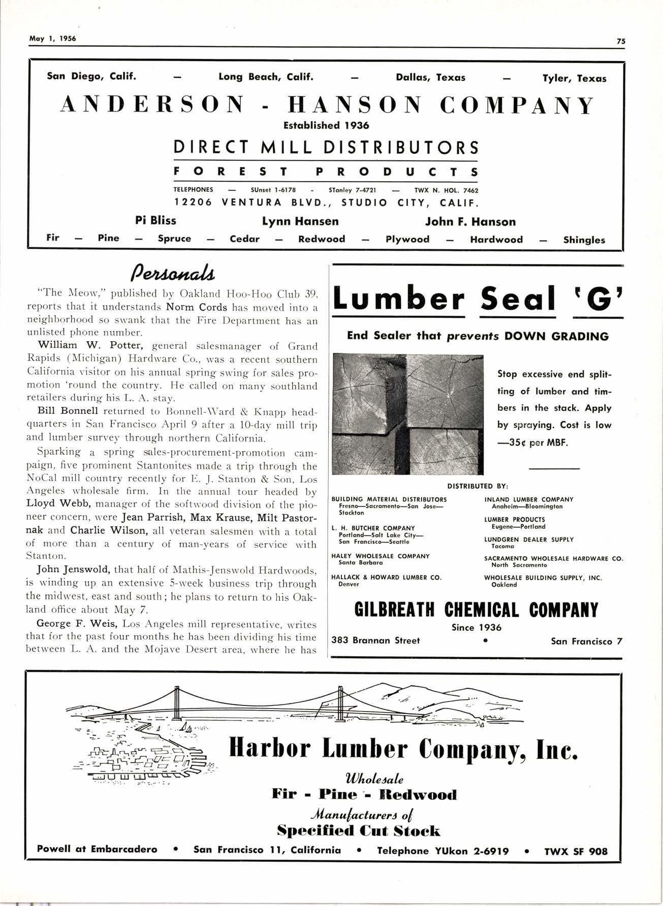 &UMBER (Los Angeles Lumber, Inc.).....MAdison 6-9134 Fisk 6 Mqson (So. Pqsadenc)....PYrcmid l-1197 Forest Products Scles Co.. .Plecscnt 3-ll4l Founlqin, Ed., Lumber Co...........LOgcn 8-2331 Freemcn d Co., Stepben G,..........Hcrbor 2024 Hcllincn Mcckia Lumber Co. ANgelus 3-4161 Hcllncrk Lumber d Plywood Co.....STcte 6-4112 Hqmmond Lumber Compcnv..... .Rlchnoad 9-7171 Hcrris, L, E. Lumbgr Ct.. .-. .BBcdshaw 2-1023 Hcyaes Scles Compoy. .SYcqmote ?-7376 Hill 6 Morton, Inc...... .BRcdsbcw 2-4375 Hobbs Wcll Lumber Co...........ATlontic 2-5779 Holnes Lumber Co., Fred C...........RYcn l-0079 A. L. Hoover Co...... ........RYcn l-9321 HuIl Lunber Compcny. .Pl.ymouth 6-8lgl Industricl Lumber. ......CHcpncn 5-5501 Lqwrence- Philips Lumber Co....BBcdshaw 2-$77 Lerrett Lumber Conpcny... .. .B-[.ymond 3-4727 Tbe Lons-Bell Lumber Co.. .DUnkirk 7-1347 L. A. Dry Kilu Storcge. lnc,......ANgelus 3-6273 Los Angeles Lumber, Inc.. .MAdison 6-9134 Los-Ccl Lumber Co,..... ...LOgcn 5-5311 MccDoncld Co., L.W..........BBc&hhcw 2-510t Mcrqucrt-Wolle Lumber Co.....HOllywood 4-7558 Mcrtin Bros. Box Co. (Lumber Div.). .NE 6-2363 McCloud Lumber Co,. ....VEmont 8-4963 Meier, Herb Lumber Co., (trrccdic). .RYtrn l-818I Neimca-Reed Lunber Co,. .. .. .STcnIey 7-1129 Nelson Lunber (Monrovic)..........ElIioit g-5421 Hcrold A. New-WLlse. Lbr...... ...RYcu l-8829 Jqmes Newquist Lumber Scles........RYca l-8486 North Star Timber Corp..........BBadsbcw 2-6367 Oxlord, Rex trumber Co..........Axninster 3-6238 Ossood, Boberi S.. .......DUnlcirk 2-8278 Pcciliq Fir Scles... .RYcn l-8103 Pccific Lumber Co., The. ....RYcn l-9321 Pccific Forest Producis, Inc......AXminster 2-0571 Pccilic Weslern Lumber Co,..........BYca l-8123 Thom Philips Lunber Co.........CRestview 6-5383 Phipps Conocny, The.. .RAvmond 3-5326 E. L. Reitz Co...... .......HEmlock 6-9547 Boddiscrclt, Inc., LunbEr Soles.....LOEcu 8-4031 noy Folesi Producls Co,... ...........STcte 5-ll4l Ilqn A. Shivelv. ........CHcpno 5-2083 Sierrc REdwood Compmy. .PArlcviaw 8-7379