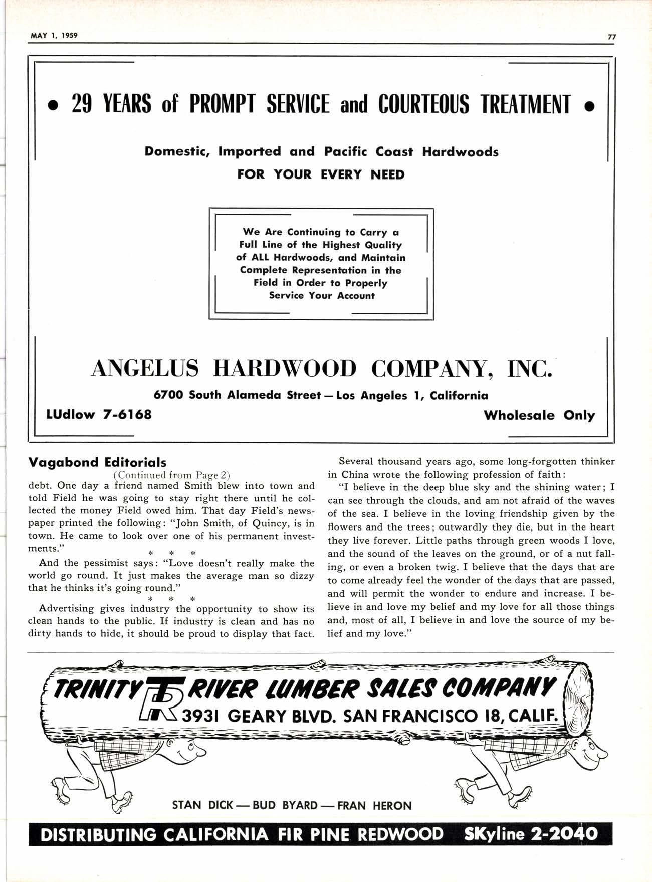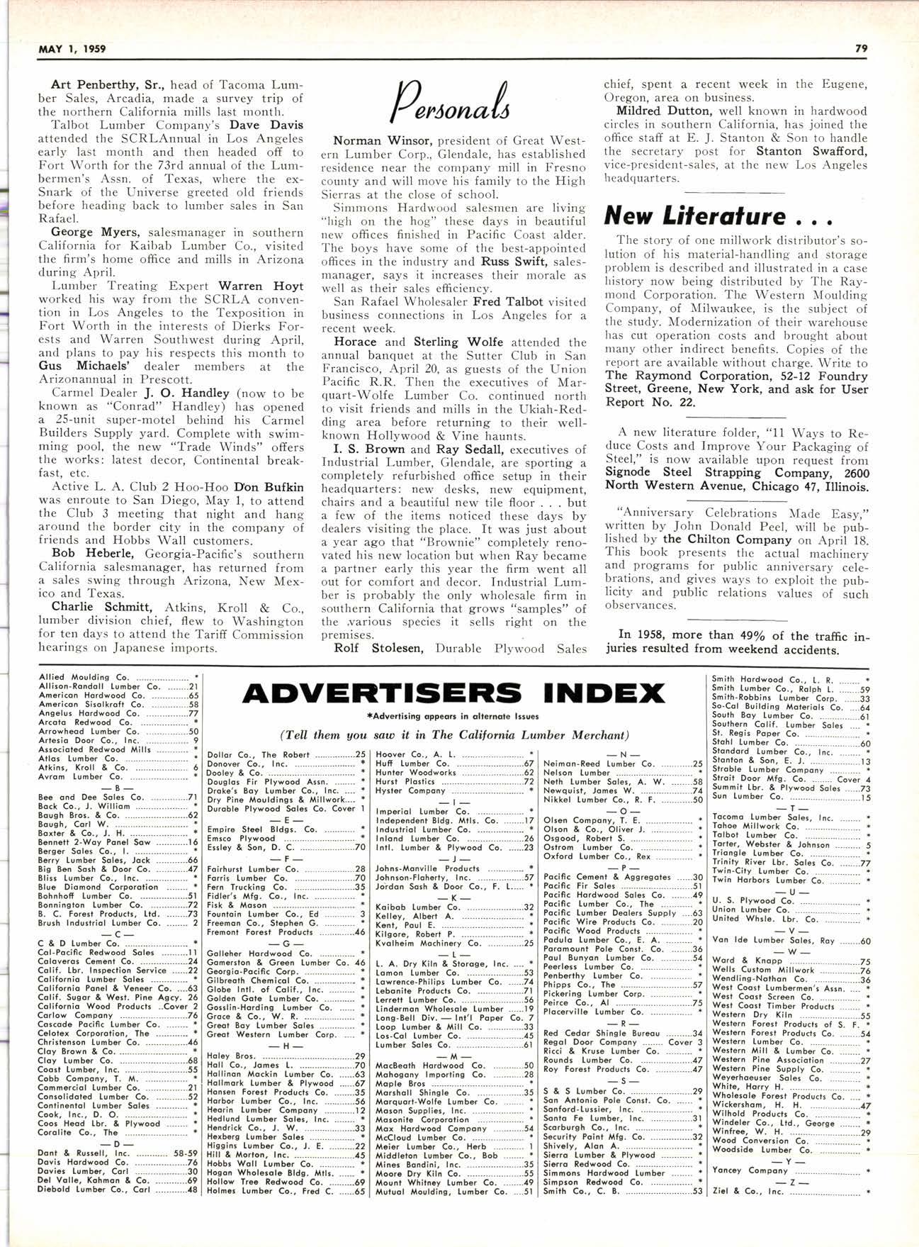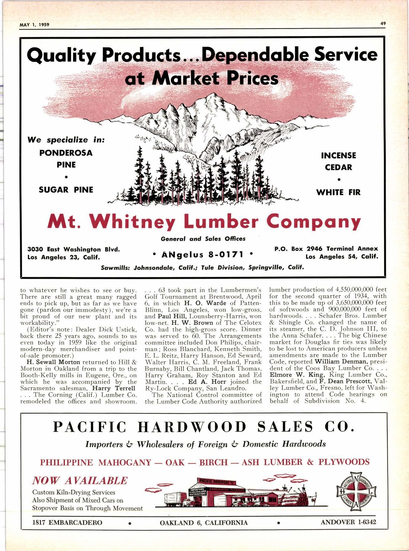 8-Pdge Pidqiql sectim s Pqgei 37-44 J* JLu Joo*n Vagabond Editorials 2 Personals -.... 34. 79 New Product Proffts ......,---,----. 8 25 Years Aso ......-........ . . 48 New Literature ---.--.--.----.... 10, 79 Fun-Facts-filosophy ..--......-...-- 66 Obituary ..--......... 20 Want Ads .....--.-".. ... 78 I\4y Favorite Story .-.........--..".... 32 ADVERTISERS' INDEX 79 W. F. Rugg Opens Enlarged Upland Yard .........-.-.-- 6 Three NoCal Hoo-Hoo Clubs in foint Meetinq 12 Redwood Region Logging Conference Held in-Santa Rosa .--.--.........- 14 The A-LMA-NAC of Northern Dealers 24 Dealers ............__.......... 24 Arizona Dealers' Convention to Hear 'Straight Talk' ..,__._,_.___..........--. 26 "Enthusiasm"-An Editorial ...-..-.. .-. ...-.........._-. 28 with New D.C., Golt 'Research for Profft' Theme of FPRS Meetins -.-.......-.- 30 _l-959 Dealer Exqo-sitlon to Feature 'Avenue of Selling' ----.---............._.- 56 How Long Should Your Tax Records Be Kept? .- ..__....-..... d0 San Gabriel Yard Closes After 56 Years' Operation ..-----..----......._......_ G7 N-AWLA to Sponsor Sales-Training Program .......-. ......_..._.._.._..... 68 Southem California Hits AII-time High in llarch Building ........_....... 74 {Lrl lltilrl,t stB i'.bi* ; YY- r*;. g++1*r ; i - ,;;,.;ul, I ted DTAL RYAI{ l-8t 8l FOR P.O. Box 731, Arccdio, Cqlifomio TWX: ARCADIA CAt 9633 - The QUALITY'S HIGHER From "tlElER" -
