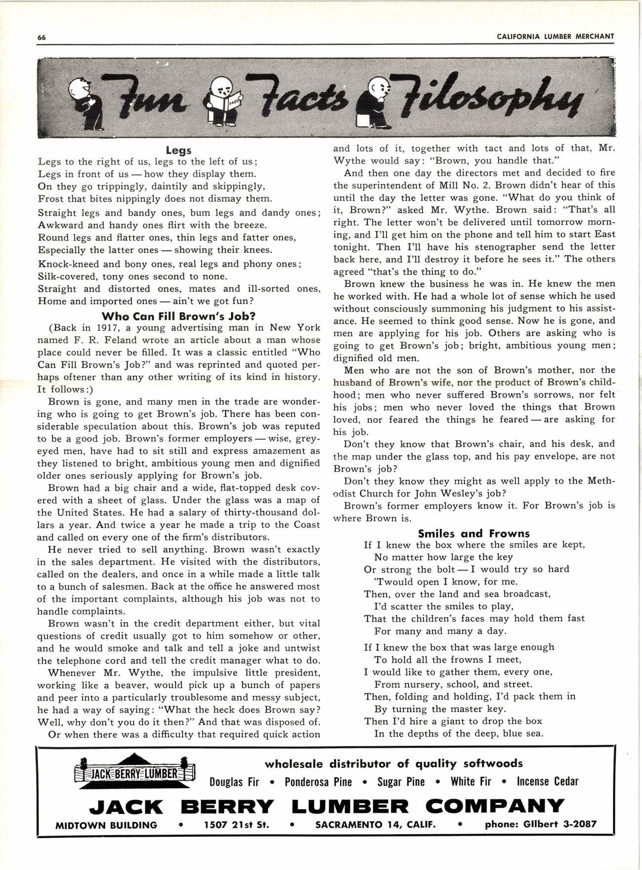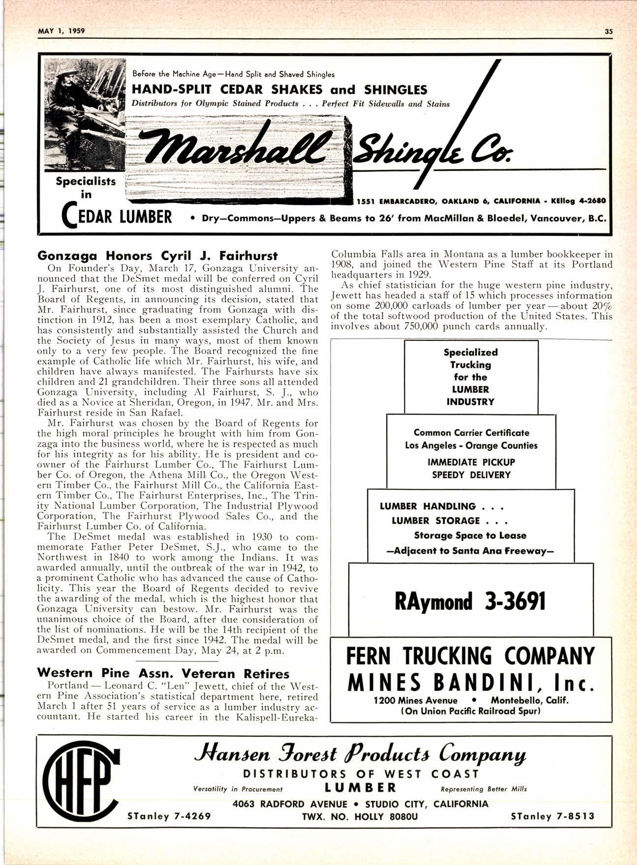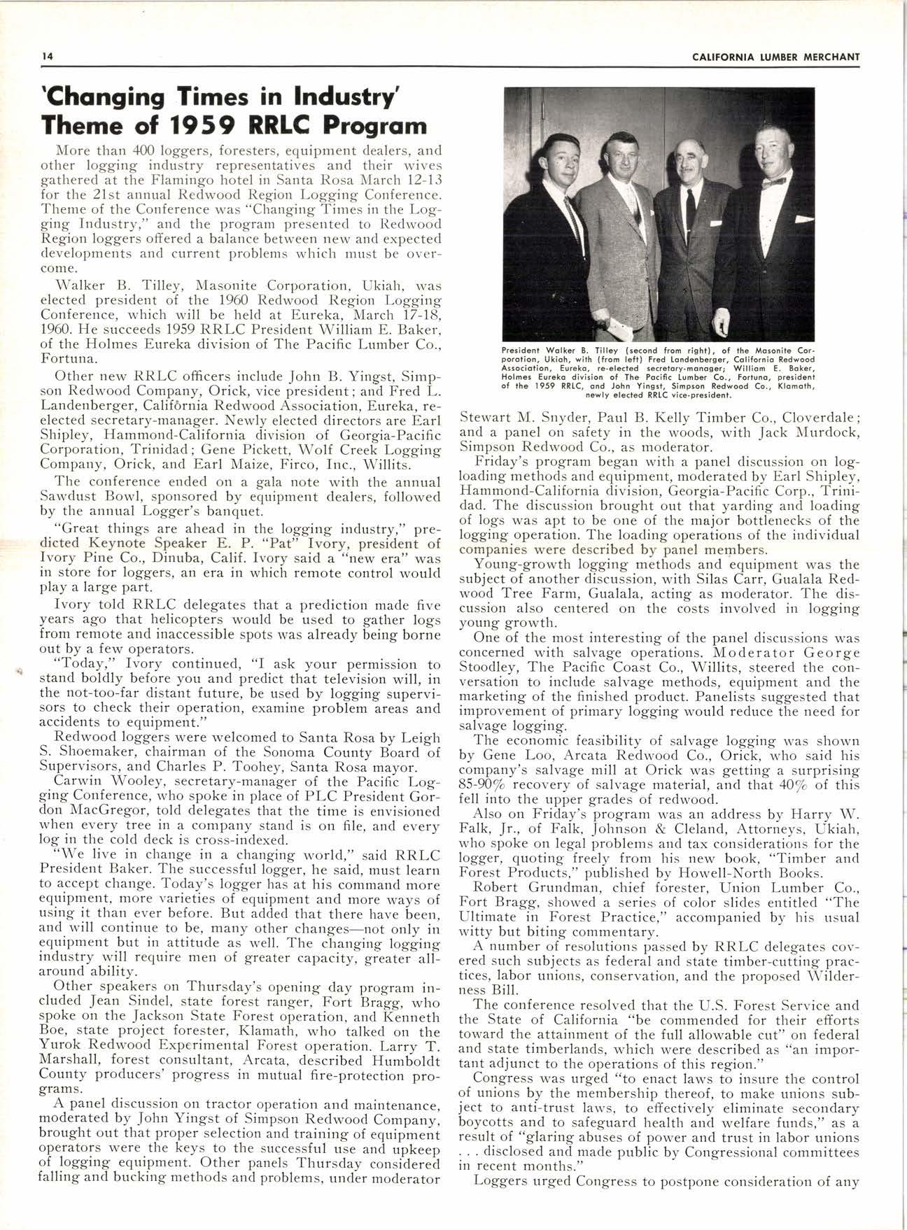 8-Pdge Pidqiql sectim s Pqgei 37-44 J* JLu Joo*n Vagabond Editorials 2 Personals -.... 34. 79 New Product Proffts ......,---,----. 8 25 Years Aso ......-........ . . 48 New Literature ---.--.--.----.... 10, 79 Fun-Facts-filosophy ..--......-...-- 66 Obituary ..--......... 20 Want Ads .....--.-".. ... 78 I\4y Favorite Story .-.........--..".... 32 ADVERTISERS' INDEX 79 W. F. Rugg Opens Enlarged Upland Yard .........-.-.-- 6 Three NoCal Hoo-Hoo Clubs in foint Meetinq 12 Redwood Region Logging Conference Held in-Santa Rosa .--.--.........- 14 The A-LMA-NAC of Northern Dealers 24 Dealers ............__.......... 24 Arizona Dealers' Convention to Hear 'Straight Talk' ..,__._,_.___..........--. 26 "Enthusiasm"-An Editorial ...-..-.. .-. ...-.........._-. 28 with New D.C., Golt 'Research for Profft' Theme of FPRS Meetins -.-.......-.- 30 _l-959 Dealer Exqo-sitlon to Feature 'Avenue of Selling' ----.---............._.- 56 How Long Should Your Tax Records Be Kept? .- ..__....-..... d0 San Gabriel Yard Closes After 56 Years' Operation ..-----..----......._......_ G7 N-AWLA to Sponsor Sales-Training Program .......-. ......_..._.._.._..... 68 Southem California Hits AII-time High in llarch Building ........_....... 74 {Lrl lltilrl,t stB i'.bi* ; YY- r*;. g++1*r ; i - ,;;,.;ul, I ted DTAL RYAI{ l-8t 8l FOR P.O. Box 731, Arccdio, Cqlifomio TWX: ARCADIA CAt 9633 - The QUALITY'S HIGHER From "tlElER" -