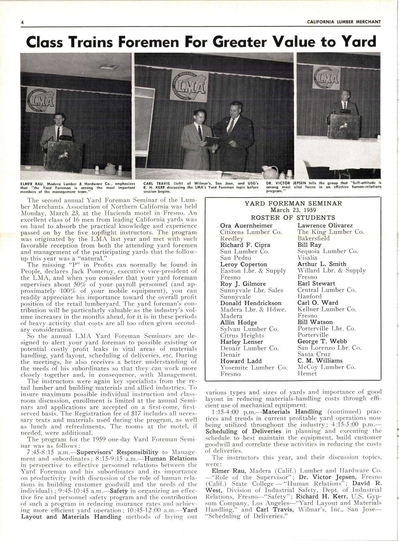 The second annual Yard Foreman Seminar of the Lumber Merchants Association of Northern California was held Monday, March 23, at the Hacienda motel in Fresno. An excellent class of 16 men from leading California yards was on hand to absorb the practical knowledge and experience passed on by the five topflight instructors. The program was originated by the LMA last year and met with such favorable reception from both the attending yard foremen and management of the participating yards that the followup tlris year was a "natLrtal."