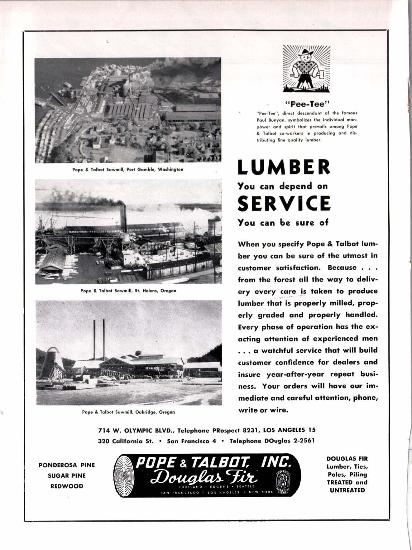 714W. OIYMPIC B[VD., lelephone PRospect 8231, LOS ANGETES t5 32O Collfornio 3t. . Son Francisco 4. Telephone DOuglos 2-2561 PONDEROSA PINE SUGAR PINE REDWOOD DOUGTAS FIR Lumber, Ties, Poles, Piling TREATED ond UNTREATED Popo I lolbcr 3owmlll, ?ort Ocnbb, Worhln3lon Popo t lolbot Sowmlll, 3t. Hrbnr, Orrgon Popo & Iolbot Sowrnill, Ookridgo, Orrgon