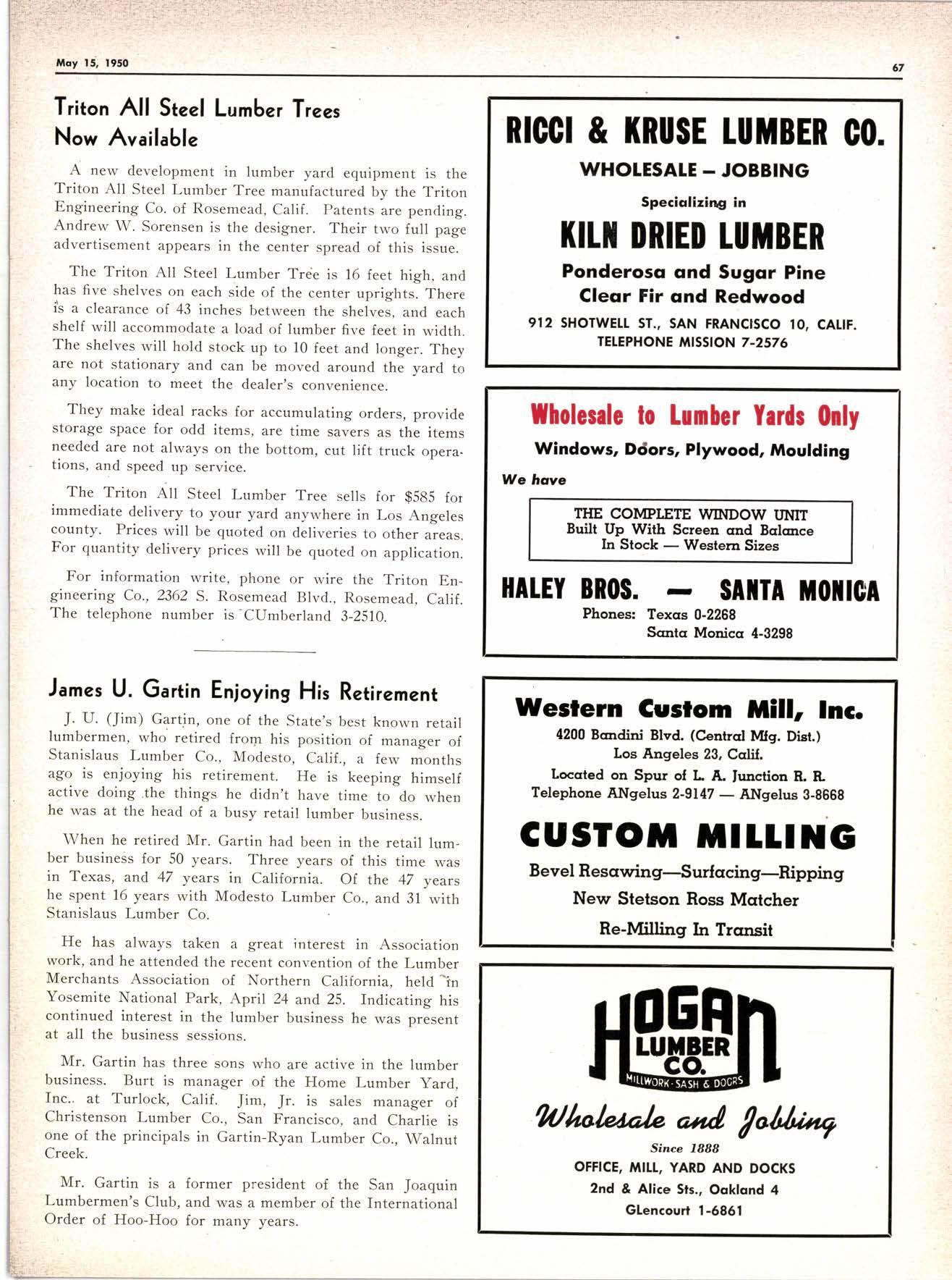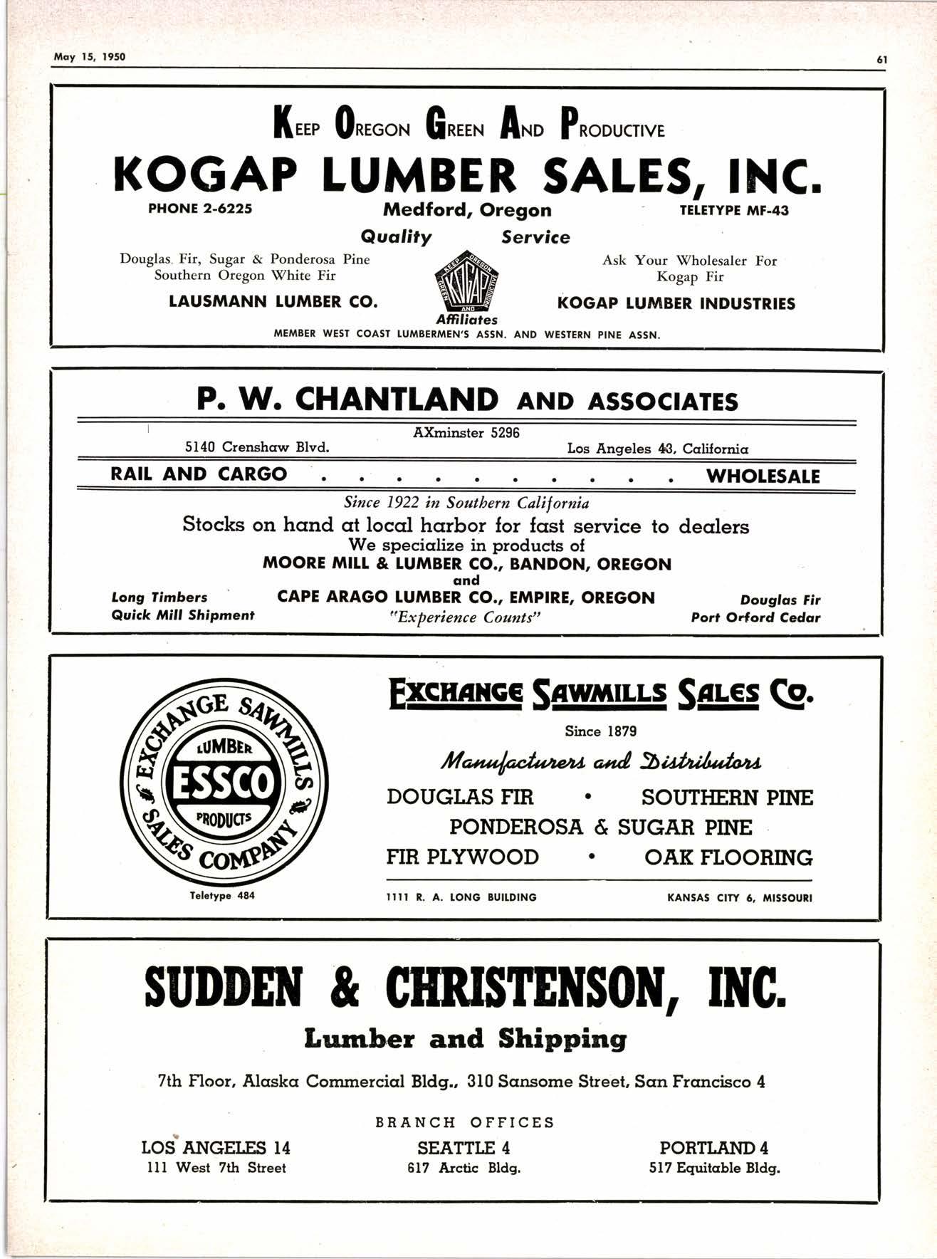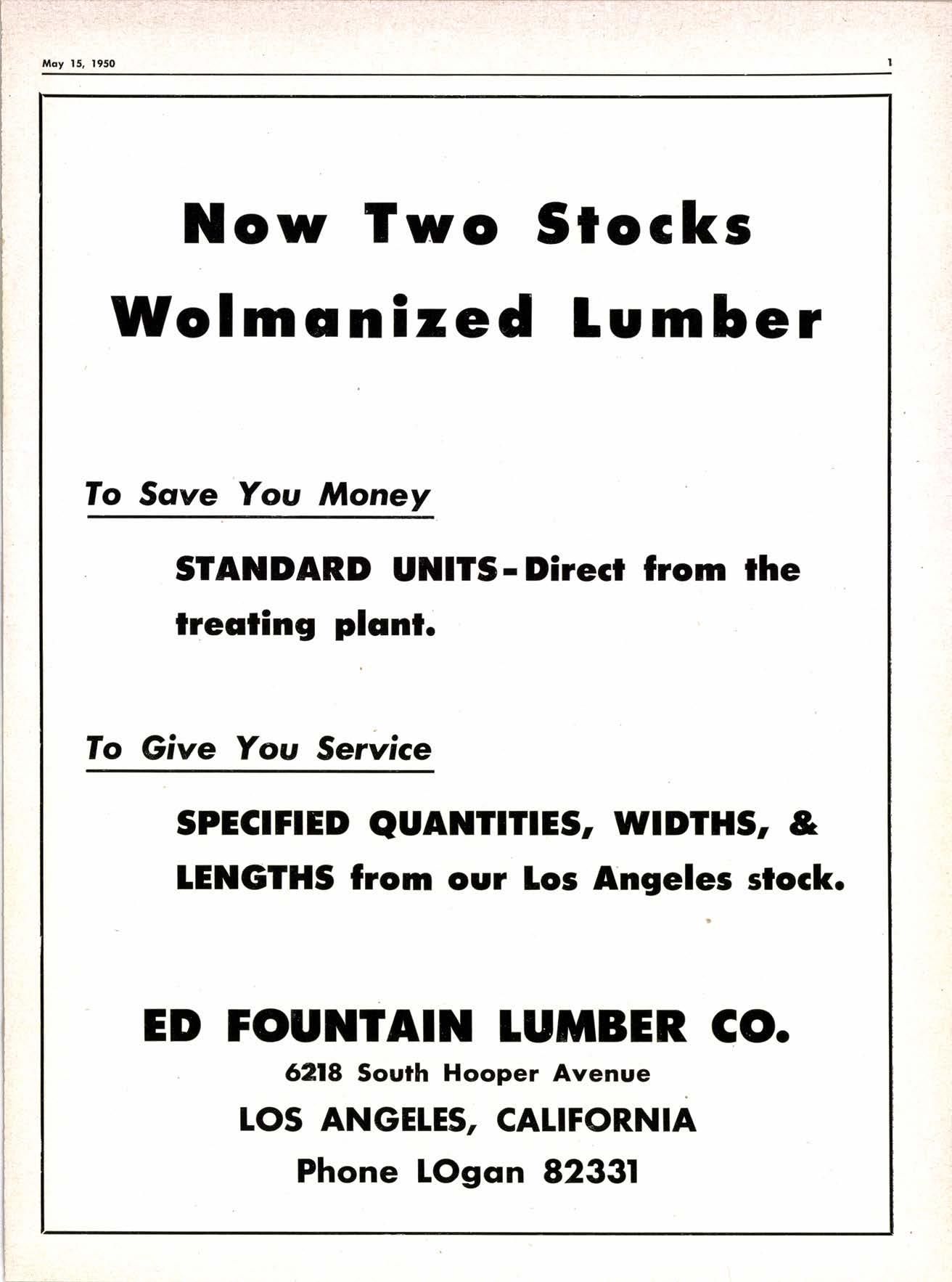 flloy 15, 1950 Now Two Srocks Wolmqnized lumber To Sqve You l$oney STANDARD UlllTS- Direct from the trecrting planl. To Give You Service SPECIFTED QUAilflflES. WTDIHS. & IEI|GTHS from our Los Angeles slock. ED FOU]ITAITI TUMBER CO. 6218 South Hooper Avenue tOS ANGEIES. CALIFOR.NIA Phone LOgon 82331