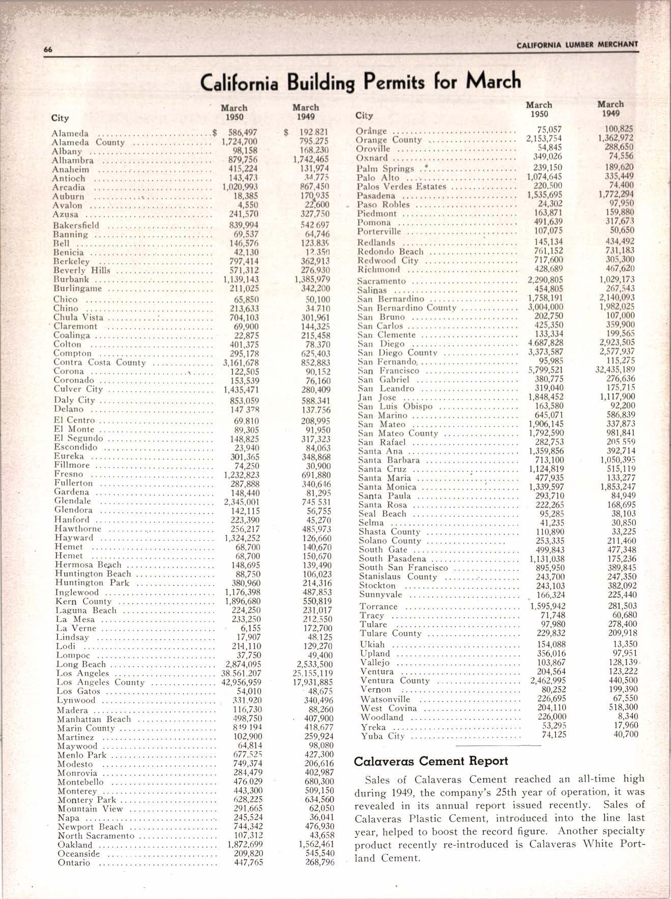 The California Redwood Association for the month of March, 195Q seventeen companies reporting, gave orders received as 52,588,000 feet, shipments 48,292,000 feet, and production 51,502,000 feet. Orders on hand at the end
