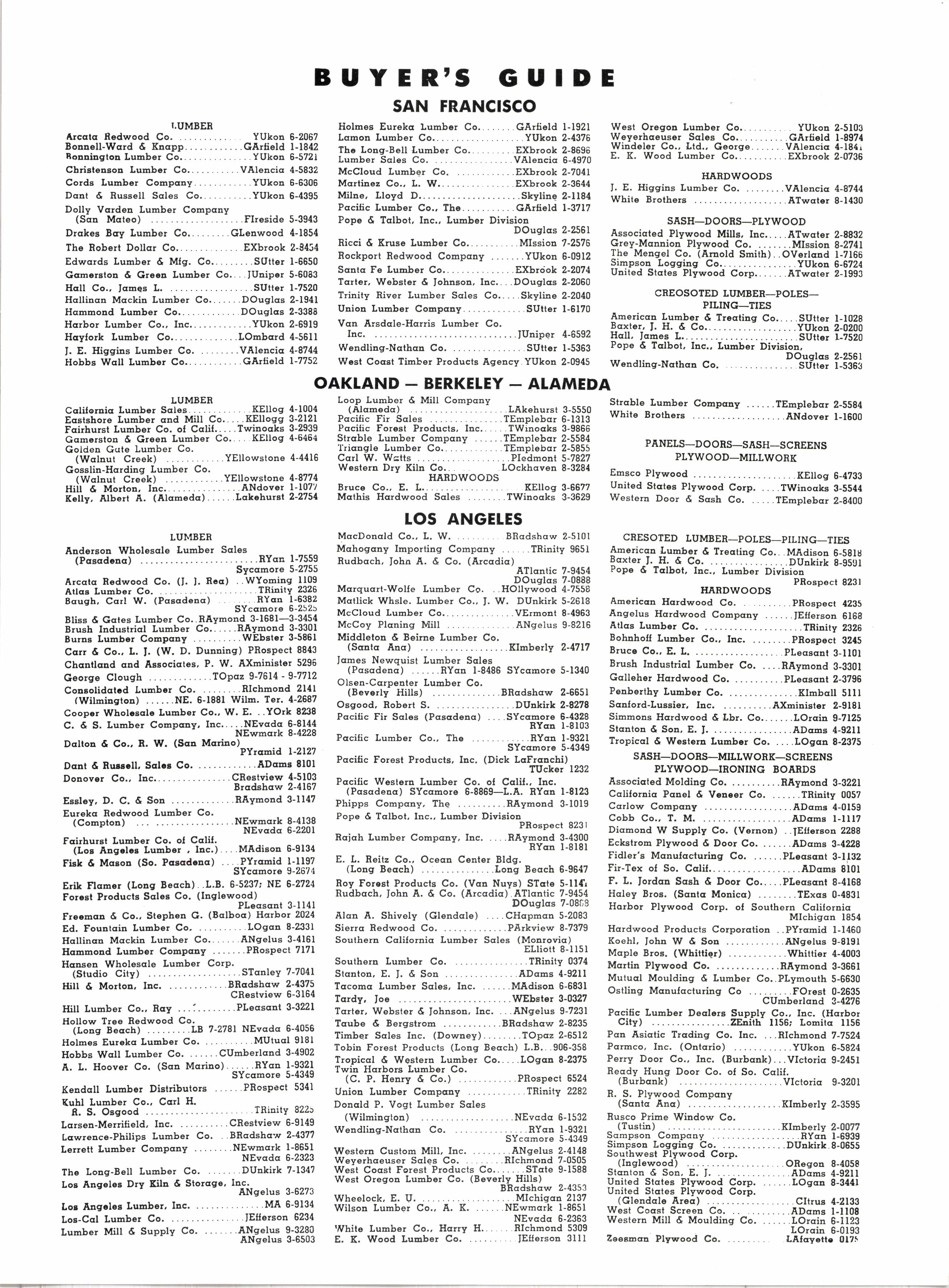 SAN FRANCISCO Holmes Eurekc l.unbcr Co........GArtield l-1921 E L West Oregon Lumber Co.. YUkon 2-5103 Weyerhceusor Sqles Co,..........GArlield l-897{ Wiudeler Co., f,td., George.......VAlencic rl-I8l E. K. Wood LumbEr Co...........Exbrook 2-0?36 ITANDWOODS J. E. Higgins Lumber Co. ....... .VAtencic 4-8744 White Brolhers .ATwctor 8-1430 SASH_DOORS_PLYWOOD Associqted Plywood Mille, Inc.....ATwqter 2-8832 Grey-Mcnnion Plywood Co, ..Mlssion 8-27ill The Mengel Co, (Amold Smith)..OVertcnd l-2166 Simpson Logging Co...... .YUkon 6-G?2{ UDited Stctes Plywood Corp,......ATwcter 2-1993 CNEOSOTED LI'MBEN_POLES_ PILINC}_TIES Sitqble Lunber Compcny ......TEnptebcr 2-55g4 White Brothers .ANdoyer l-1600 PANELS_DOONS_SASH_SCNEENS PLYWOOD_MILLWORK Emsco Plywood ..KEUog 6_4233 UDited Stctes Plywood Corp. ....TWinoct<s 3-55{{ Weslern Door d Scsh Co, .....TEmplebcr 2-g400 CNESOTED LUMBEN_POLES_PILING_TIES Americcn lunber d Trocting Co.. .MAdison 6-5g18 6cxrer_J. H. 6 Co. .......DUnkirk 8_9591 Pope d Tolbot, Iac., Lumbar Division ItARDwooDs PRospect823l Americqa Hardwood Co. .......pRospect 4235 Angelus Hordwood Conpcny ......JEflersoa 6168 Atlqs Lumb.r Co. .TBiairy 2326 Bohaholl Lumber Co., tnc. ........pnospect 3Zl5 Brucr Co,, E, L. .....plecgcnt 3-ll0l Brush Indugtricl Lumber Co. ....RAymond g-gg0l Golleher Hcrdwood Co, ..........Pl,essqnt 2-3796 Peaberthy Lumber Co. .....Klmbcll 5lll Sculord-Lussier, Inc. .AXmiuister 2-9181 Simmons Hqtdwood d Lbr. Co.......LOrain 9-7125 Stcatoq d Son, E, J. .......ADs-s 4-9211 Tropiccl d Wegtern Lumber Co, ....LOgca 8-2375 sAsII-D OOnS-MILLWOnT-S CnEENS PIYWOOD_IRONING BOANDS Associqled Molding Co. .RAymond 3-3221 Ccliloraic Pcnel 6 Vcacer Co. ......TBiaify 005? Ccrlow Conpcny ........ADqms 4-0159 Cobb Co., T. M. ... .....ADcms l-lll? Dicnond W Supply Co. (Vernou) ..fElleraon 2288 EqLstrom Pl!ryood d Door Co. ...ADcms 3-{Zl8 Fidler'g Monulacturiag Co. ......Plecsqat 3-1132 Fir-Tex ol So. Cclil. ........ADams 8l0l F, L. lordan Sagh 6 Door Co,....Plecsant