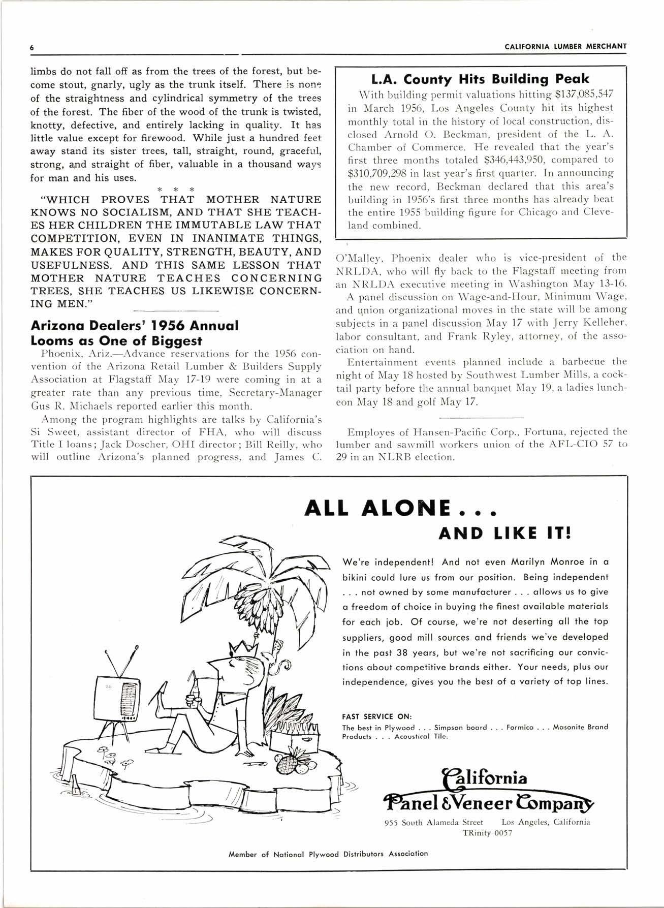 Ilcorporatsd uader the lcws ol Cclilonic I. C. Dioue. Pres. cnd Trecs.; I. E. Mcnia, Vice Ptos., M' Adcms, Secrelcry Published thelsi <rnd lSth ol ecrch month qt Roomg 508-9-10, 108 West Sixth Street, Los Angeles, Cqlil,, Telephoae VAndike 4555 Entered cs Second-clcss mctter Septembet 25,1922, at tbo PoBl Ollise at Log Angeles, Cqliloniq, under Act ol Mqrcb 3. 1879 OtE MAY SouthernCslilornia News cnd Advertising SAX FRANCISCO OFEICE MAX M. COOr dlO Mclet St. Sco Frcaci:co ll YIlLoa 2-1797 Subscription Price, $3.00 per Yeqr Single Copies, 25 cents eqch LOS ANGELES 14, CALIFORNIA, MAY 15, 1956 Advertising Bcrtes on Applicction