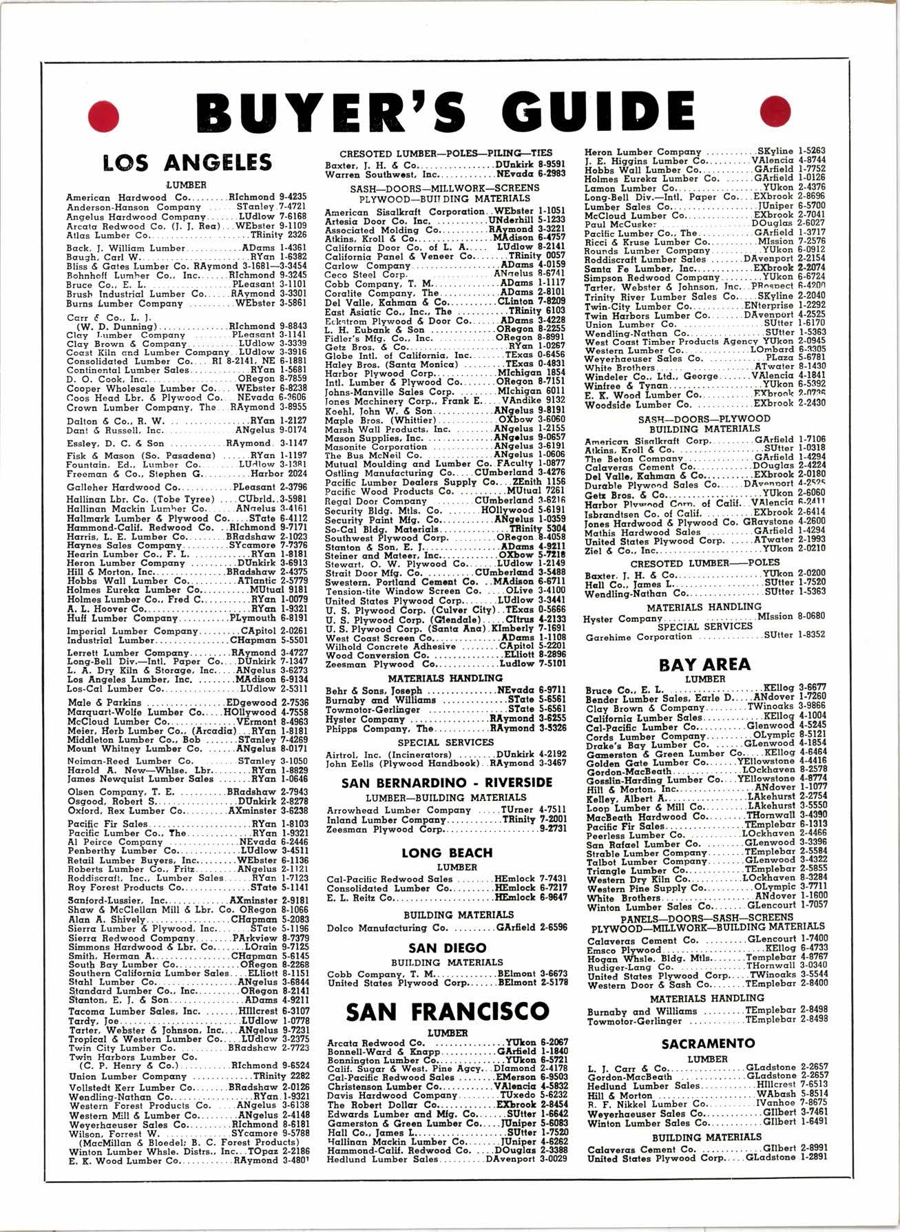 SAN DIEGO BUILDING MATEBIALS Cobb Conpcnv, T, M.. ..BEloilt 3-5673 UBtted Stcio; ?lywood Corp.......BElnoat a5178 SAN FRANCISCO LI'UBEN BAY AREA LUMBEN MATERIAIS HANDLINC Bumcby and Willicne '.TEmplebcr 2'8t!€8 iii-rrior-G"tti"sei .TEmbleb<rr 2'8498 SACRAMENTO LUIVIBER L. I. Ccrr 6 Co.... ....Glcdstone !--2Q!! doiioi-iiccBe-at ...........Glcdstoue 2-265? ft.aiuaa tu-fer Scles. ..Hlllcrest 7-6513 Hill 6 Morton Wlbcsb !-!!!-{ i. i. fiii;i Lumber Co.. . .IVcnhoe ?-Q675 W"""tf""*.t Scles Co.. ..Gllbert 3'!461 WLion iu"rUet Scleg Co. .Gllbert l-6491 BUILDING MtrTENIALS Cctqvcrqr Ccneat Co. ....Gllbcrt !'8991 Eon-.a SGt"t Ptywood Corp.....Glqdstone l-2891