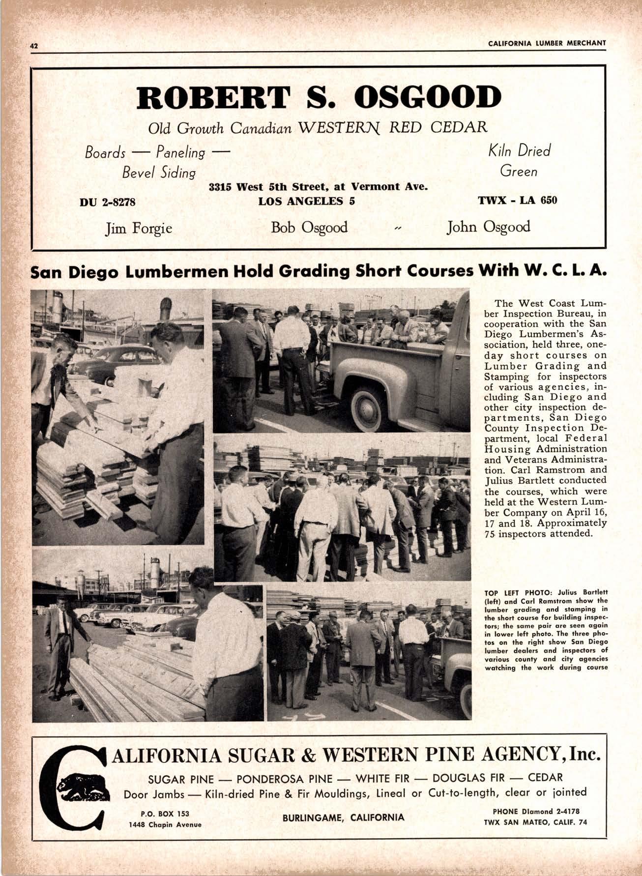 A far greater problem faces us today with tl.re new Lumber Grades and their allowable uses under the building codes of our cities and counties. This committee, headed by Rex Clark, has had plenty of opposition. Group meetings have been held with city and county building officials. Two weeks ago a four-day meeting was concluded with representatives of the W.C.L.A., along with officials of the Building and Safety Departments of Los Angeles, Long Beach and San Diego. A better understanding of the problems facing us was reached, but the officials of the Los Angeles and Long Beach Building Departments whacked us over the head, spanked us, told us what we could and could not do, and went back home. We lumbermen do not believe they have a full understanding of grades of lumber, so we proposed and they accepted our invitation to visit the sawmills selling in this area to see for themselves the lumber as it is manufactured and graded-including Utility grade which they so vigorously condemned. Our lumber is produced from a natural resource, and it is our duty to see that tl-re product of the natural resource is wisely used. This we propose to do, and our Grade-Stamping program is going to help guarantee it-as well as assuring our customers that they are receiving the grades of lumber they are paying for. For 14 months, we have had Erik Flamer working with us, devoting all of his time to this problem.