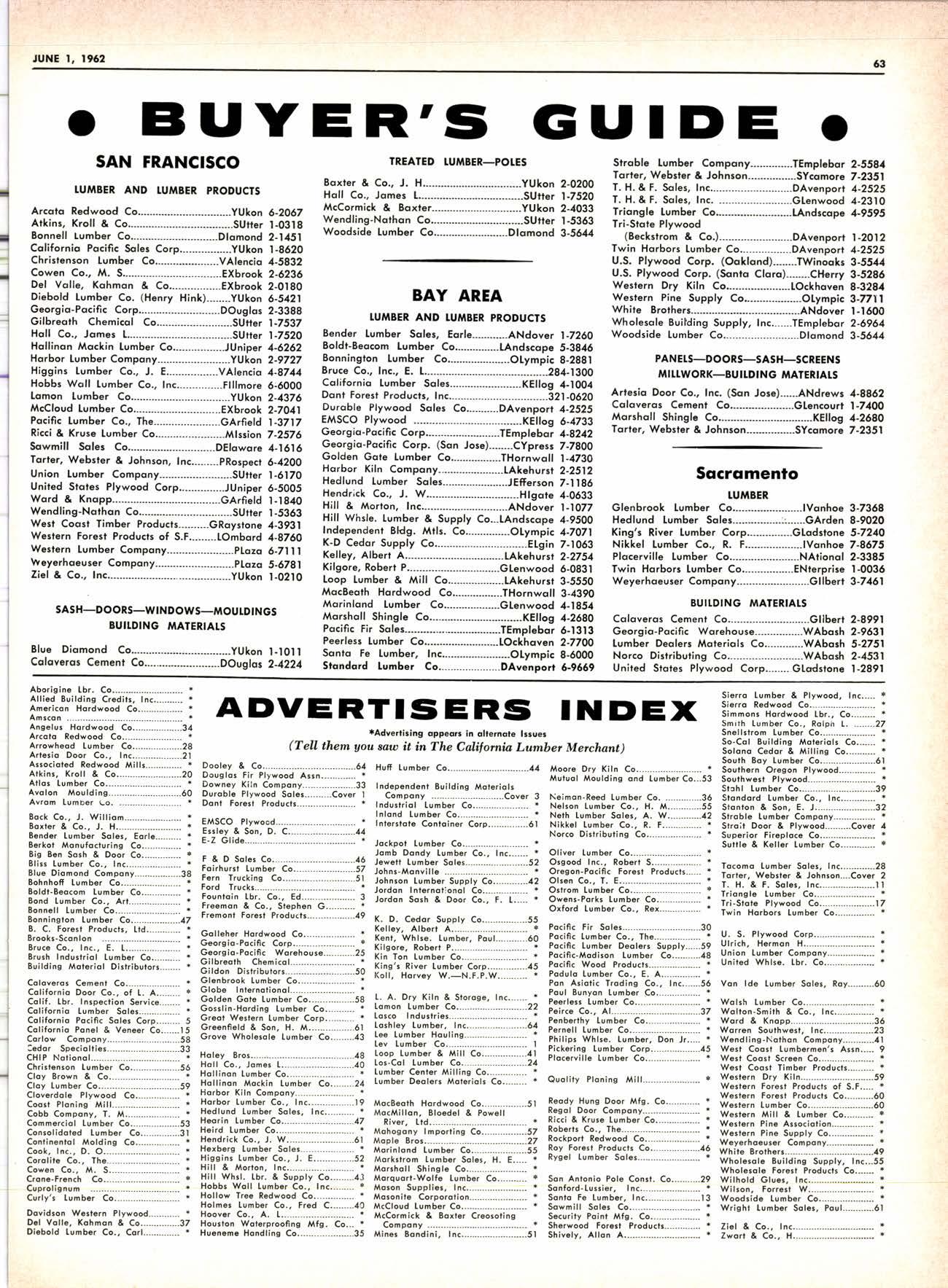 AT HOME IN ANY SETTING Lam-Loc Pecky Cedar lives comfortably in almost every architectural surrounding. ILs pedigree is acceptable in even the oldest forms, including this uninhibited Spanish atmosphere. Here it compliments the traditional somber tones and at the same time provides staunch support for vivid accent colors. Devotees of conventional, early American, oriental and contemporary also recognize Lam-Loc Pecky Cedar as pleasant company. Good acoustical qualities, easy maintenance and practical longevity make it a friend of both home owner and commercial builder. I Lam-Loc Pecky Cedar is a favorite with dealers too. One inventory for both interior and exterior applications, specialty item mark-up and growing popularity are good reasons for a vote of confidence. For those dealers who haven't discovered the comfortable nature of Lam-Loc Pecky Cedar, we have a friendly merchandising plan that wilI get you acquainted. AII it costs is your time to ask about it. Ed Fountain Lumber Company' 6218 South Hooper Avenue, Los Angeles 1, California.