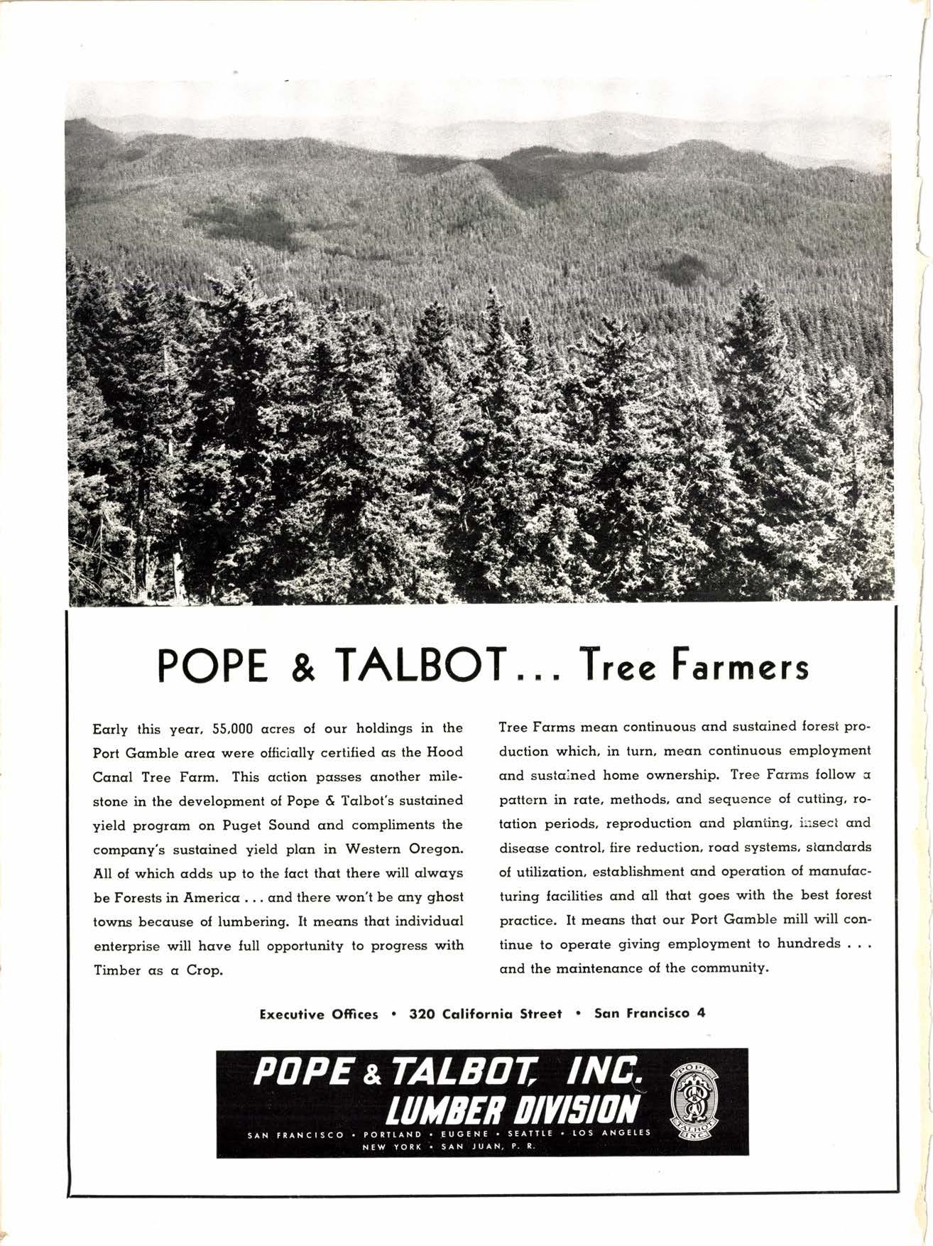 Ecrly this yecr, 55,000 ccres ol our holdings in the Port Gcmble qred were ollicicrlly certilied crs the Hood Ccncrl Tree Fcrrm. This qction pctsses qnoiher milestone in the development ol Pope d Tcrlbot's sustcrined yield progrcm on Puget Sound crnd compliments the compqny's sustqined yield plcrn in Westem Oregon. All oI which crdds up to the lact thcrt there will clwcys be Forests in Americcr , qnd lhere won'l be crny ghost towns beccruse oI lumbering. It mecrns thct individucrl enterprise will hqve lull opportunity to progress with Timber cs cr Crop.