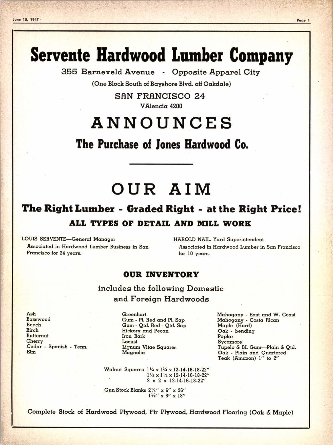 Sery€nte Hcrdwood Lumber Co., 355 Bcrneveld Ave. (24)..........VAlencia 4200