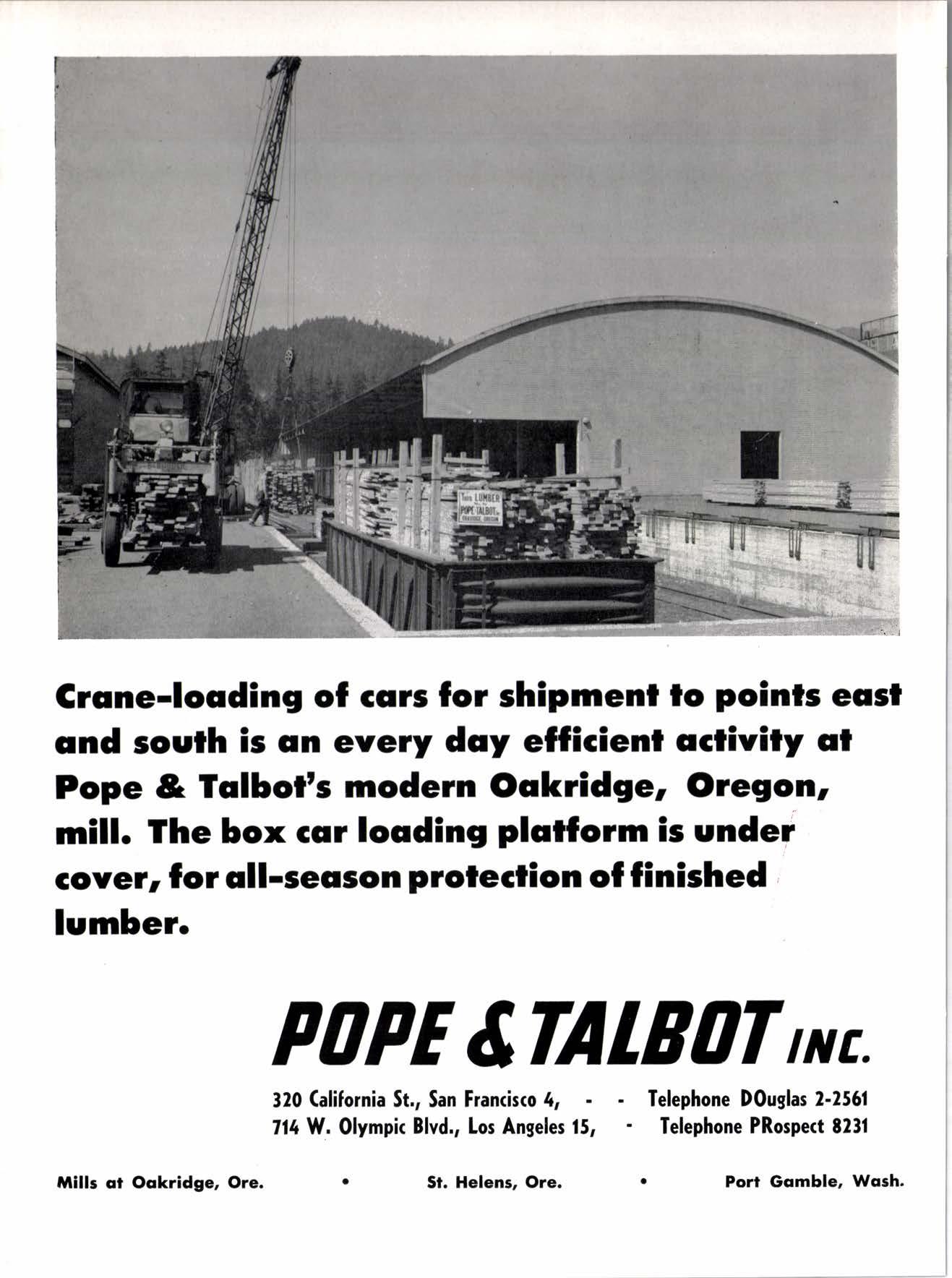 I ",=ii. -s- -.,-ff't* Crcrne-loeiding of ccrrs for shipmenl to points easl and south is cln eyery day efficient octivify crt Pope & Tcrlbotts modern Oclkridge' Oregohr mill. The box cqr locrding plorform is under coyet,lot crll-seoson proteclion of finished lumbGro P0PE 6 TAIB0T rnt. 320 California St., San Francisco 4, Telephone D0uglas 2-2561 7l4W.Olympic Blvd., los Angeles 15, Telephone PRospect 8231 Mills ql Ookridge, Ore. r $1. Helens, Ore. o port Gqmble, Wosh.