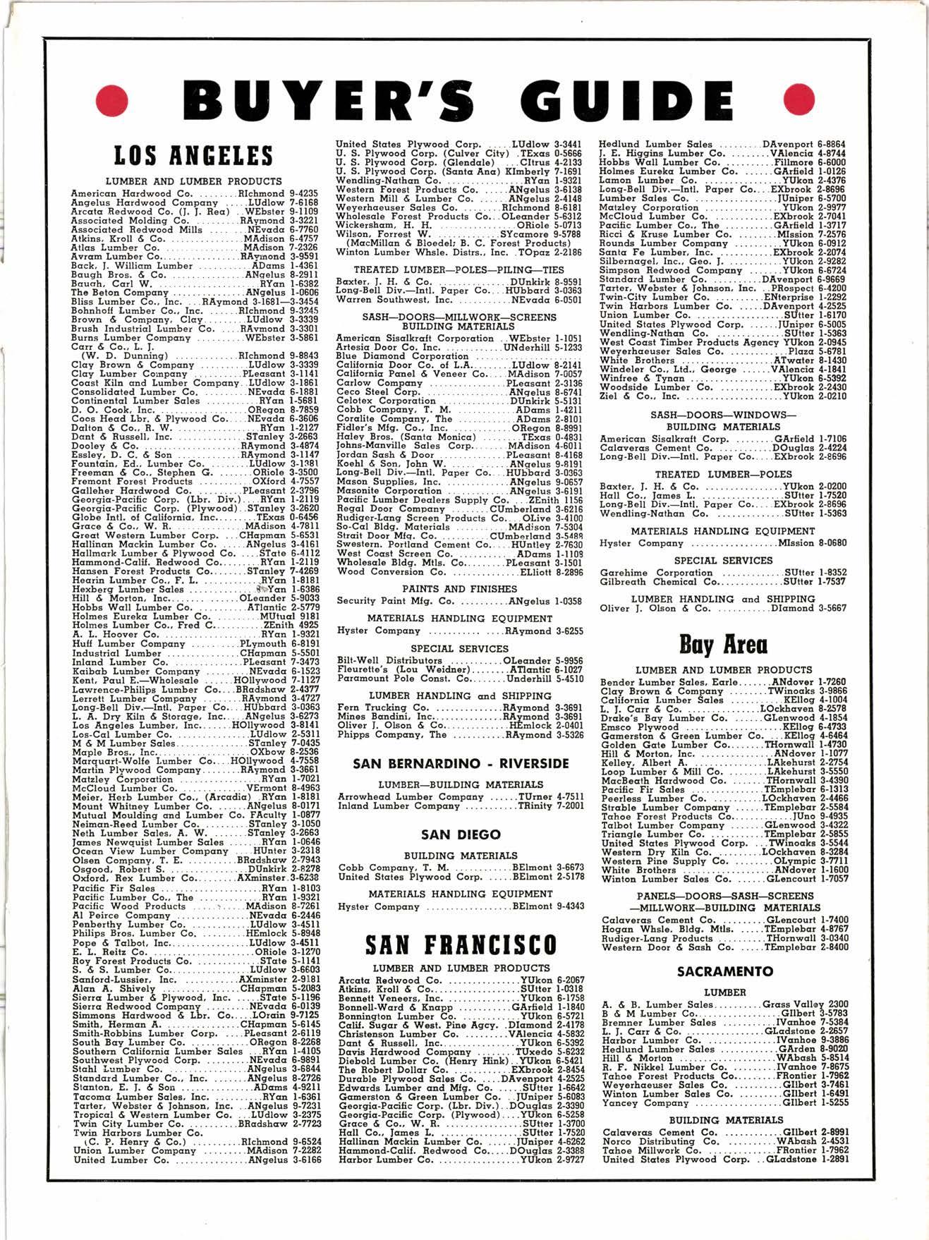 l-6386 Hill d Mortoa, Iuc....... ......Olecnder 5-9033 Hobbg Wall Lumber Co. .ATlantic 2-529 Holmes Eurekc Lunber Co. .........MUtucI 9l8l Holmes Lunber Co., Fred C...........ZEaith 4925 A. L. Hoover Co. .RYcn l-9321 Huff Lumber Conpcuy .Pl,ymouth 6-8191 Iudusiricl Lumber .. ....CHqpno 5-5501 Inland Luber Co. .Plecsani 7-3473 Kcibcb Lumber Compcay ..NEvcdc 6-1523 Keat, Poul E.-Wholescle .....HOllywood 7-1127 Lsrence-Philips LumbEr Co....BBcdshqw 2-4377 Lerrett Lumbei Conpcnv ........BAvmond l-4727 Long-Betl Div.-Iatl.-Pcier Co....HUbbcrd 3-0363 L. A. Dry Kiln G Storccre, Iuc.....ANsElus 3-6273 Los AnE6tes Lunber. Inc.......HOllywood 3-8ltll Los-Ccl Lumber Co. ......LUdtow 2-5311 M G M Lumber Scles... ...STcnley 7-0435 Mcple Bros.. Iuc...... .....OXbow 8-2536 Mciaucrt-Wotle Lumbcr Co....HOllvwood 4-7558 Mcrtiu Ptywood Compoy. .BA-ymond 3-3661 Mctzley iorporclion -. ...... ..RYan l-7021 McCloud Lumber