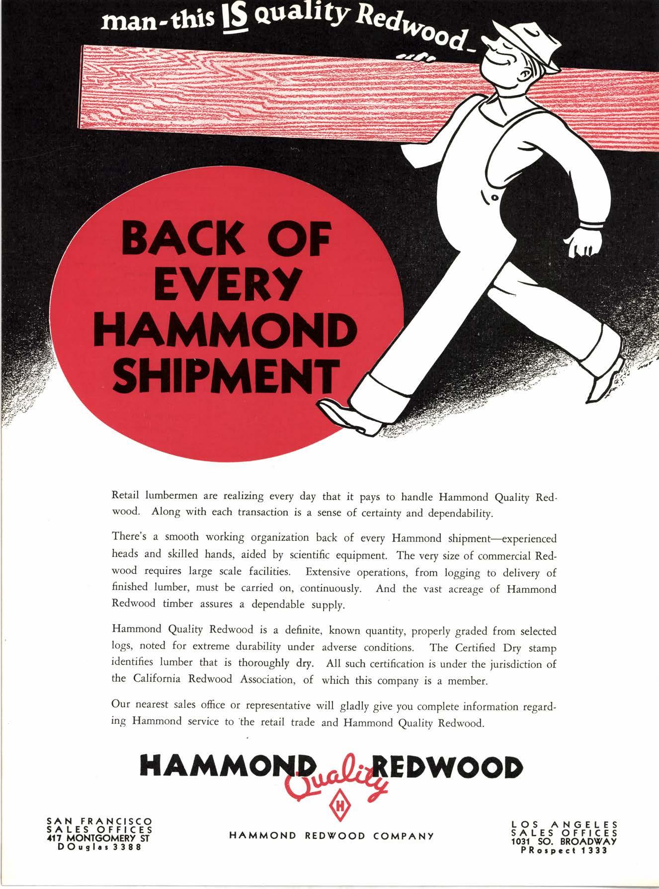There's a smooth working organization back of every Hammond shipment-experienced heads and skilled hands, aided by scientific equipment. The very size of commercial Redwood requires large scale facilities. Extensive operations, from logging to delivery of finished lumber, must be carried on, continuously. And the vast acreage of Hammond Redwood timber assures a dependable supply.