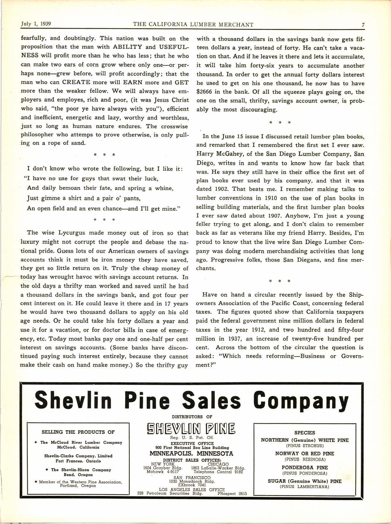 In the June 15 issue I discussed. retail lumber plan books, and remarked that I remembered the first set I ever saw. Harry McGahey, of the San Diego Lumber Company, San Diego, writes in and wants to know how far back that was. He says they still have in their office the first set of plan books ever used by his company, and that it was dated 1902. That beats me. I remember making talks to lumber conventions in 1910 on the use of plan books in selling building materials, and the first lumber plan books I ever saw dated about 1907. Anyhow, I'm just a young feller trying to get along, and I don't claim to remember back as far as veterans like my friend Harry. Besides, I'm proud to know that the live wire San Diego Lumber Company was doing modern merchandising activities that long ago. Progressive folks, those San Diegans, and fine merchants.