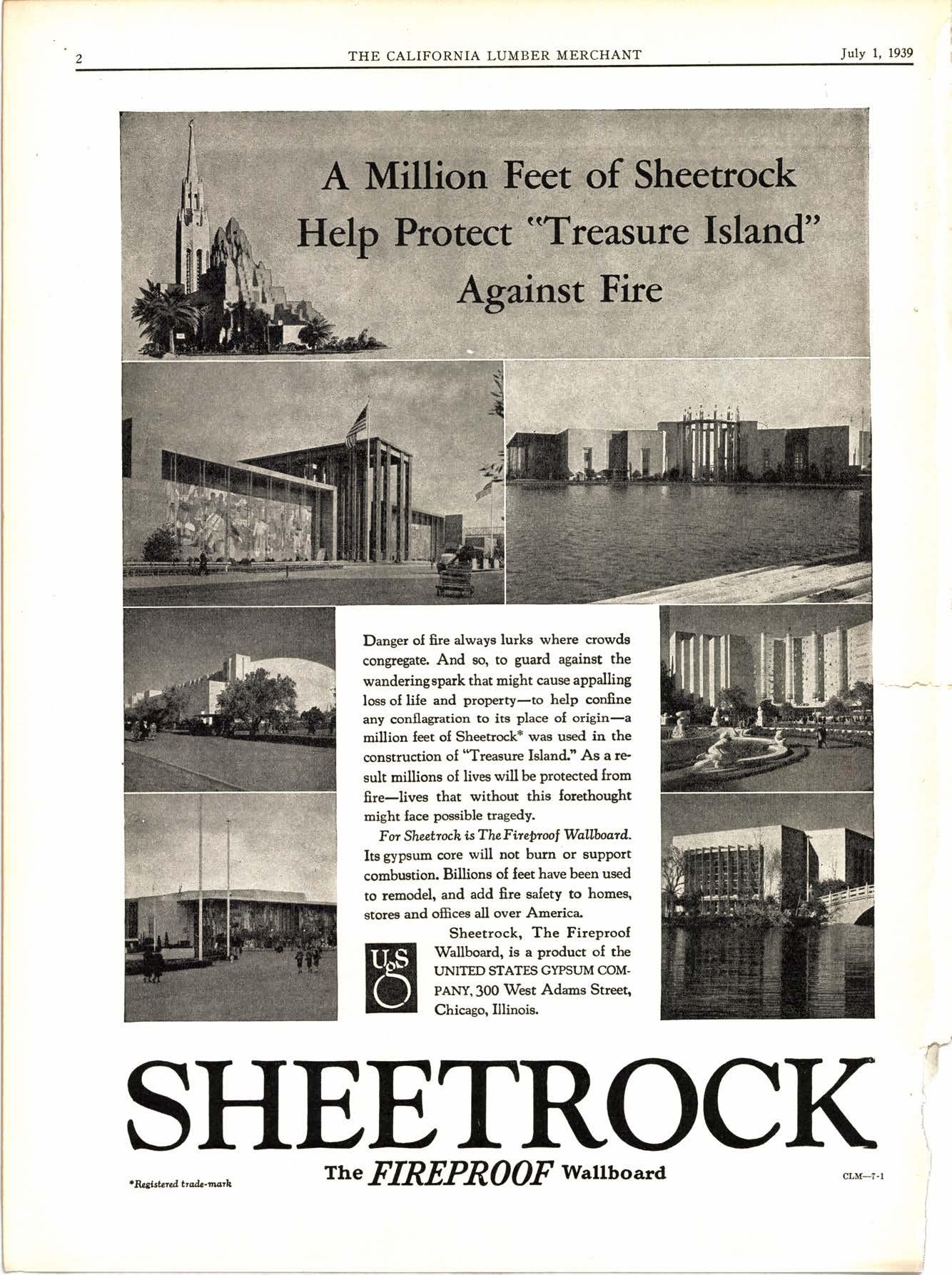 Danger oI fue always lurks where ctowde con$egate. And so, to guard agaiast the wanderingspark that might cause appalling loss of life and property-to help confine any conflagration to ite place oI origin-a million leet oI Sheetrock* was used in the construction oI 'lfreasure Island.'As a re' sult millions oI lives will be protectd from ffre-livee that without this forethought might face possible uagedy.