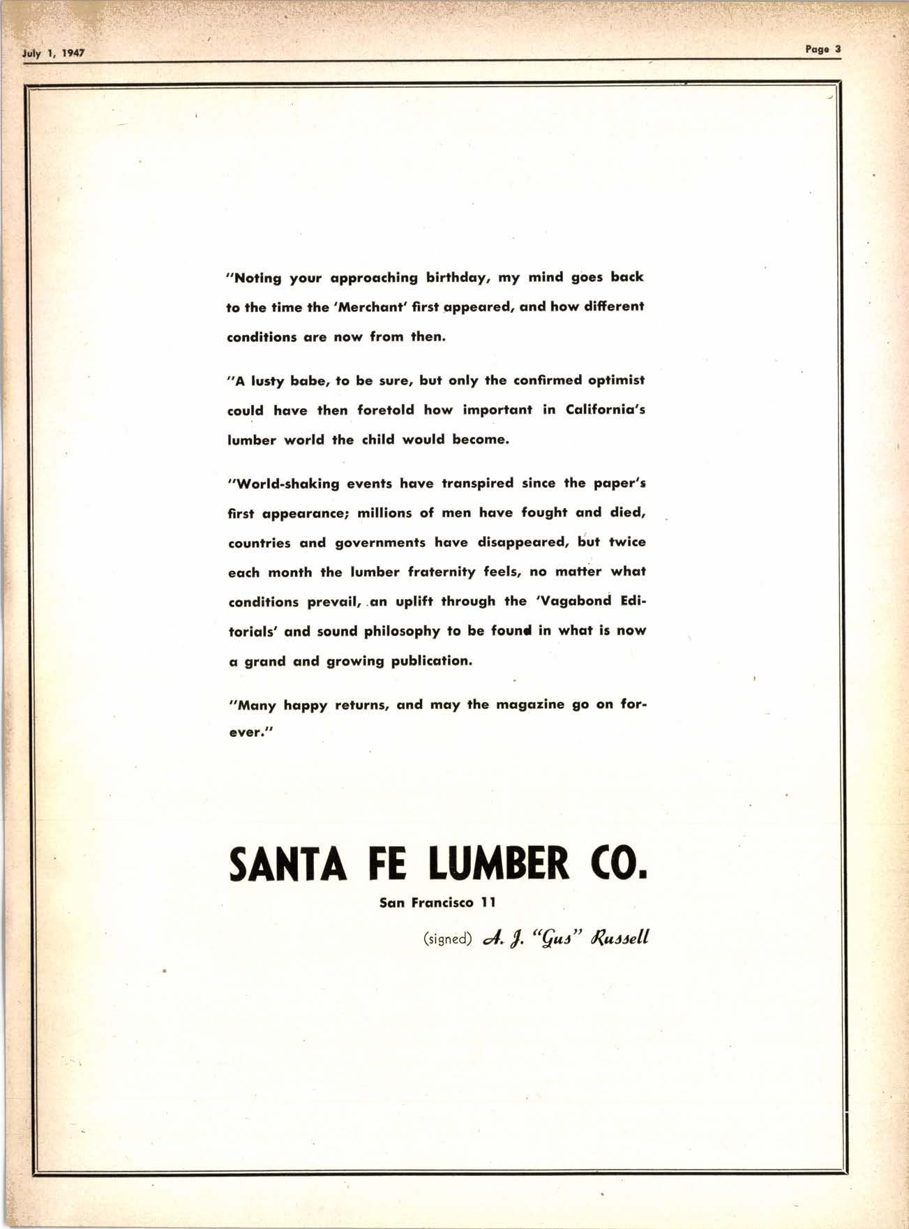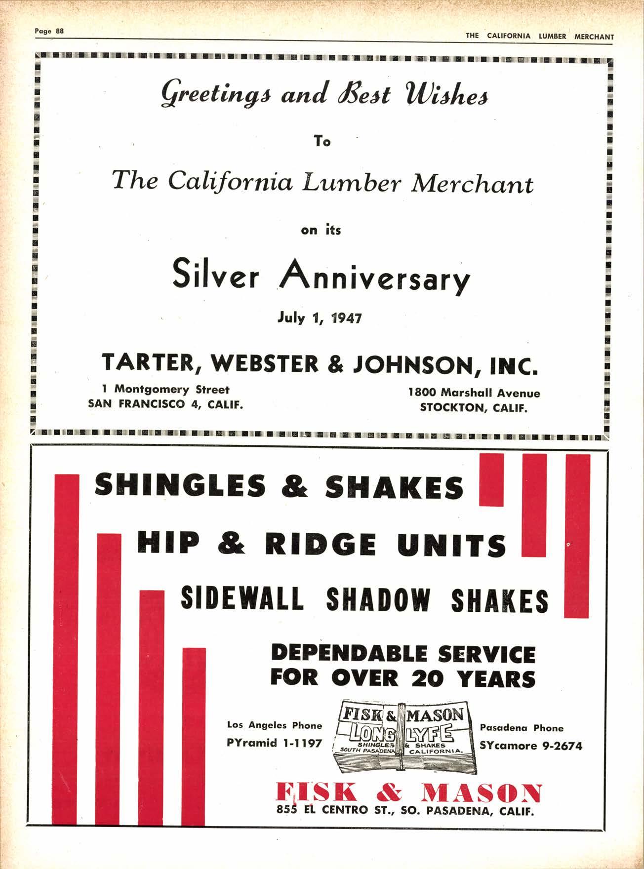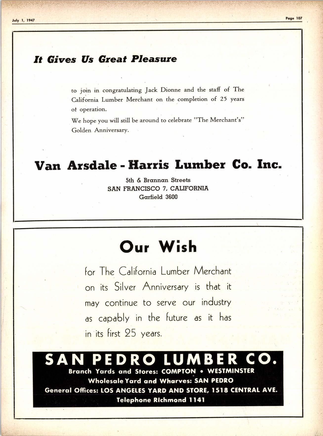 "\Me, at White Brothers, want to take this opportunity of congratulating you and THE CALIFORNIA LUMBER MERCHANT on the occasion of your 25th Anniversary in July. To us, THE CALIFORNIA LUMBER MERCHANT is the FINEST TRADE MAGAZINE IN EXISTENCE. Its news keeps us posted on our good customers and personal friends throughout California, and as an advertising medium we believe it has no peer. It is avidly read from cover to cover by most of your subscribers.