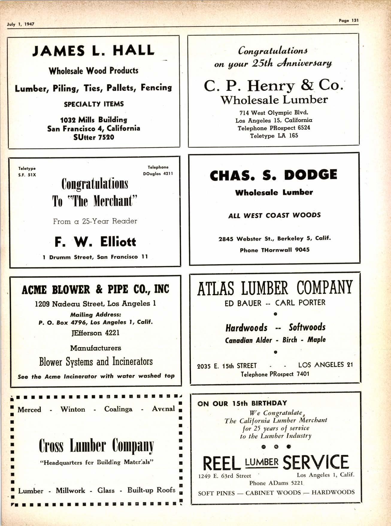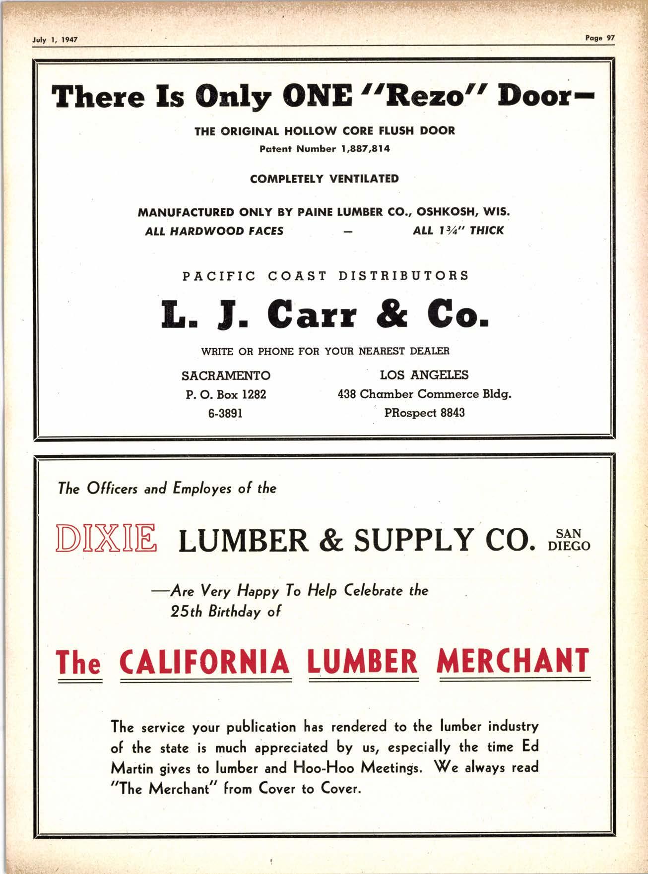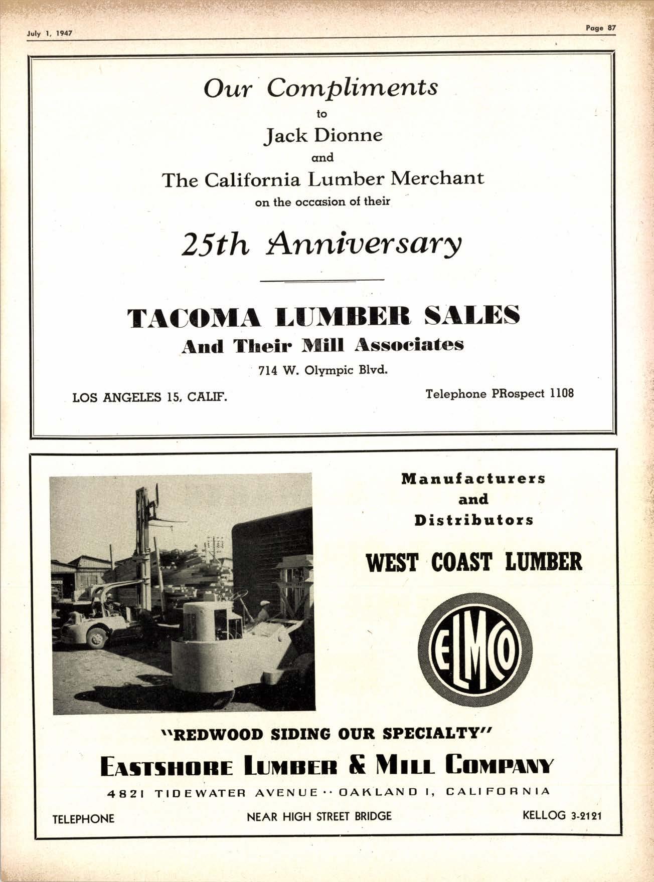 "\Me, at White Brothers, want to take this opportunity of congratulating you and THE CALIFORNIA LUMBER MERCHANT on the occasion of your 25th Anniversary in July. To us, THE CALIFORNIA LUMBER MERCHANT is the FINEST TRADE MAGAZINE IN EXISTENCE. Its news keeps us posted on our good customers and personal friends throughout California, and as an advertising medium we believe it has no peer. It is avidly read from cover to cover by most of your subscribers.