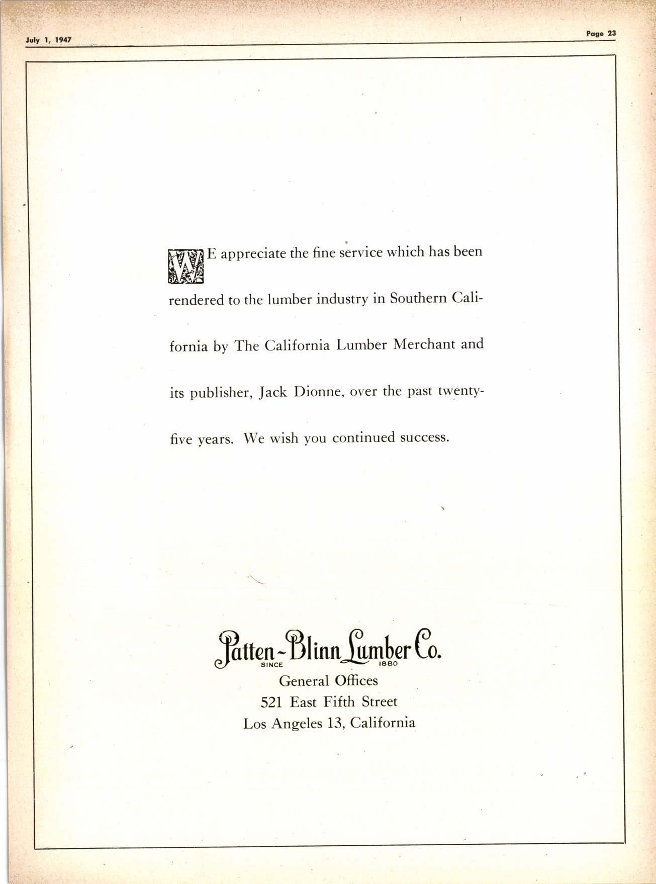 Under the.title "We're Saying Howdy,,, there appeared in the first issue of THE CALIFORNIA LUMBER MERCHANT ever printed, July first, 1922, my first editorial addressed to the lumber people of California. It scarcely seems possible-to use a worn old platitude-that it was 25 years ago that I sat here at this same desk and type- writer I am using now, to type my first remarks to the great California lumber audience. But the calendar is not to be contradicted. And the calendar says that this really IS July first,' 1947, and that we really started this journal 25 years ago.
