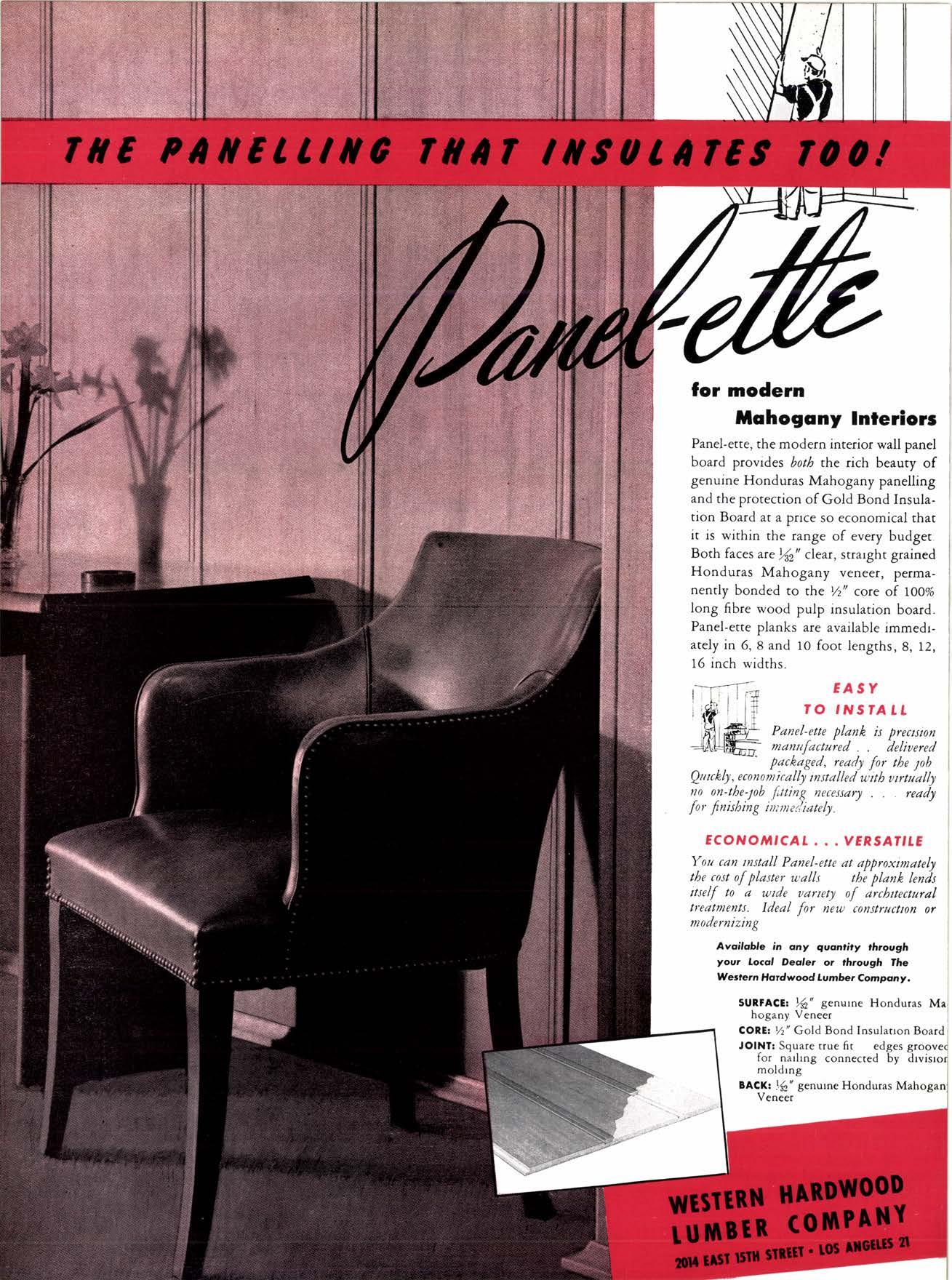 Panel-ette, the modern interior wall panel board provides botb the rich beauty of genuine Honduras Mahogany panelling and the protection of Gold Bond Insulation Board at a pnce so economical that it is within rhe range of every budget Both faces arct/s2" clear, straight grained Honduras Mahogany veneer, permanently bonded to rhe Yz" core of too% long fibre wood pulp insulation board. Panel-ette planks are available immedrately in 6, 8 and 10 foot lengrhs, 8, 12, 16 inch widths.
