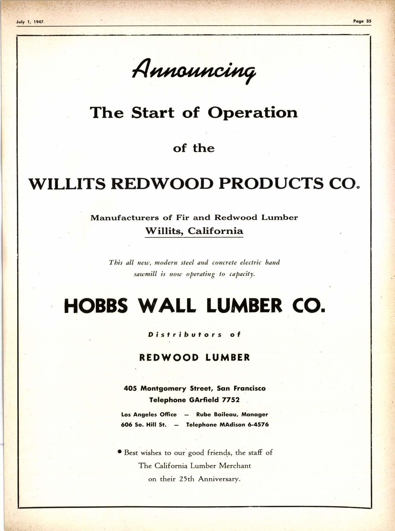 I am going to quote freely from that first editorial, because there f stated clearly the reasons why I decided to create a California lumber journal, and the aims, ambitions and intentions of the new sheet; Judge for yourself, friends, whether or not this journal has lived up to its original promises to this industry.'There was at that time no lumber publication in California. There had been one published by one Guy Buell in San Francisco years before, but it had died with its. publisher, if I remember rightly. And when f came to California in lg?l and spent some time looking over the field, it peemed to me that here was a priceless opportunity for a regional lumber journal, because f sensed at a glance that California is in reality a lumber empire all by itself, separated in various fashions from the rest of the lumber industry of the country. And I likewise correctly guessed that a mighty building boom was headed for this area-