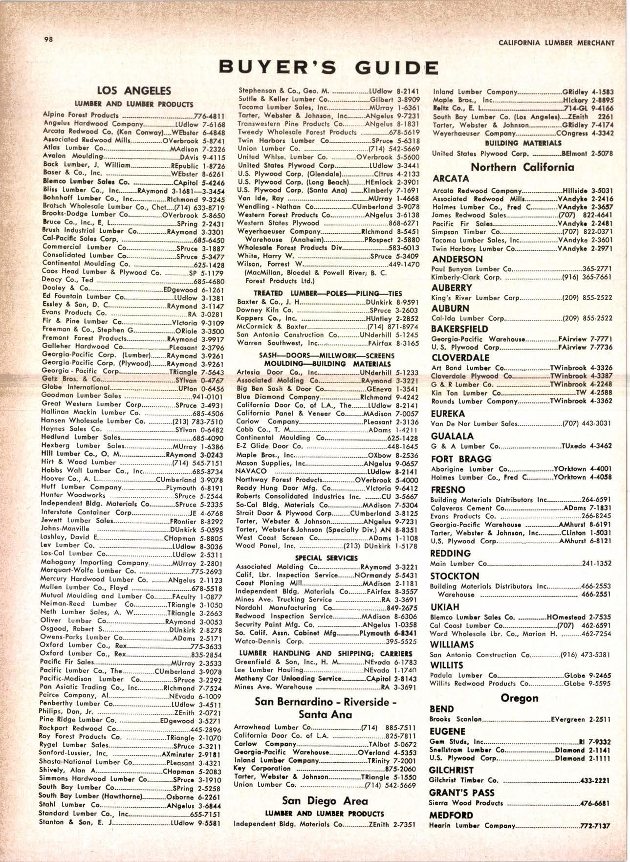 & Supply Co. -lAndrcopc 5'100O Holmes, Fred C. ----------------.---.-------KEllog 3'5326 K-D Cedor Supply Co.------------..--.-.-------EtSin 7-1063 Kellcy, Albcrt A..------..------------.-..--.-.LAkehursl 2'2754 Kilgorc, Robcrl P..------------...-.-.....--.GIcnwood 6-0831 Loop lumbcr & Mill Co.--.-.----.---.--.-LAkchurst 3-5550 l'locBeolh Hordwood Co.---.--...---.-..THornwoll 3-4390 Marsholl Shinglc Co.--------------..--..----[Ucernc l-700O McKinney Hordwood Co.-------.-.-----.-----...----.fO 8'1983 Pocific Fir Solcs ------------------.-DAvenporf 6-8864 Podulo lunber Co,, E. A.------.----------.OIford 7-6481 Pccrf crs Lumber Co..-.-.-.---.-----------lOckh avan 2-77OO Sowmif l Sof cr Co. ......-------- -----------'-"6t7'&3' Slqndqrd Lumber Compony--------------[Andscope 6'6356 Stroblo Lunbcr Conpony-----------..TEnrpdbor 2J5E4 Tortsr, Wcbsler & Johnron-------------SYconorr 7'2351 f riongf c Lunbcr Co.--...---------------t'Andrcopc 1'95?l Twin Harbors Lunbcr Co.-----------DAvcnport 4'2525 U.S. Pltnrood Corp. lOoktondt--------IWinookr 3'5544 U.S. Plynvood CorP. (Sonto Clorot--..---CHcru 3'|4t6Wcrlcrn Pinc Supply Co.----------.---..-"Olyrnpic 3-7711 Whilc Brothers--..--.-----.-.---..-----....---ANdovcr l'l 600 Woodsidc [umbcr Co'--.---------"""""'Dlornond 3-56'14 PANETSJOOTS-3ASH-3CTEN5 MIIIWORK_IUITDINO NATEltATs Artesio Door Co., lnc. (Son Josc)---------...-'-Gt 6{098 Building Motcriof s Dislribrtor lnc.----.-.-.-""295'37 1l' Colsvcior Ccncnt Co.---------------.-Glcncourl l'740O Cobb Co., T. t-"---------- "Ll 5-7297 A{orsholl ihinglc Co. LUccrnc l'700O forfer, Wcbrtcr & Johnron----------------SYconorc 7-2351 Western Door & Sosh Co. --------------Templcbor 2-840O SACRAMENTO AREA LUilBER Evons Producls Go. ------------------- -"'-"""" ""'- "166'1523' Hcdlund Lumbcr Solor---------------------GArdcn 8-9O20 Hilgins lumber Co.. J. E. ""927'2727 Kiii's River lumber Corp.-----"-----------.---(916) 155'721O Nik-kel [umber Co., R. F..-------------------lVonhoc 7'E675 Ploccrvillc lumbcr Co.....--.--.-------------NAtionol 2'3385 Stockton Box Co. ----.-..-"- -------'f64'8361 sUILDING 'YTAIERIALS Building Moleriols Dislributors Inc.----------------451 -2896 Buildin! Moleriols Distributors Inc.--------------466-2551 Coloveros Cement Co.----......--....-.----.--..Gllbcrl 2-8991 Gcorgio-Pocific Worehouse.....-.---------WAborh 2-9631 Lurnbcr Dcolcrs Moteriolt Co'--------..-WAbosh 5-2751 Notionol Whlsle. Bldg. Moleriols .----.WAbosh 2-901 I United Stolcr Plywood Corp'------------Gtodstone l-2891 Wcycrhocurcr Compony--------WAbcrh 2-9tl I YUkon l-l0ll Ponderoso & Sugur Pine Douglcs Fir White Fir Gedqr SPruce 3-4931 SPECIALIZING IN INDUSTRIAL CRATING MATERIALS Custom Milling , lndustriol Cuf Stock Decking Stqrfer Boords WAfnut 3-1264 Q**'l/i,/notnrn Ju*[n, Corporetiont 8713 Clero SFeet- Downey, Coliforniq LCL & Direct llill Shipments l.,qr,' ":-rr .t:; THE WORLD'S BEST \MOOD PRESERVATIVES Comply with Federal Specification TT-W-572 COPPER]IATE "250N' Type ll, ComP. B KEIIITE II9'' Type ll, Comp. A .k: