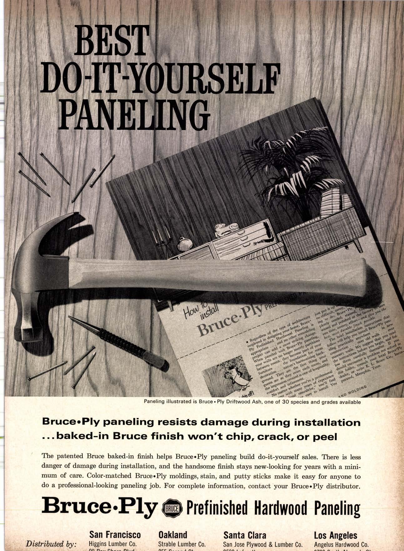 Los Angeles Angelus Hardwood Co. Bruee.Ply @ Prefinished Hardwood Paneling San Francisco Hrggins Lumber Co. 0akland Strable Lumber Co. Santa Clara San Jose Plywood & Lurnber Co Distributed fu':