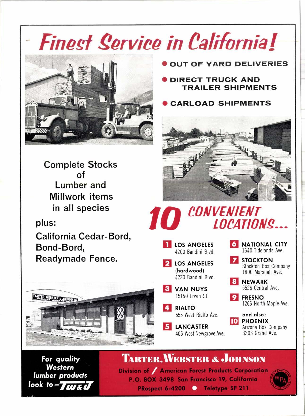 Stocks of Lumber and Millwork items in all species plus: California Cedar- Bord, Bond-Bord, Readymade Fence. rctonlSW[nn.. @ r.ranoNAt crrY 1640 Tidelands Ave. f,l srocKToN Stockton Box Company 1800 Marshall Ave. @ ruewnnr 5526 Central Ave. p rnrsNo 1266 North Maple Ave. ond olso: IO florNrx^ Anzona uox uompany 3203 Grand Ave. I ros ANGEIEs 4200 Bandini Blvd. pl ros ANGEIES (hordwood) 4230 Bandini Blvd. El var.r NUYS 15150 trwin St. I nntro 555 West Rialto Ave. fl raNcAsrER 405 West Newgrove Ave.