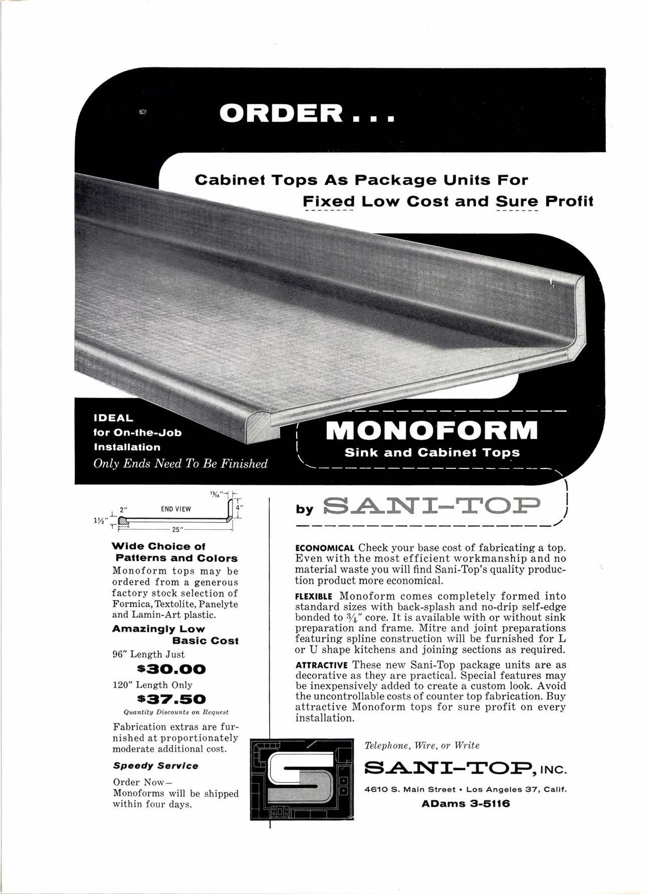 ArrRACllvE These new Sani-Top package units are as decorative as they are practical. Special features may be inexpensively added to create a custom look. Avoid the uncontrollable costs of counter top fabrication. Buy attractive Monoform tops for sure profit on every installation.