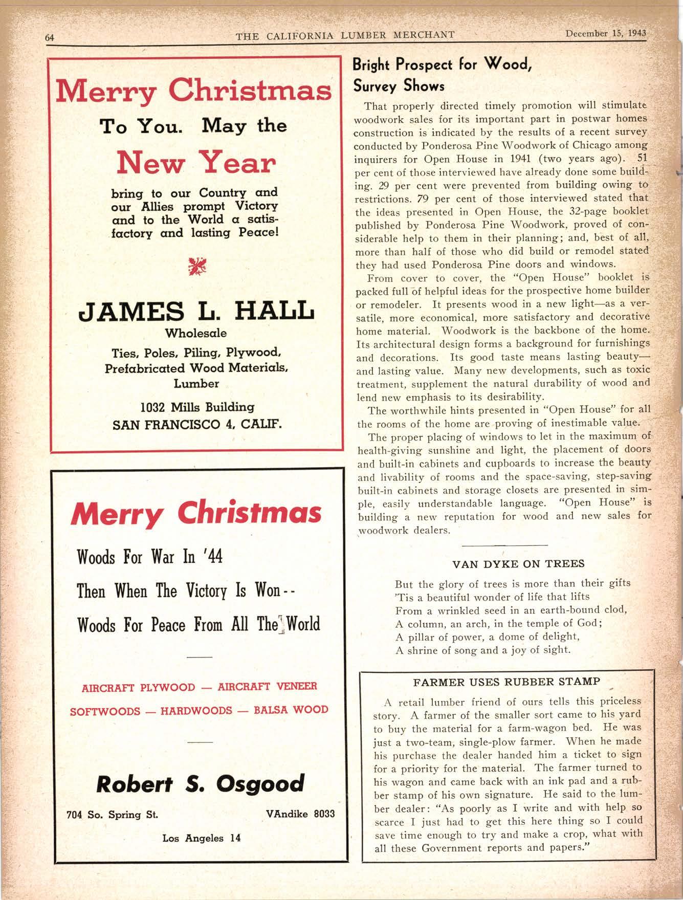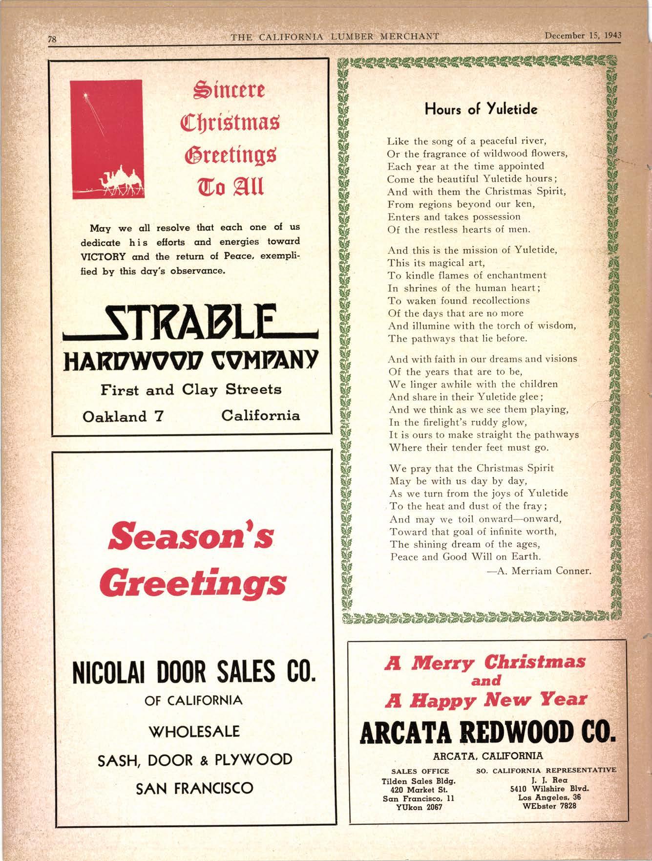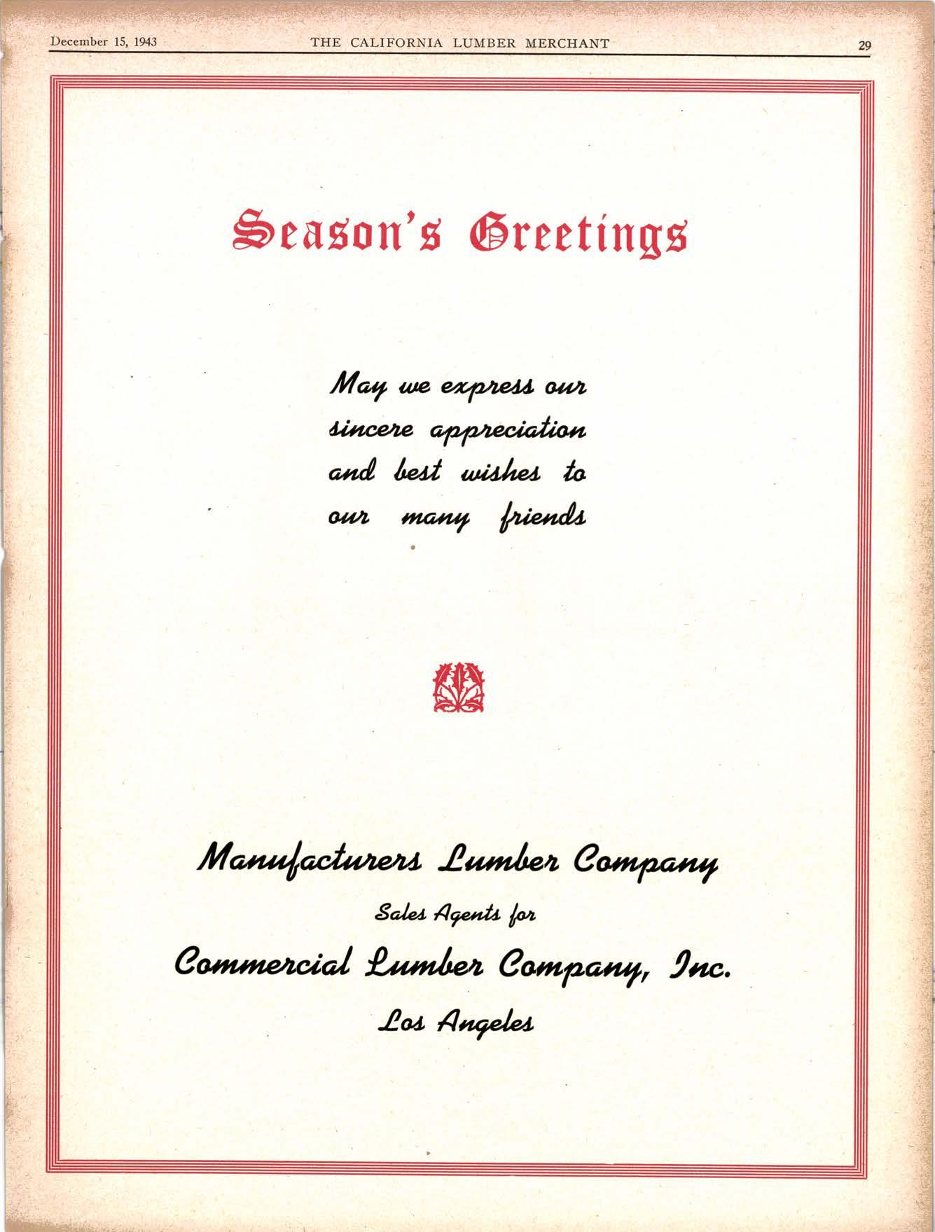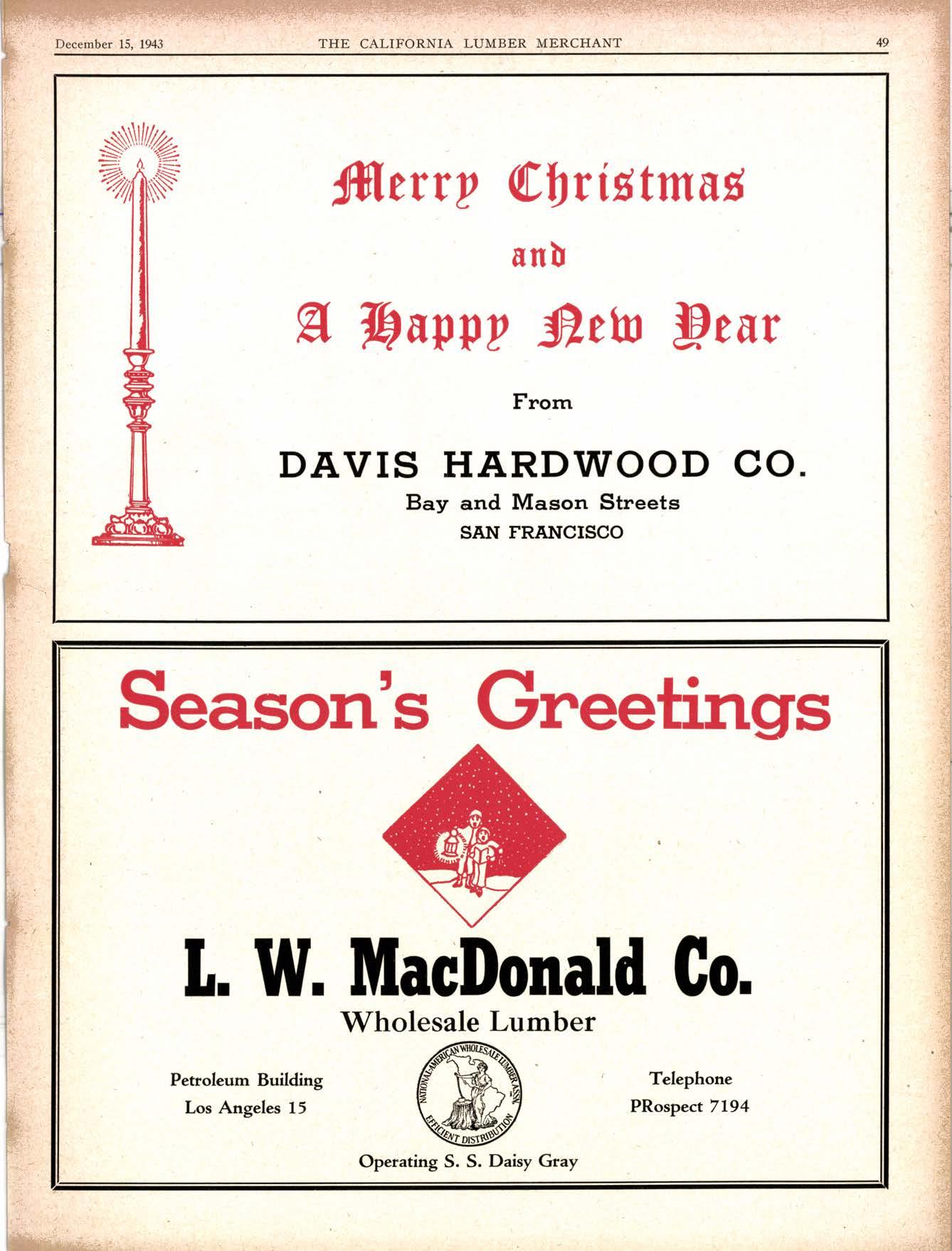 DecembeT i5, 1913 THD CALIFORNIA LUI{BER MERCHANT PAGIFIG MUTUAL DOOR GO. Wishes You Christrnas Greetings Best Wishes For 1944 Southern Colilorniq Sales OIIice: GLEN D. BESSONETTE Phone PRospect 9523 GARWOOD, N.J. OBGANIZATION Wcrrehouse: 1600 E. Wcrshington Blvd. LOS ANGELES 2I KANSAS CITY ST. PAUL W;il";ng Ou, griendt A MERRY GHRISTMAS A UIcTORIOi"i IIEw YEAR Uon Jrtloln -,Ka*it {u*6n, Co., ,bnr, sth & Brcrnncn Streets, Scn Francisco 7 r Jd"lidoy Qrnntingt AND BEST WISHES FOR THE NEW YEAR O'NEII.I I.UMBER GO, 16 Cclilornicr St. SAN FRANCISCO II GArlield 9ll0 507 Bonqnza Rd. tAS VEGAS Nevqda SEASON'S GREETINGS AND BEST IVISHES FOR ''44 CAL'IFORNIA PITYWOOD, Inc. VENEERS and PANETS united stctes Gypsum compcny's Insulqtion and Hardbocrds 1403 Filth Street OAKLAND Z, CALIF. Glencourr 96g9