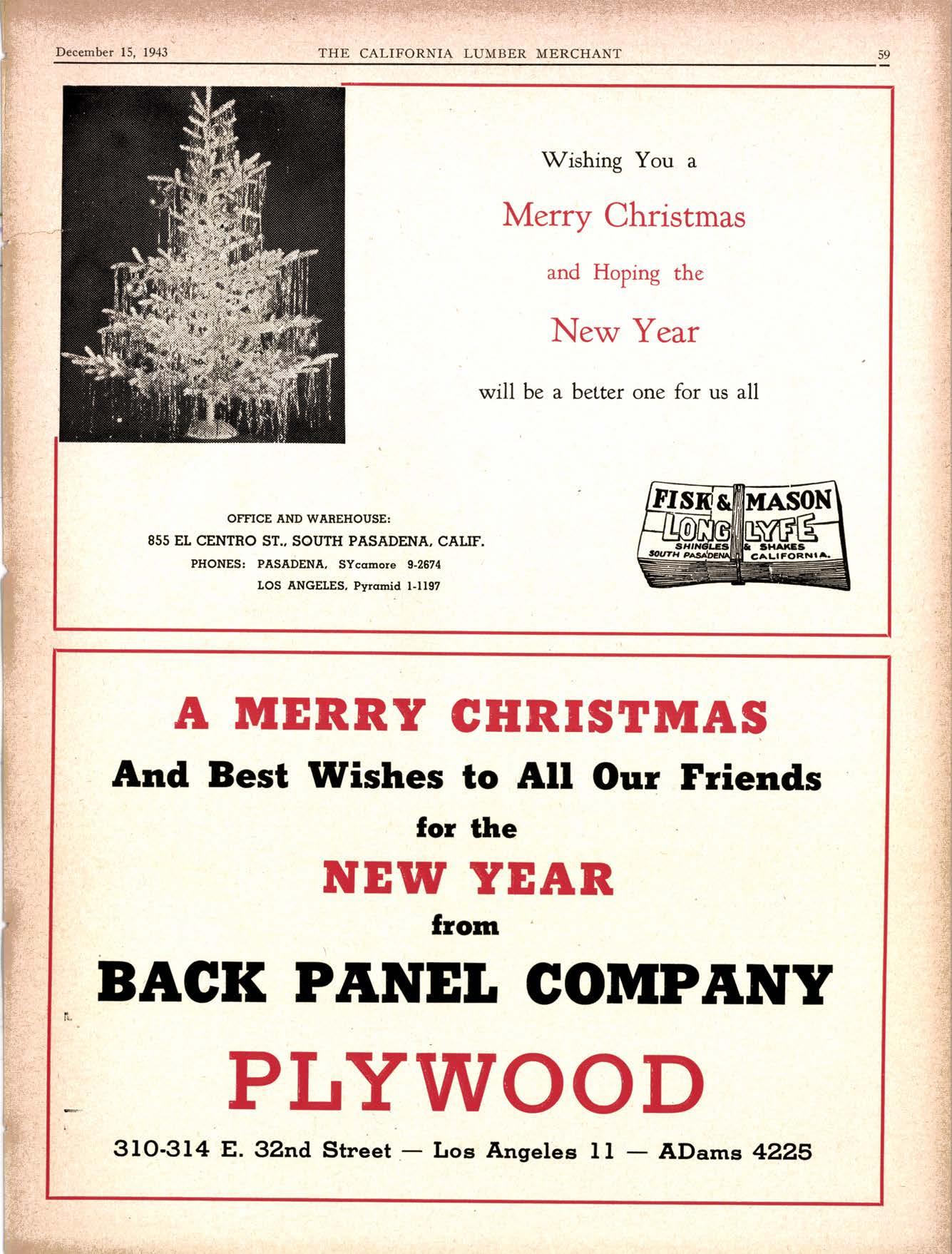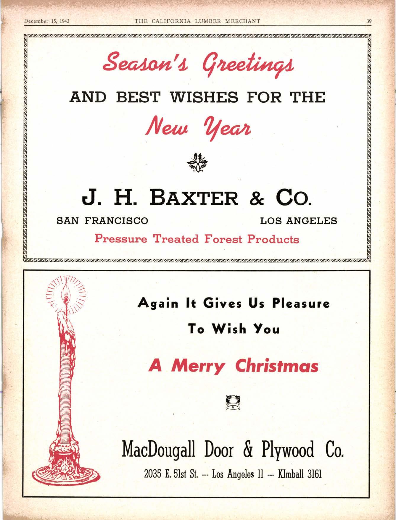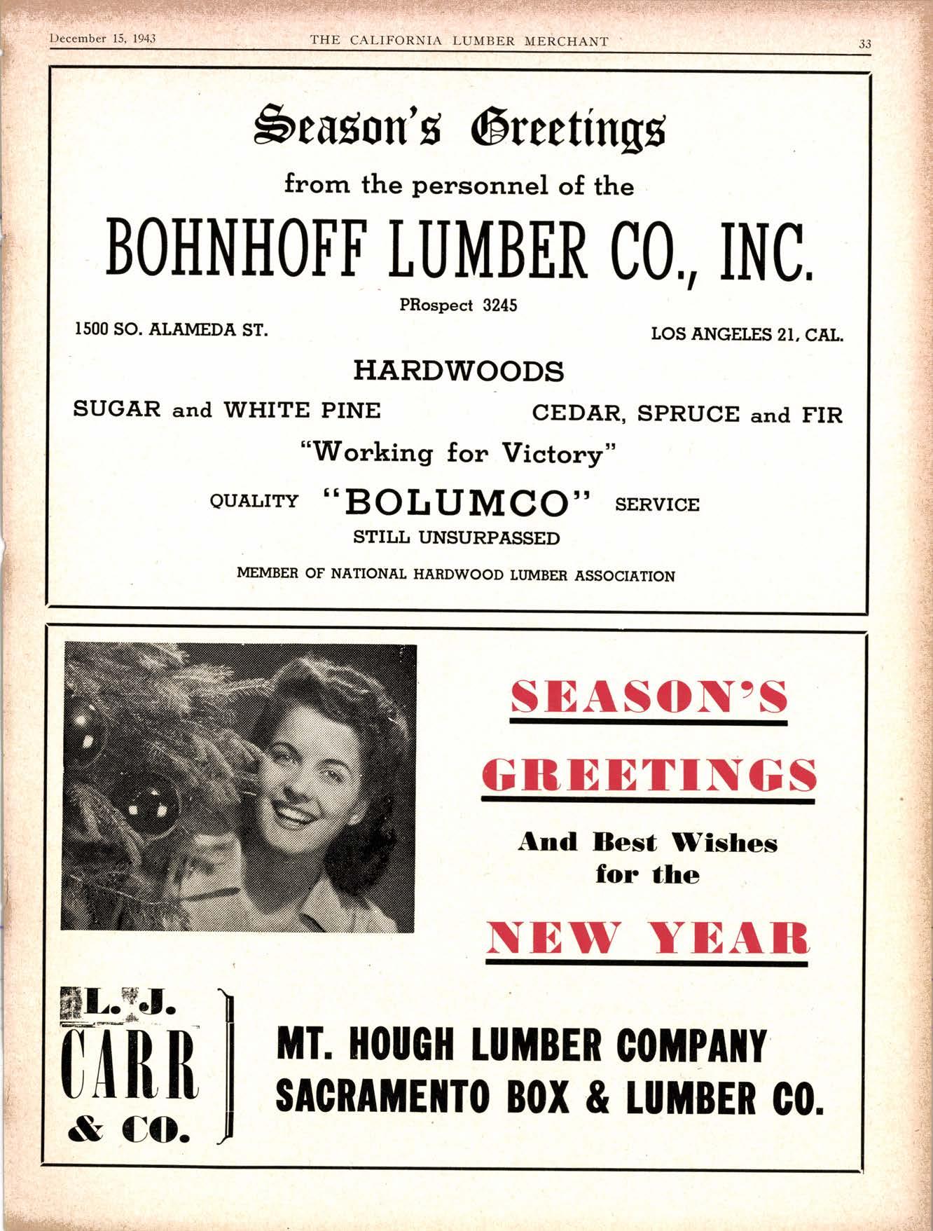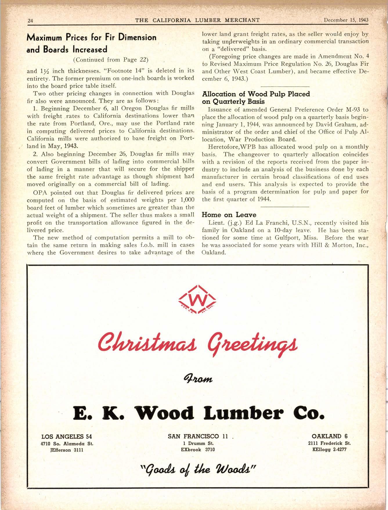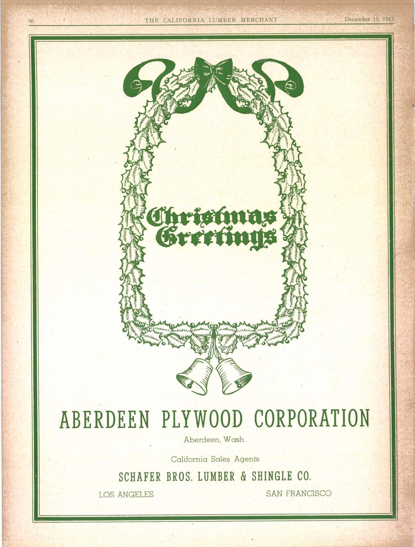 DecembeT i5, 1913 THD CALIFORNIA LUI{BER MERCHANT PAGIFIG MUTUAL DOOR GO. Wishes You Christrnas Greetings Best Wishes For 1944 Southern Colilorniq Sales OIIice: GLEN D. BESSONETTE Phone PRospect 9523 GARWOOD, N.J. OBGANIZATION Wcrrehouse: 1600 E. Wcrshington Blvd. LOS ANGELES 2I KANSAS CITY ST. PAUL W;il";ng Ou, griendt A MERRY GHRISTMAS A UIcTORIOi"i IIEw YEAR Uon Jrtloln -,Ka*it {u*6n, Co., ,bnr, sth & Brcrnncn Streets, Scn Francisco 7 r Jd"lidoy Qrnntingt AND BEST WISHES FOR THE NEW YEAR O'NEII.I I.UMBER GO, 16 Cclilornicr St. SAN FRANCISCO II GArlield 9ll0 507 Bonqnza Rd. tAS VEGAS Nevqda SEASON'S GREETINGS AND BEST IVISHES FOR ''44 CAL'IFORNIA PITYWOOD, Inc. VENEERS and PANETS united stctes Gypsum compcny's Insulqtion and Hardbocrds 1403 Filth Street OAKLAND Z, CALIF. Glencourr 96g9