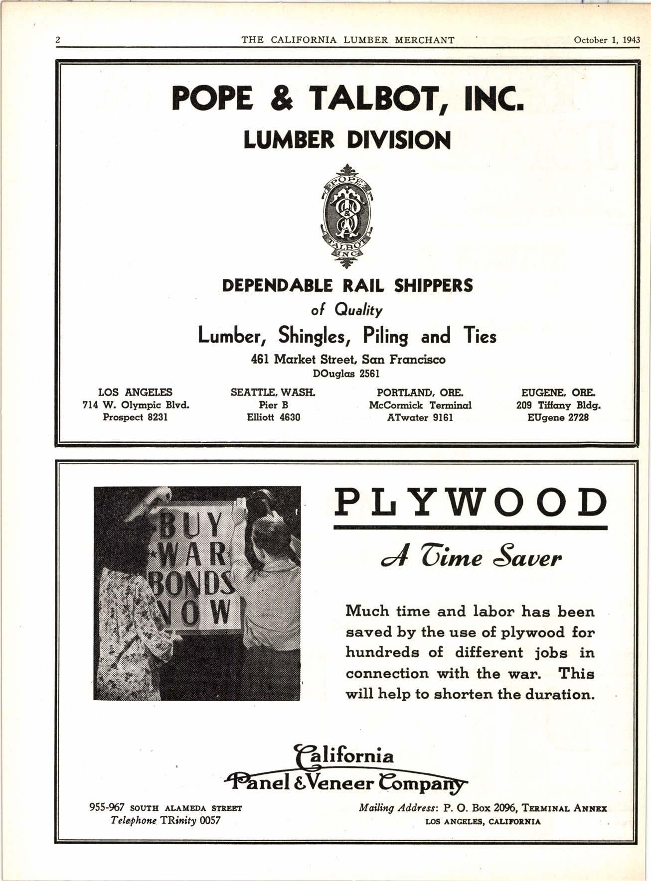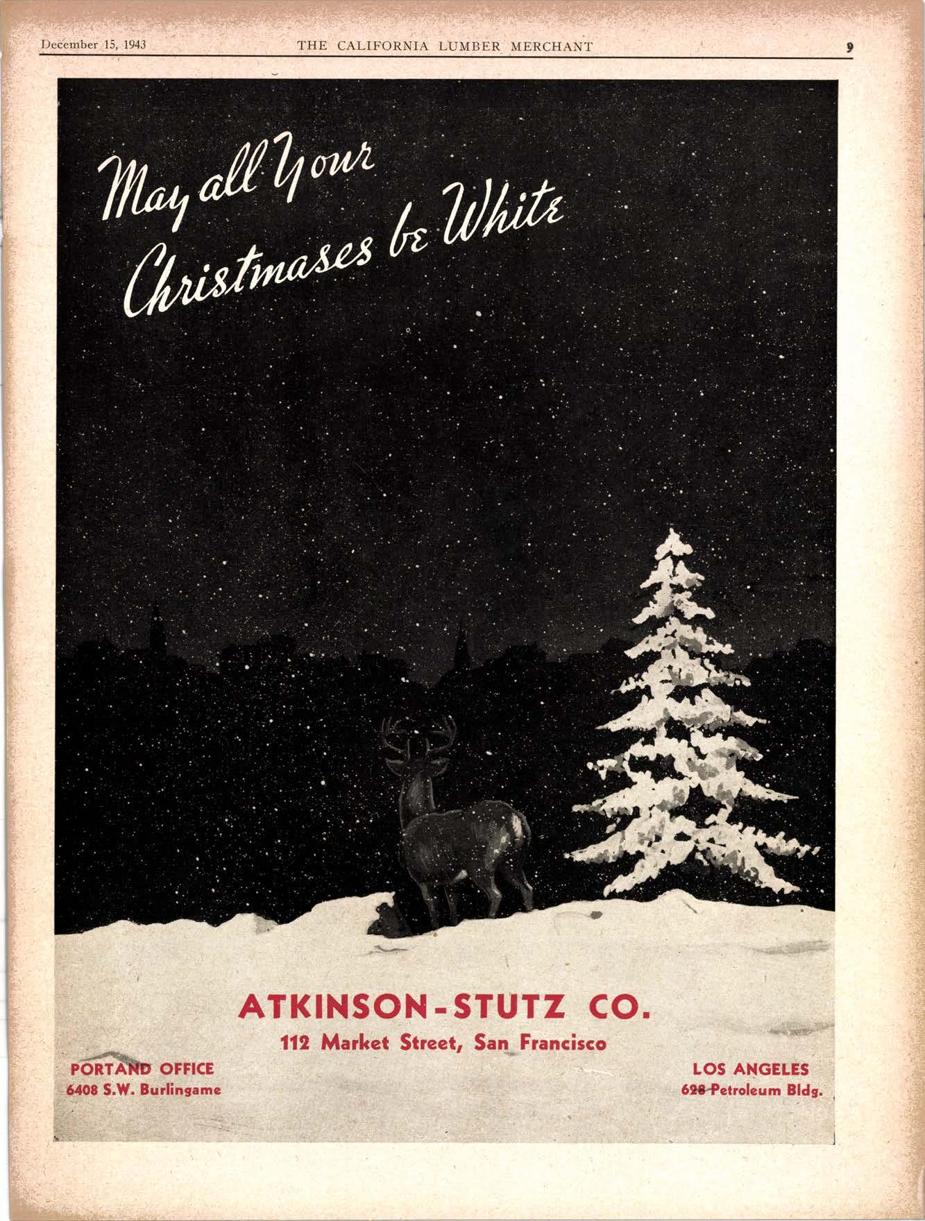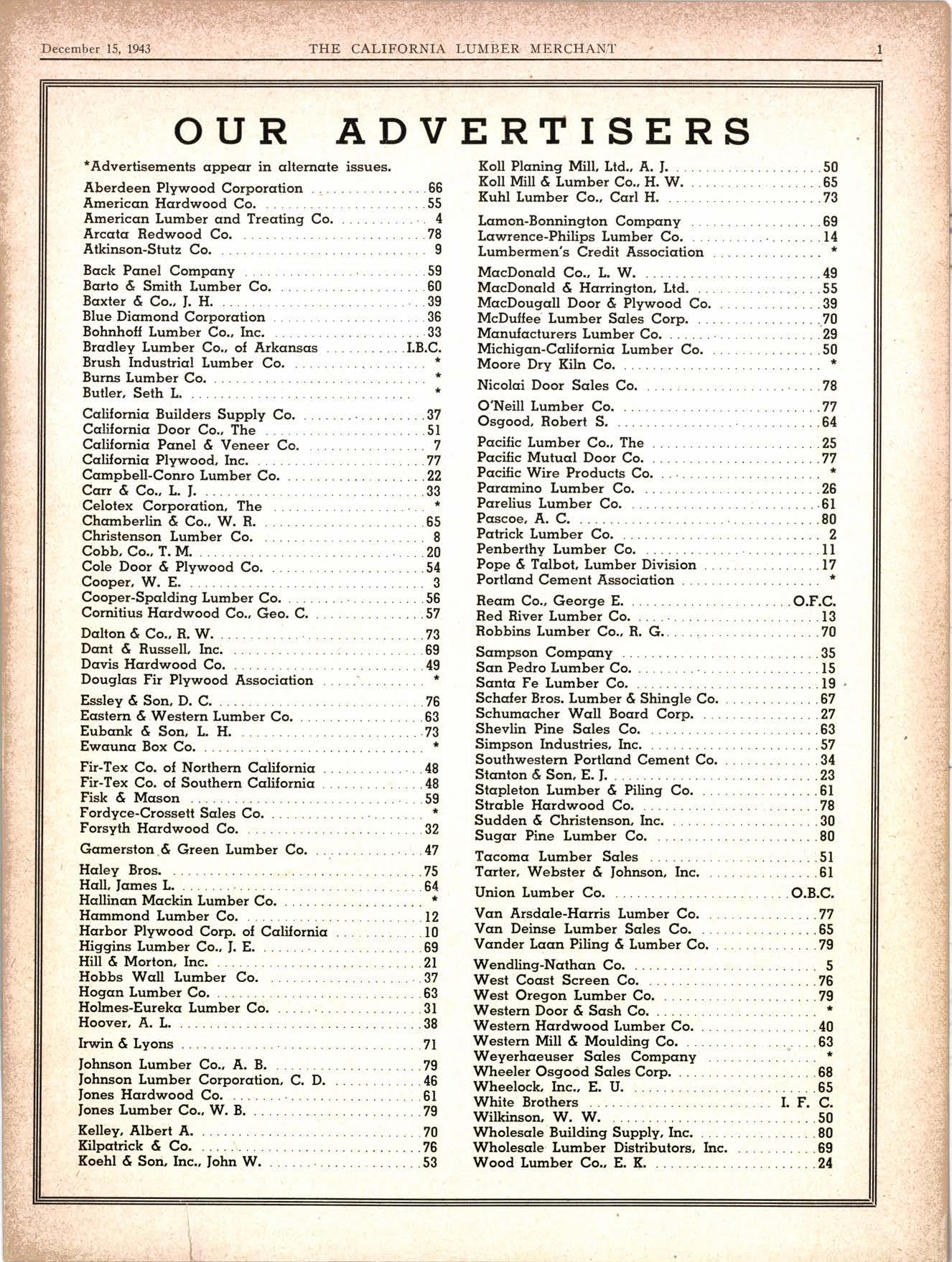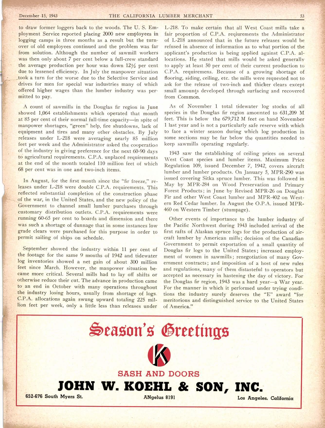 DecembeT i5, 1913 THD CALIFORNIA LUI{BER MERCHANT PAGIFIG MUTUAL DOOR GO. Wishes You Christrnas Greetings Best Wishes For 1944 Southern Colilorniq Sales OIIice: GLEN D. BESSONETTE Phone PRospect 9523 GARWOOD, N.J. OBGANIZATION Wcrrehouse: 1600 E. Wcrshington Blvd. LOS ANGELES 2I KANSAS CITY ST. PAUL W;il";ng Ou, griendt A MERRY GHRISTMAS A UIcTORIOi"i IIEw YEAR Uon Jrtloln -,Ka*it {u*6n, Co., ,bnr, sth & Brcrnncn Streets, Scn Francisco 7 r Jd"lidoy Qrnntingt AND BEST WISHES FOR THE NEW YEAR O'NEII.I I.UMBER GO, 16 Cclilornicr St. SAN FRANCISCO II GArlield 9ll0 507 Bonqnza Rd. tAS VEGAS Nevqda SEASON'S GREETINGS AND BEST IVISHES FOR ''44 CAL'IFORNIA PITYWOOD, Inc. VENEERS and PANETS united stctes Gypsum compcny's Insulqtion and Hardbocrds 1403 Filth Street OAKLAND Z, CALIF. Glencourr 96g9