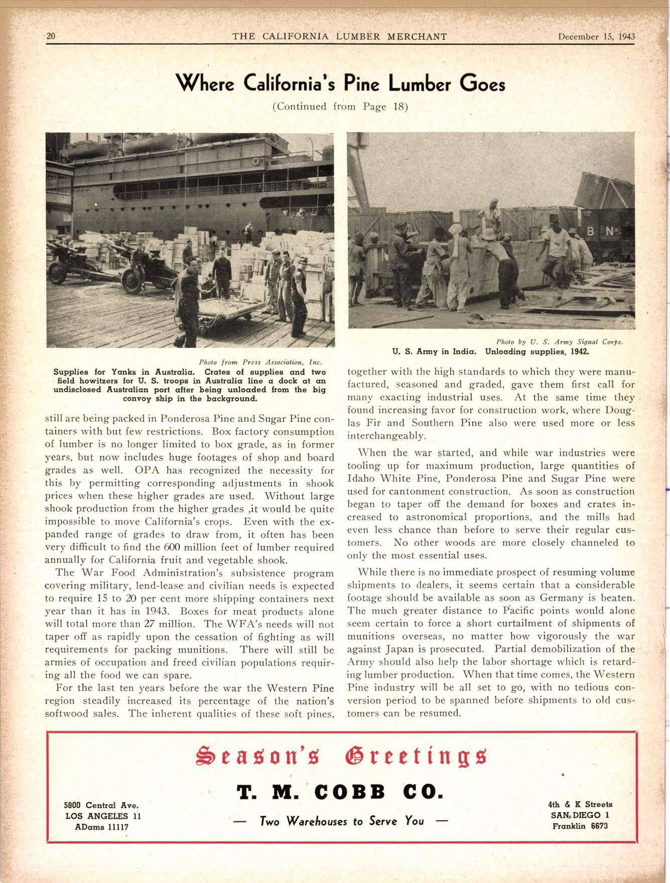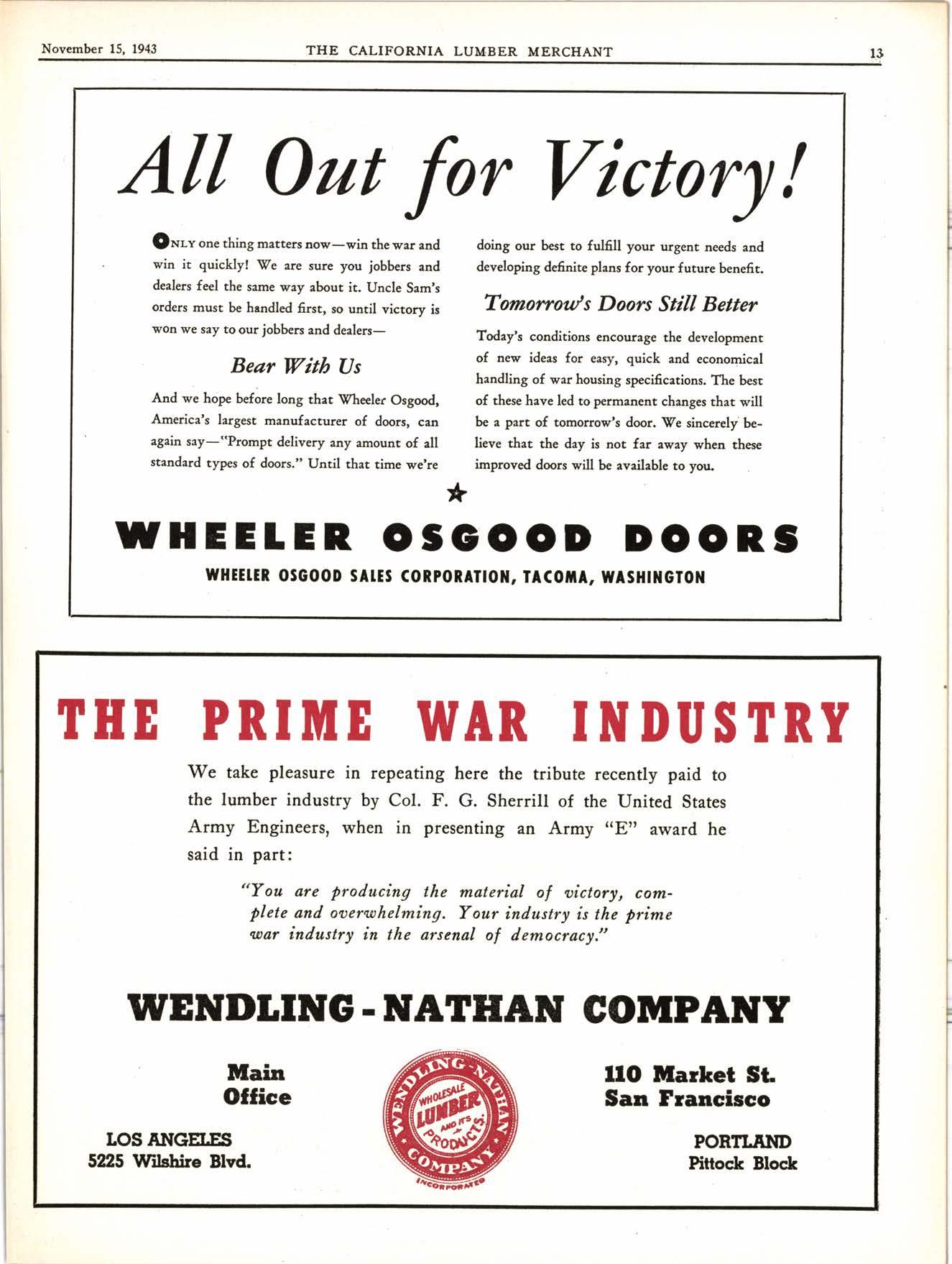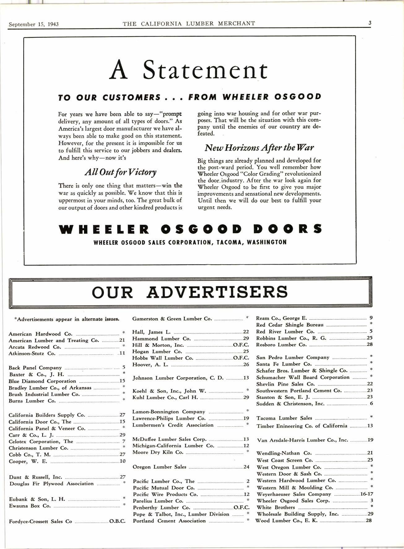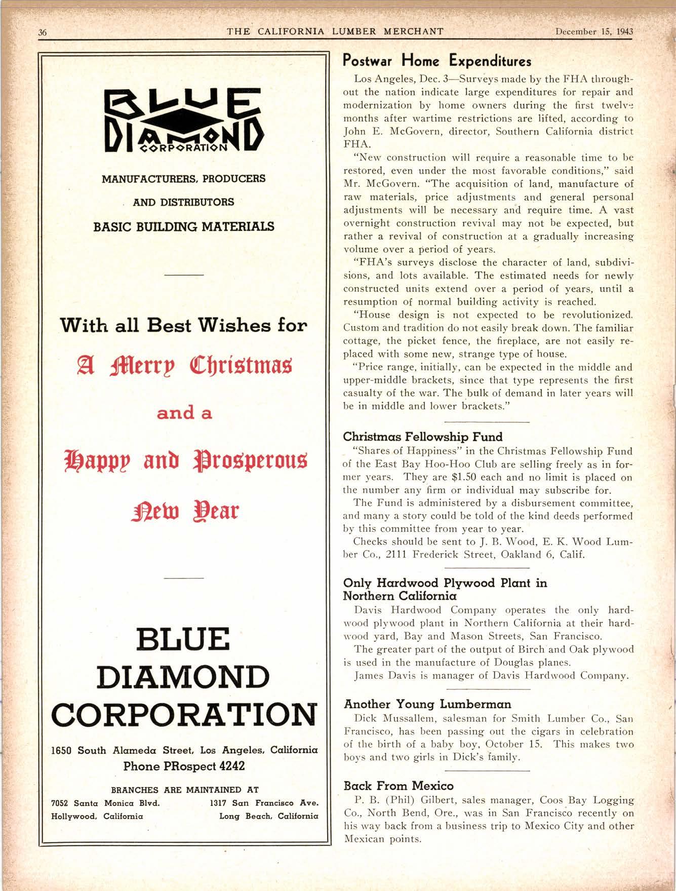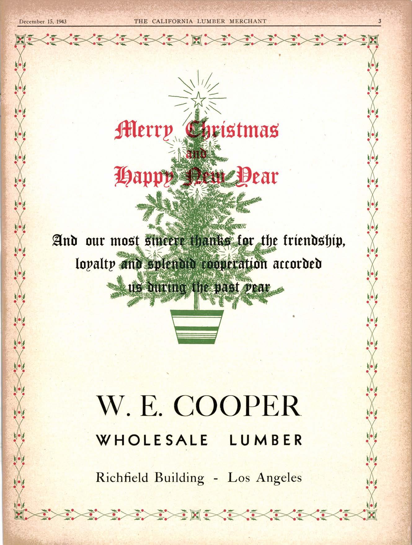 DecembeT i5, 1913 THD CALIFORNIA LUI{BER MERCHANT PAGIFIG MUTUAL DOOR GO. Wishes You Christrnas Greetings Best Wishes For 1944 Southern Colilorniq Sales OIIice: GLEN D. BESSONETTE Phone PRospect 9523 GARWOOD, N.J. OBGANIZATION Wcrrehouse: 1600 E. Wcrshington Blvd. LOS ANGELES 2I KANSAS CITY ST. PAUL W;il";ng Ou, griendt A MERRY GHRISTMAS A UIcTORIOi"i IIEw YEAR Uon Jrtloln -,Ka*it {u*6n, Co., ,bnr, sth & Brcrnncn Streets, Scn Francisco 7 r Jd"lidoy Qrnntingt AND BEST WISHES FOR THE NEW YEAR O'NEII.I I.UMBER GO, 16 Cclilornicr St. SAN FRANCISCO II GArlield 9ll0 507 Bonqnza Rd. tAS VEGAS Nevqda SEASON'S GREETINGS AND BEST IVISHES FOR ''44 CAL'IFORNIA PITYWOOD, Inc. VENEERS and PANETS united stctes Gypsum compcny's Insulqtion and Hardbocrds 1403 Filth Street OAKLAND Z, CALIF. Glencourr 96g9