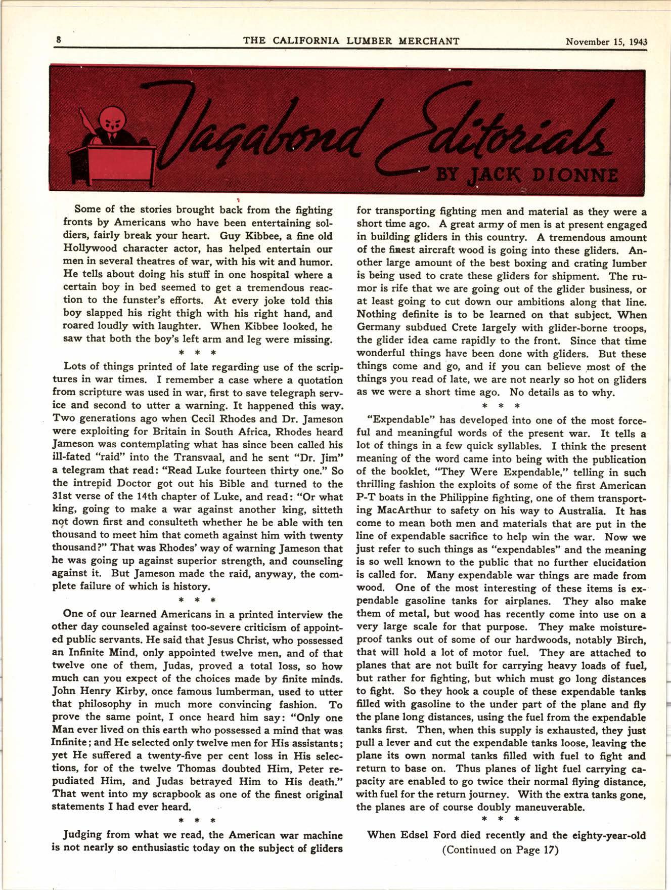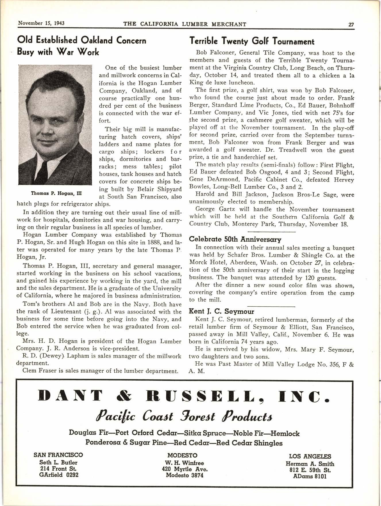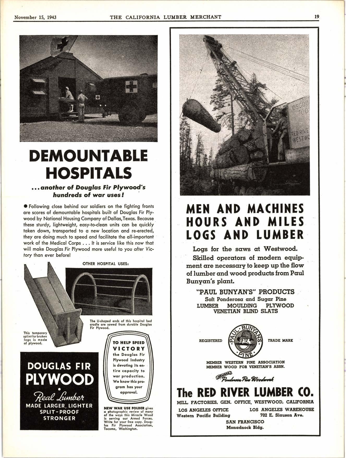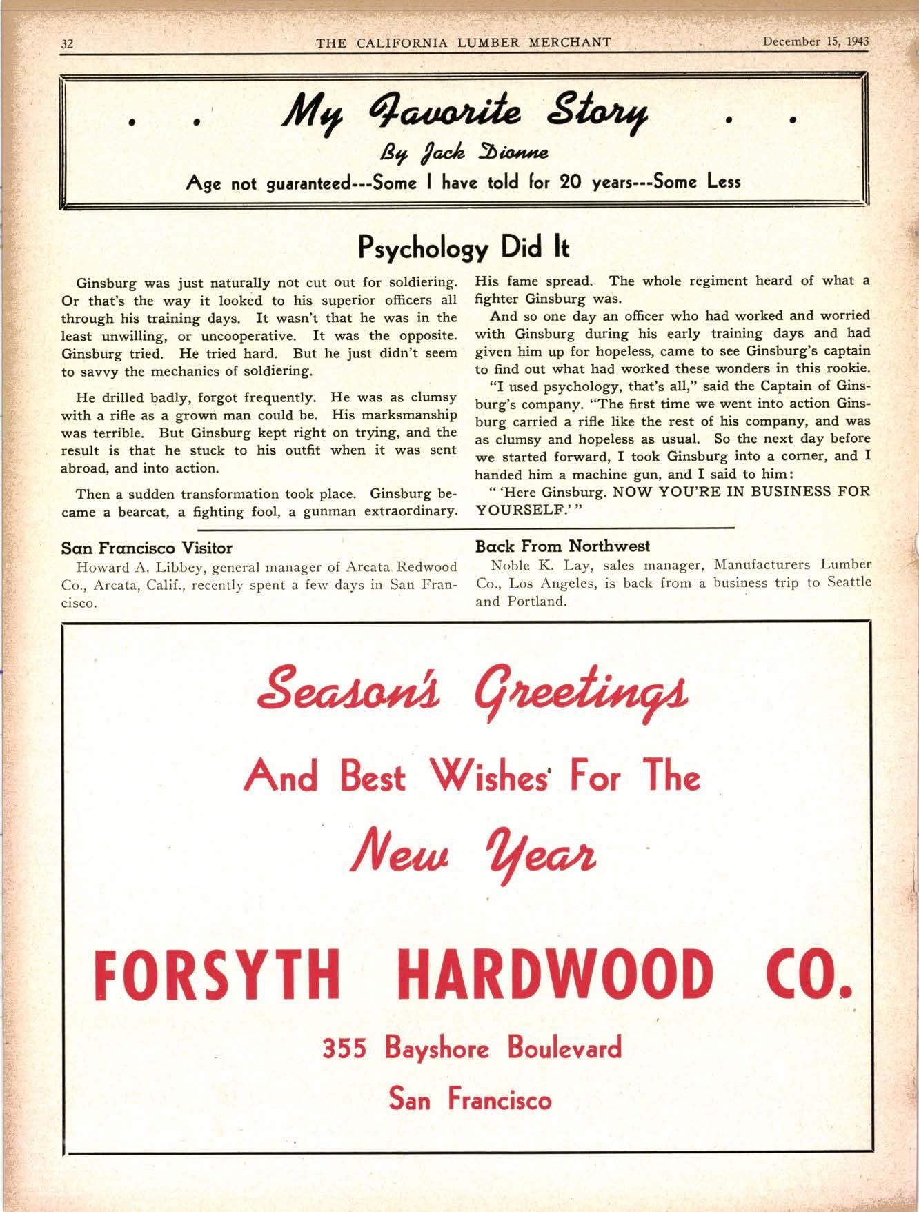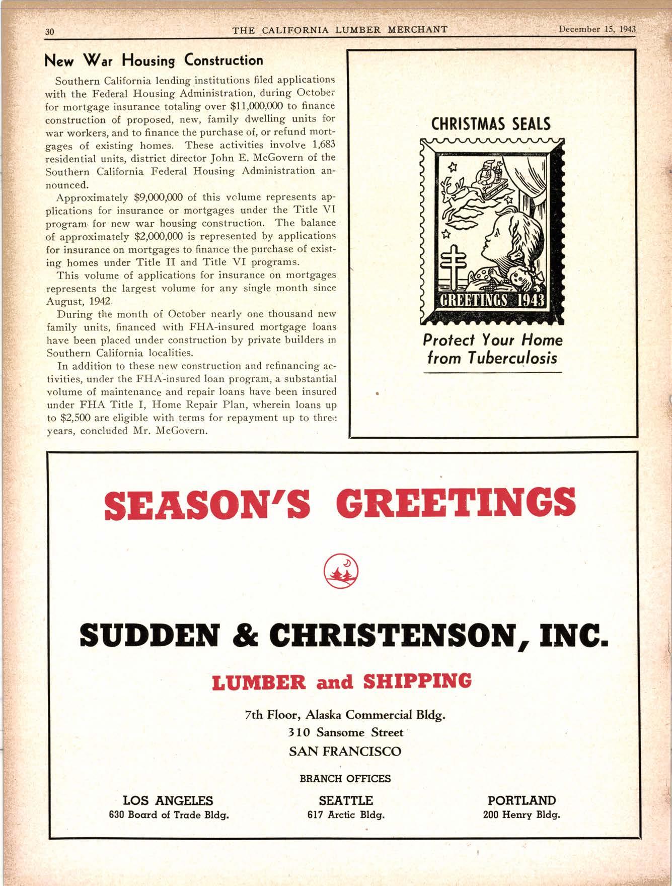 DecembeT i5, 1913 THD CALIFORNIA LUI{BER MERCHANT PAGIFIG MUTUAL DOOR GO. Wishes You Christrnas Greetings Best Wishes For 1944 Southern Colilorniq Sales OIIice: GLEN D. BESSONETTE Phone PRospect 9523 GARWOOD, N.J. OBGANIZATION Wcrrehouse: 1600 E. Wcrshington Blvd. LOS ANGELES 2I KANSAS CITY ST. PAUL W;il";ng Ou, griendt A MERRY GHRISTMAS A UIcTORIOi"i IIEw YEAR Uon Jrtloln -,Ka*it {u*6n, Co., ,bnr, sth & Brcrnncn Streets, Scn Francisco 7 r Jd"lidoy Qrnntingt AND BEST WISHES FOR THE NEW YEAR O'NEII.I I.UMBER GO, 16 Cclilornicr St. SAN FRANCISCO II GArlield 9ll0 507 Bonqnza Rd. tAS VEGAS Nevqda SEASON'S GREETINGS AND BEST IVISHES FOR ''44 CAL'IFORNIA PITYWOOD, Inc. VENEERS and PANETS united stctes Gypsum compcny's Insulqtion and Hardbocrds 1403 Filth Street OAKLAND Z, CALIF. Glencourr 96g9