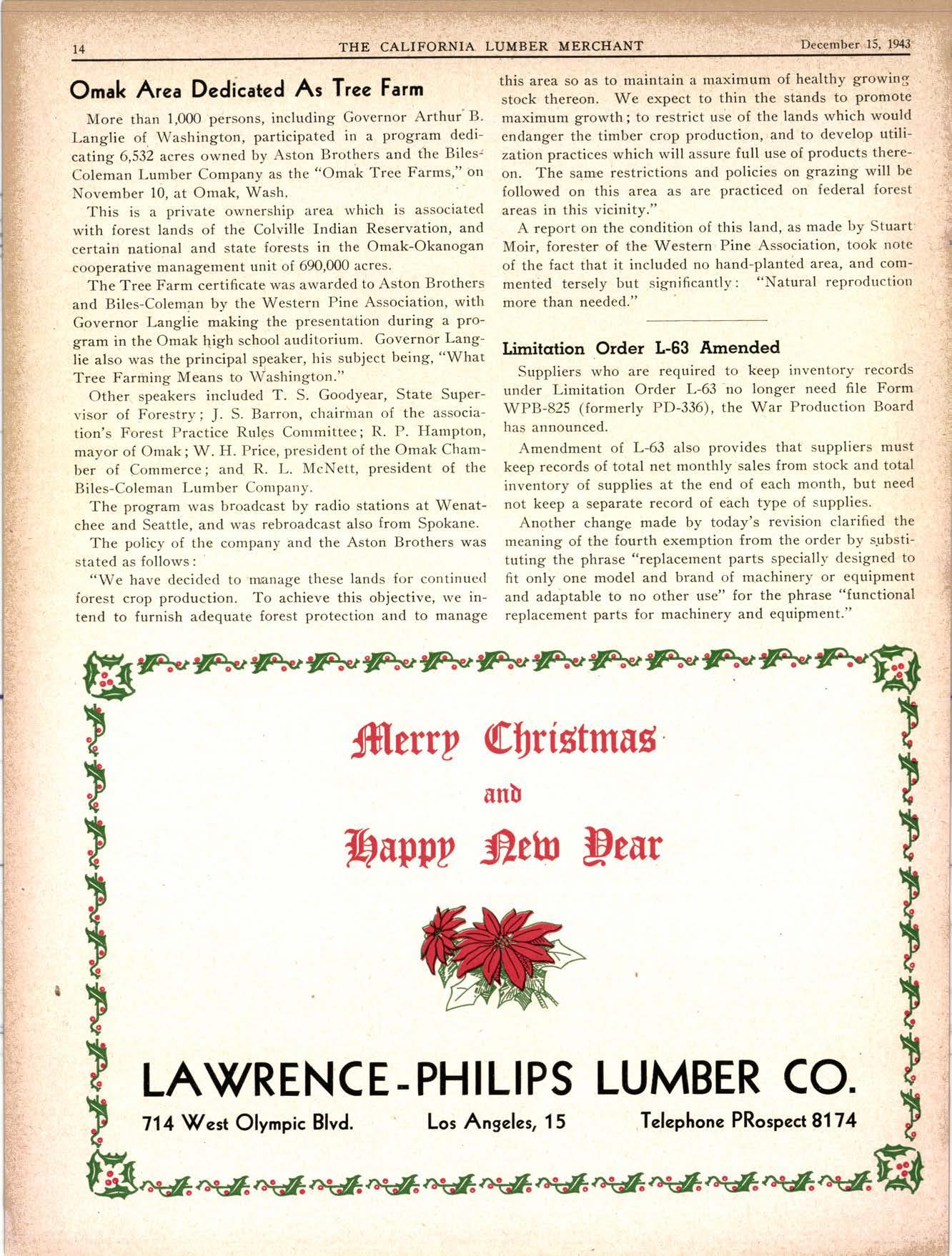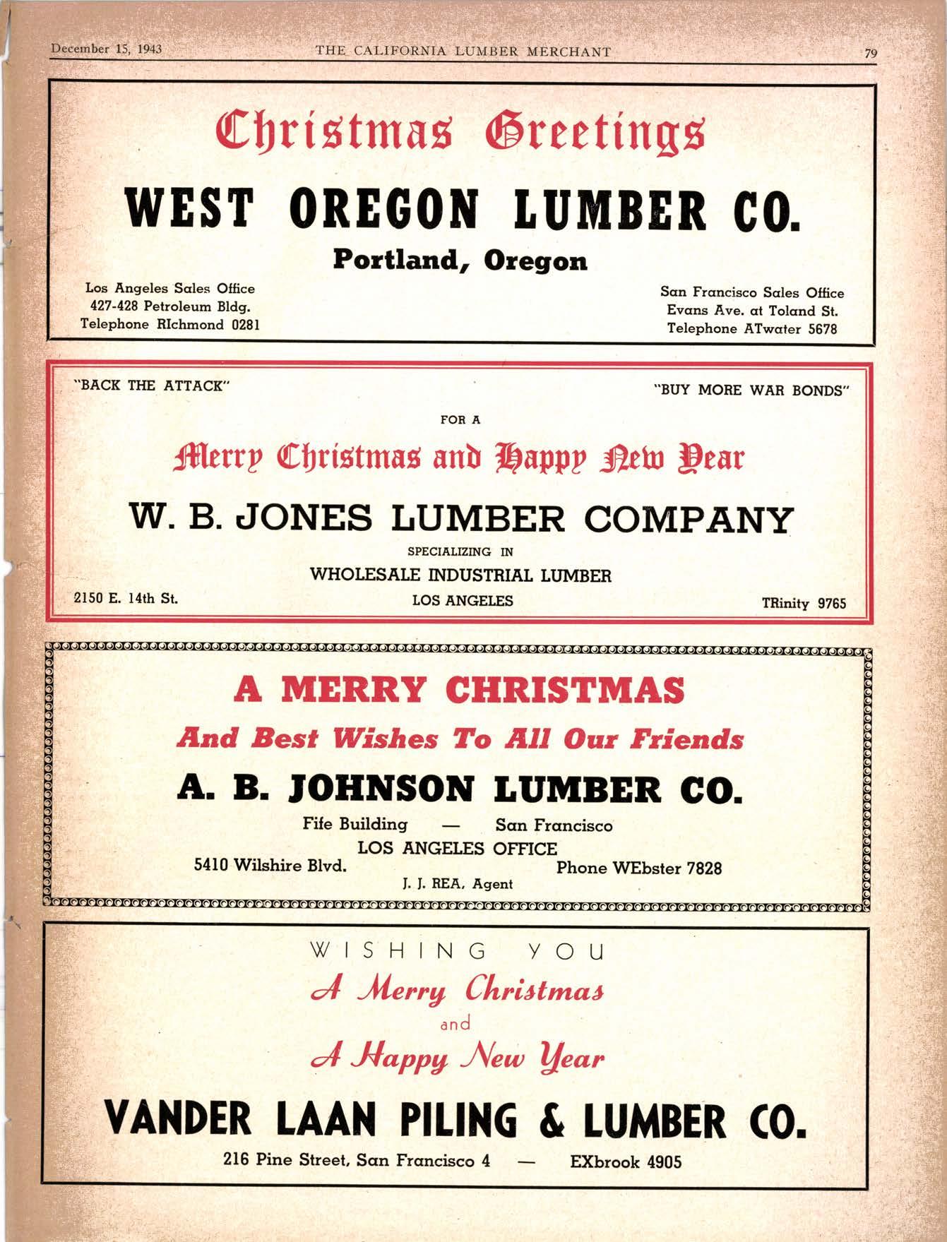 December 15, 1943 THE CALIFORNIA LUI,IBER MERCHANT 79 Wbrtrtmus @eilin$E WEST OREGON I,UMBER CO. Portland, Oregon Los Angeles Sales Ollice 427 -428 Petroleum Bldg. Telephone Rlchmond 028t Scrn Francisco Scrles Olfice Evans Ave. qt Toland St, Telephone ATwcter 5678 I ..BACK THE ATTACK" ..BUY MORE WAR BONDS" FOR A frlewy @I:ristmug nn! Tbuppp fren Eesr \M. B. GIONES L,UMBER COMPANY wHorEs^'I';HfHht L'MBER 2150 E. l4rh sr. tos ANGEI^ES Tniniry 9765 A MERRY CHRISTMAS And Best Wishes To AII Our Friends A. B. IOHNSON IUMBER GO. File Building San Francisco 5410 wilshire Btvd. Los ANGELES oot"t none wEbs rer 7g2g I. I. REA, Asent \(/ISHING Y OU -l )lnrry Chri*tm&t ond ol .'Hoppy -rYn* [no, YANDER IAAN PIIING & TUMBER CO. 216 Pine Street, San Frcncisco 4EXbrook 4905
