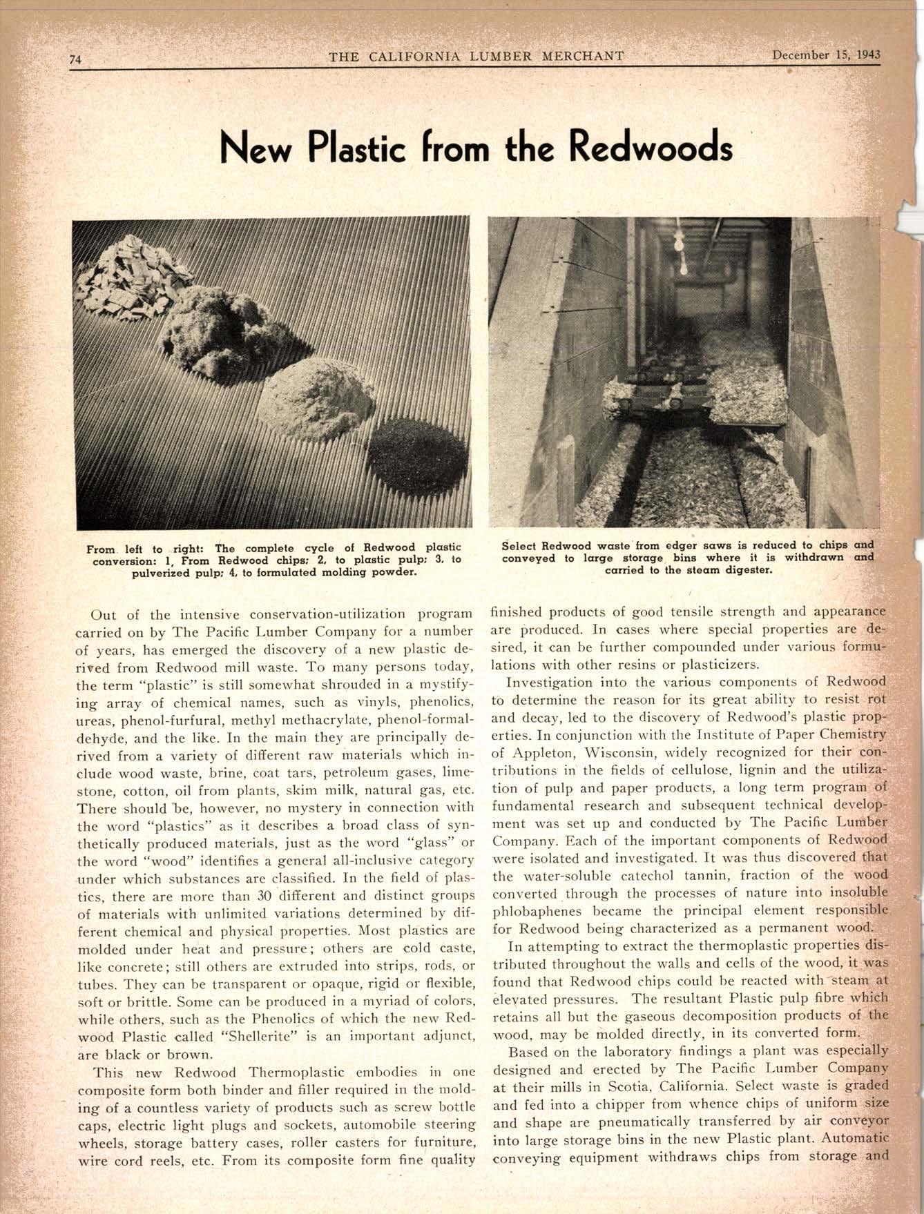 -\sirlc frorl tl.re grcat contribution that l.ras been maclc irr tlic rliscovery of this ,cr'r' Redwoocl plastic, this cle'elopnrent is notable from the stanclpoint of cooperative re_ searclr :rlr11 coorciir.raterl elTort jointlr- ur-rdertaken by a na_ tional researcl.r organiztLtion and a leading factor in the field of lierlrroocl lun-rltering.