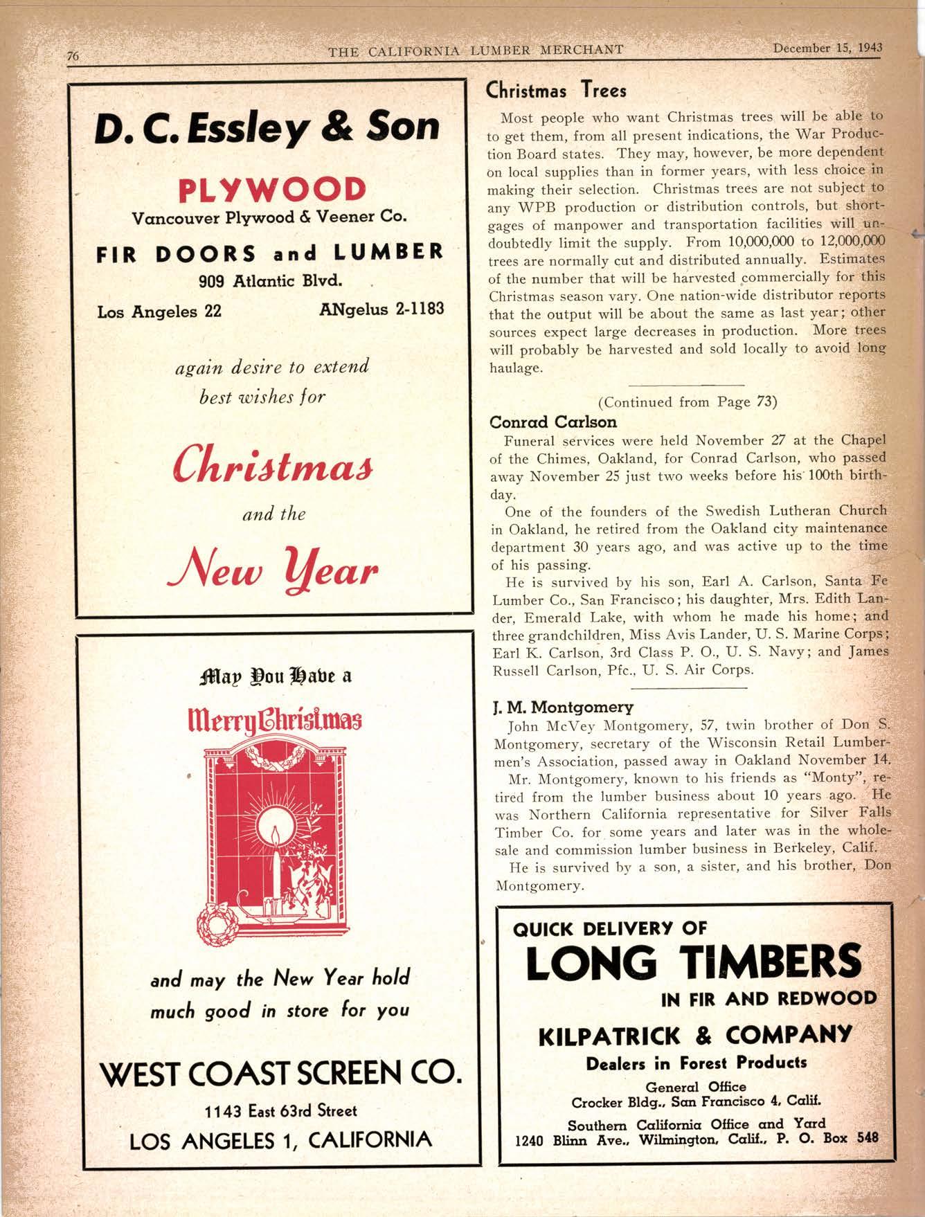 J filay Dou trbabe a tlleng_6luistruas and may tfie New Yea, hold much good in store for You \(/EST COAST SCREEN CO. 1143 East 63rd Street LOS ANGELES 1, CALIFORNIA OUICK DETIVERY OF LONG TIMBERS IN FIR AND REDWOOD KILPATRICK & COMPANY Dealcrs in Forest Products Genercrl Olfice Crocker Bldg., Scrr Frqncisco 4, Cclil. Southern Ccrlilornicr Olfice <rnd Ycrrd 1240 Blinn Ave., Wilmingiton, Calil., P. O. Box 548