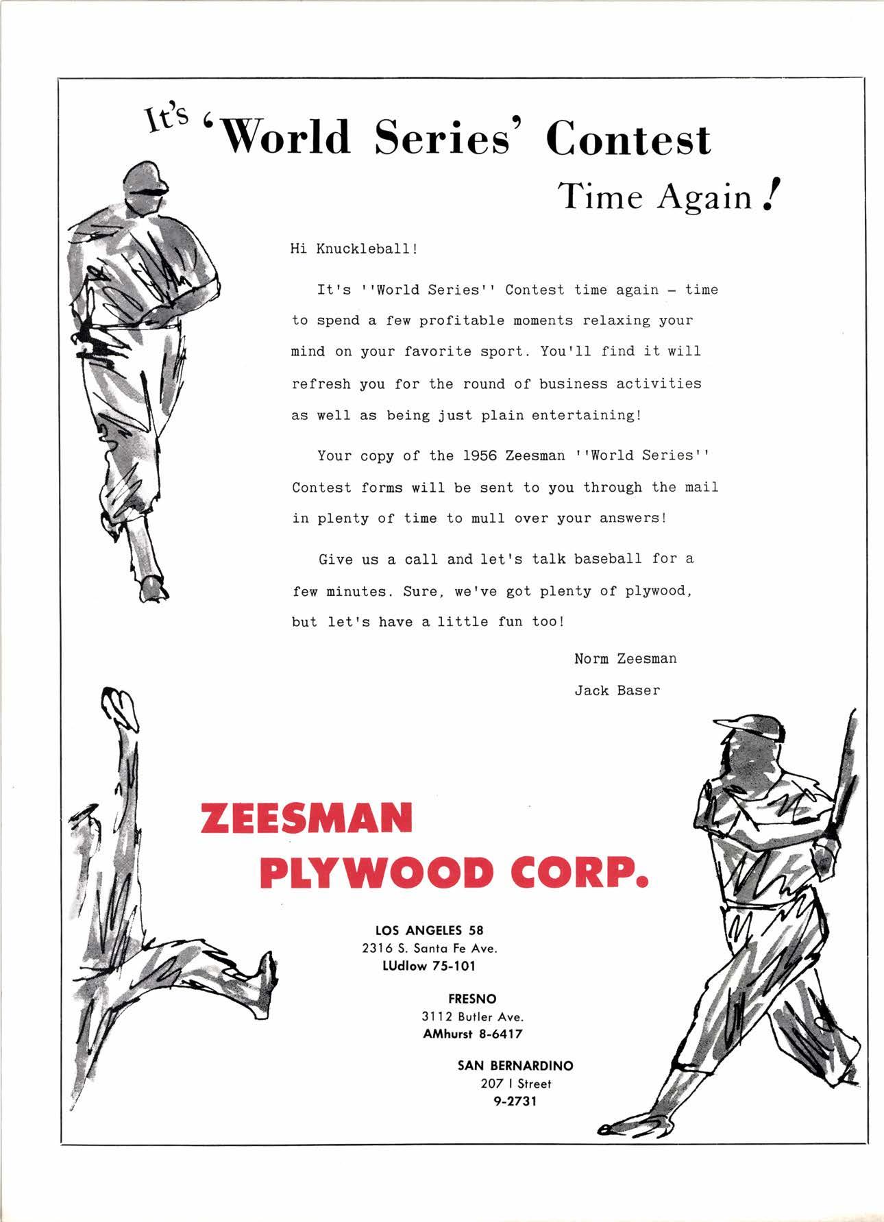 Your copy of the 1956 Zeesman ttWorld Series' Contest forns will be sent to you through the mail in plenty of time to null over your answers!