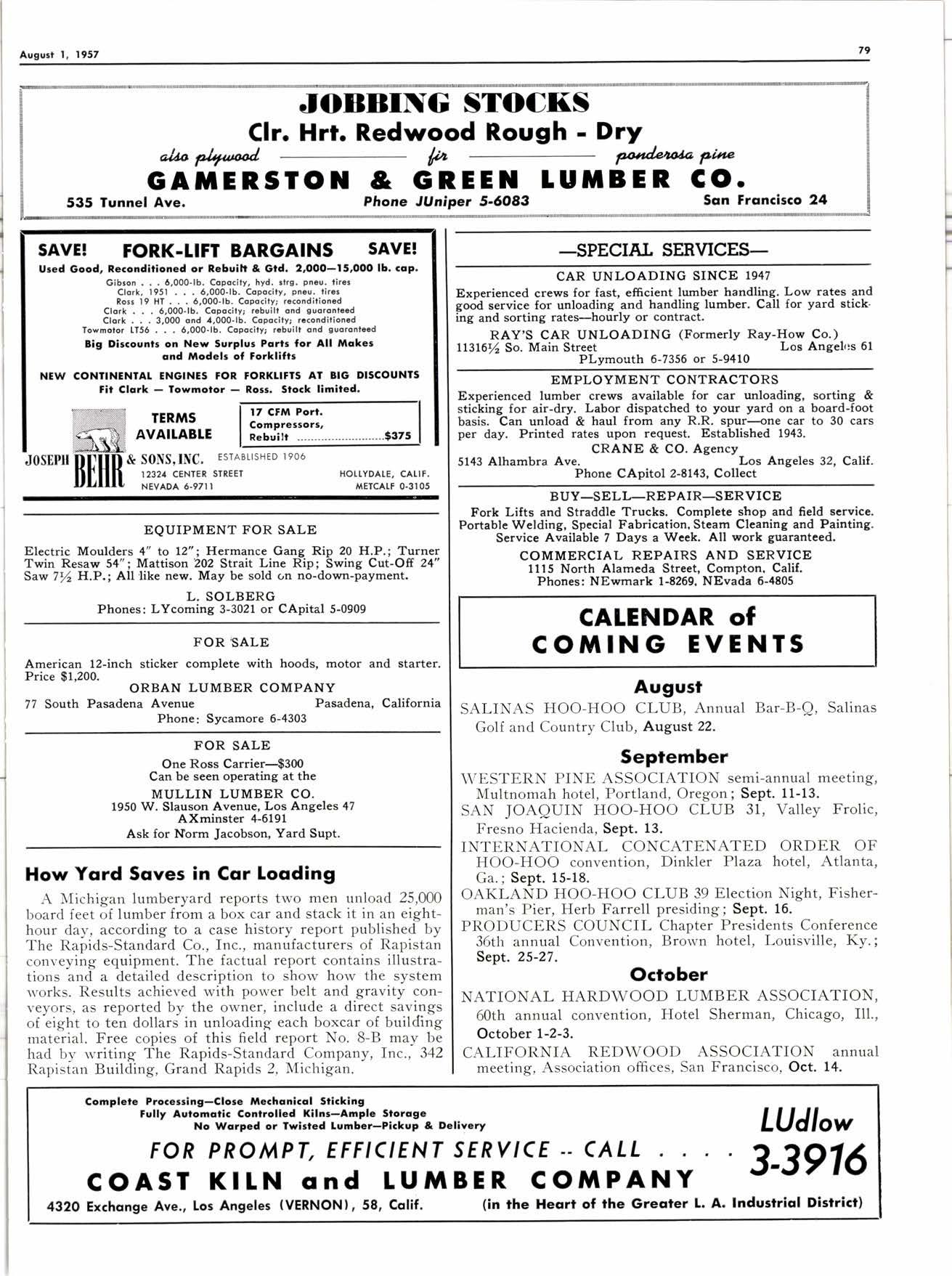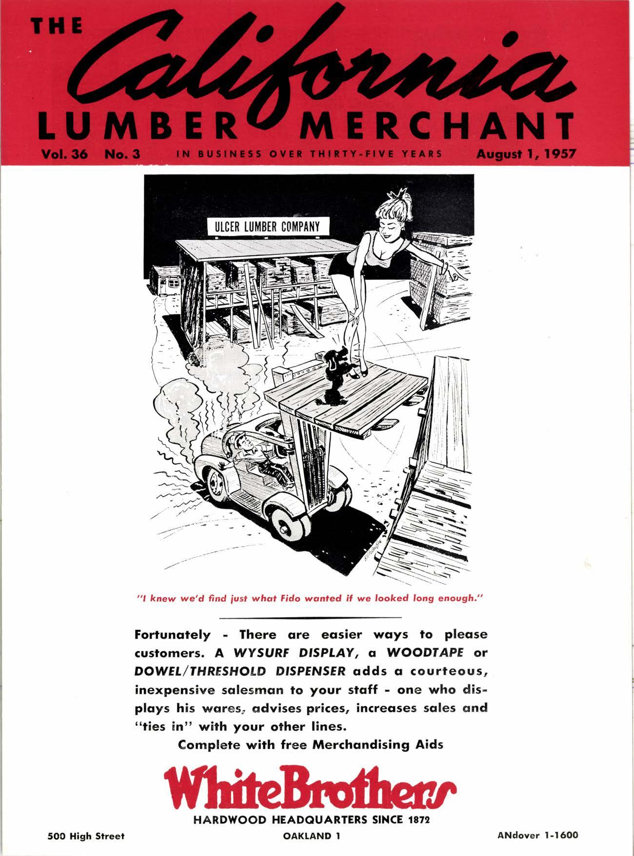 lssue Vogobond Editoriols ... l0 Obituories ....... 62 My Fovorite Story .22 Personals . 70 New Products . 40-41 New Trqct Developments 72 Fun-Focts-Filosophy .48 Federol Aid Projects 74 NewsBriefs .,....52 WontAds ....78-79 25YeorsAso. ... 56 $cle$Ideo$ ...... 80 Administrotion Signs Housing Act ol 1957 2 Lumber Industry Pushing Double-door Boxccrs 6 16 Western Retcril Yords Win Wotches, Cosh Awqrds . 8 Plywood Products Previewed ot i957 Annuqi . 14 Pioneer Import-Export Firm 108 Yeors in S. F. . 16 Wolter Scrim Retires From PMA Presidency lB Retoil Yords May Sell Militory LCL Direcl 24 Scrwmills Stcnt Tests o{ Unitized Shipments 26 Federol Excise Tox on Cortoge Exploined .. .. . 28 E. K. Wood Yords Win Advertising Awcnd . . 30 How to Apply for Vorionce on Incinerqtors . 32 Speciol Hoo-Hoo Events . 34, 54 Russell ]ohnson to Heod Union Lumber Compony 36 Tempe, Arlzono, Yord Okoys'Pockoged' Lumber 38 Revised Flush-Door Guorqntee o{ the S.C.D.I. ... 42 Colilornio, Arizonq Building Permits for June .. . 76 Colendorof ComingEvents ........79 The ADVEBTISERS INDEX will be Iound on Pctge 80