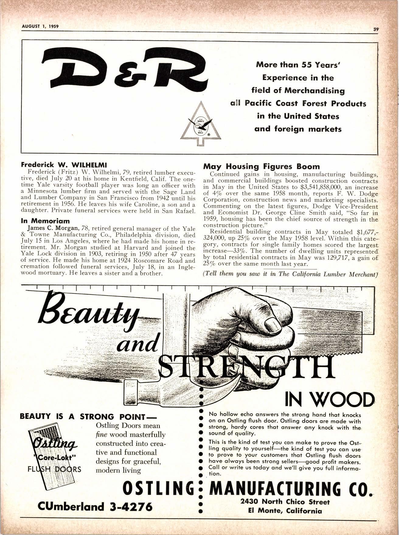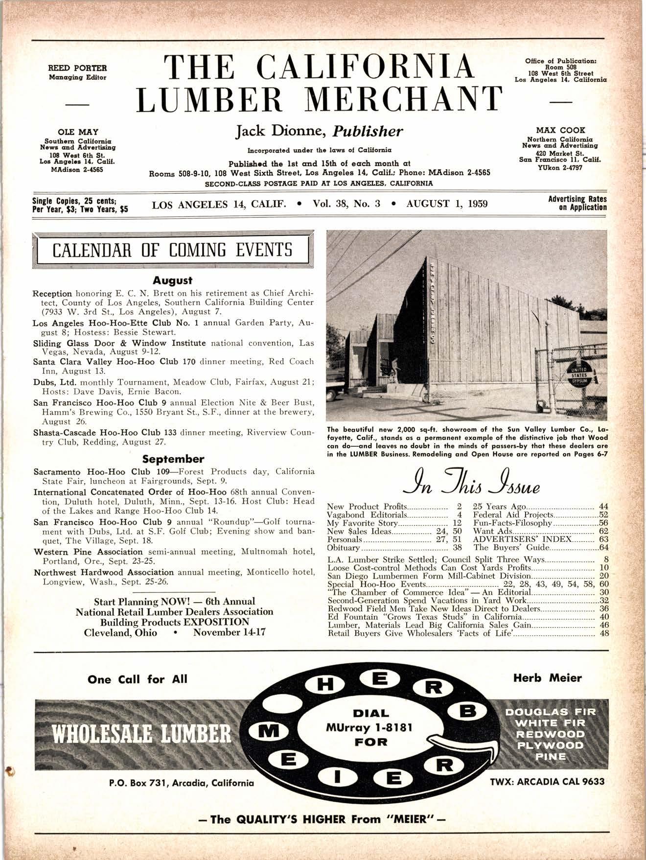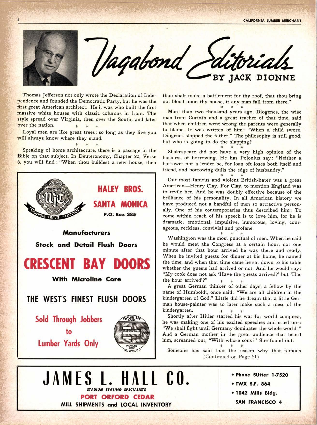 Jacobsen, a native of Denmark and a veteran of more than 30 years of lun.rber experience, began his career the liard way clurir.rg the 20s in tire logging camps of the Reclu'oocl Higirway region. He later migrated south, turned his hat around, ancl entered the retail lumber bnsiness as a partner in Piedmont Lumber Company, Oaklancl. Still later, and prior to forming a r,r'inning partnership .w,'ith