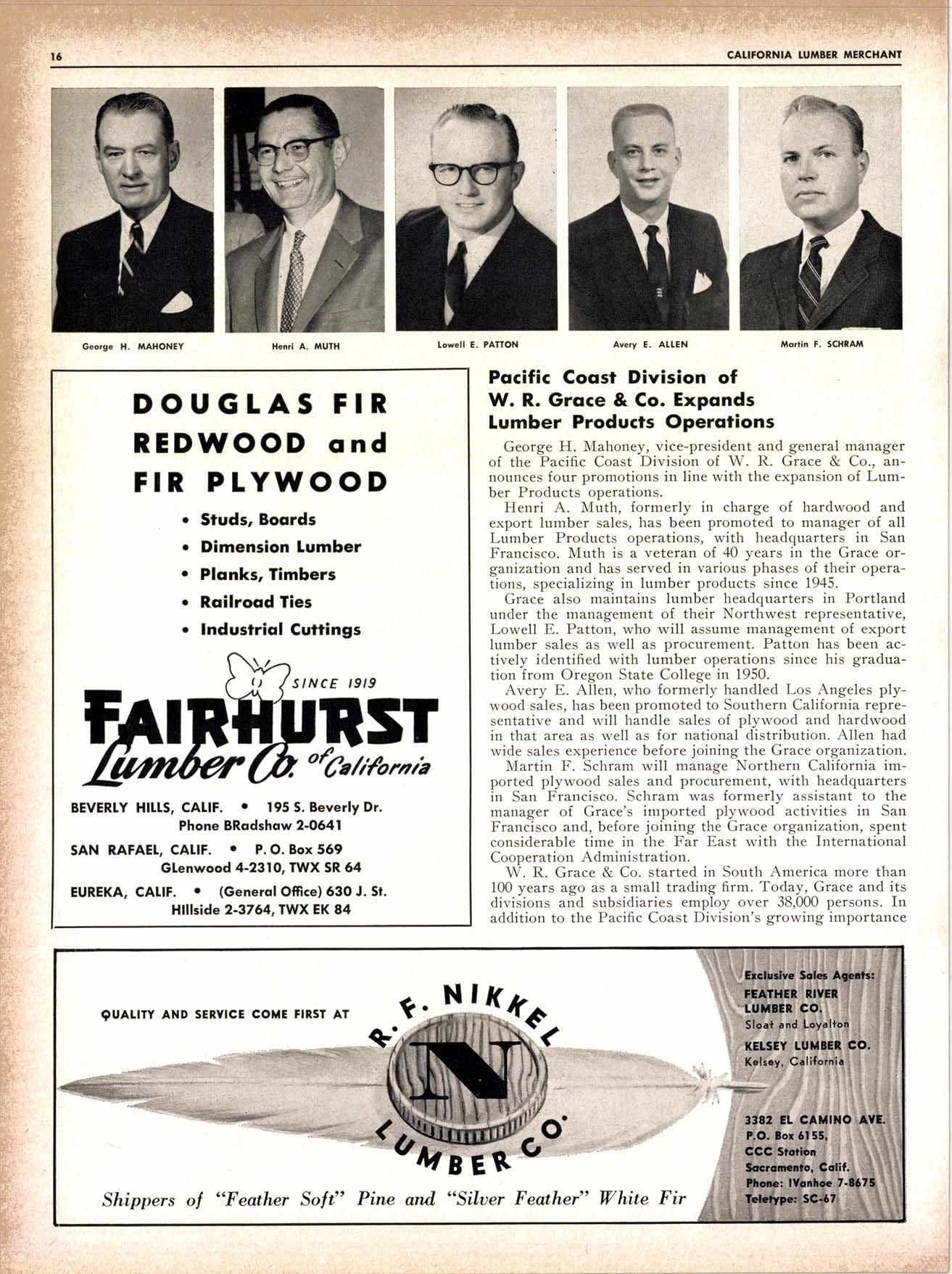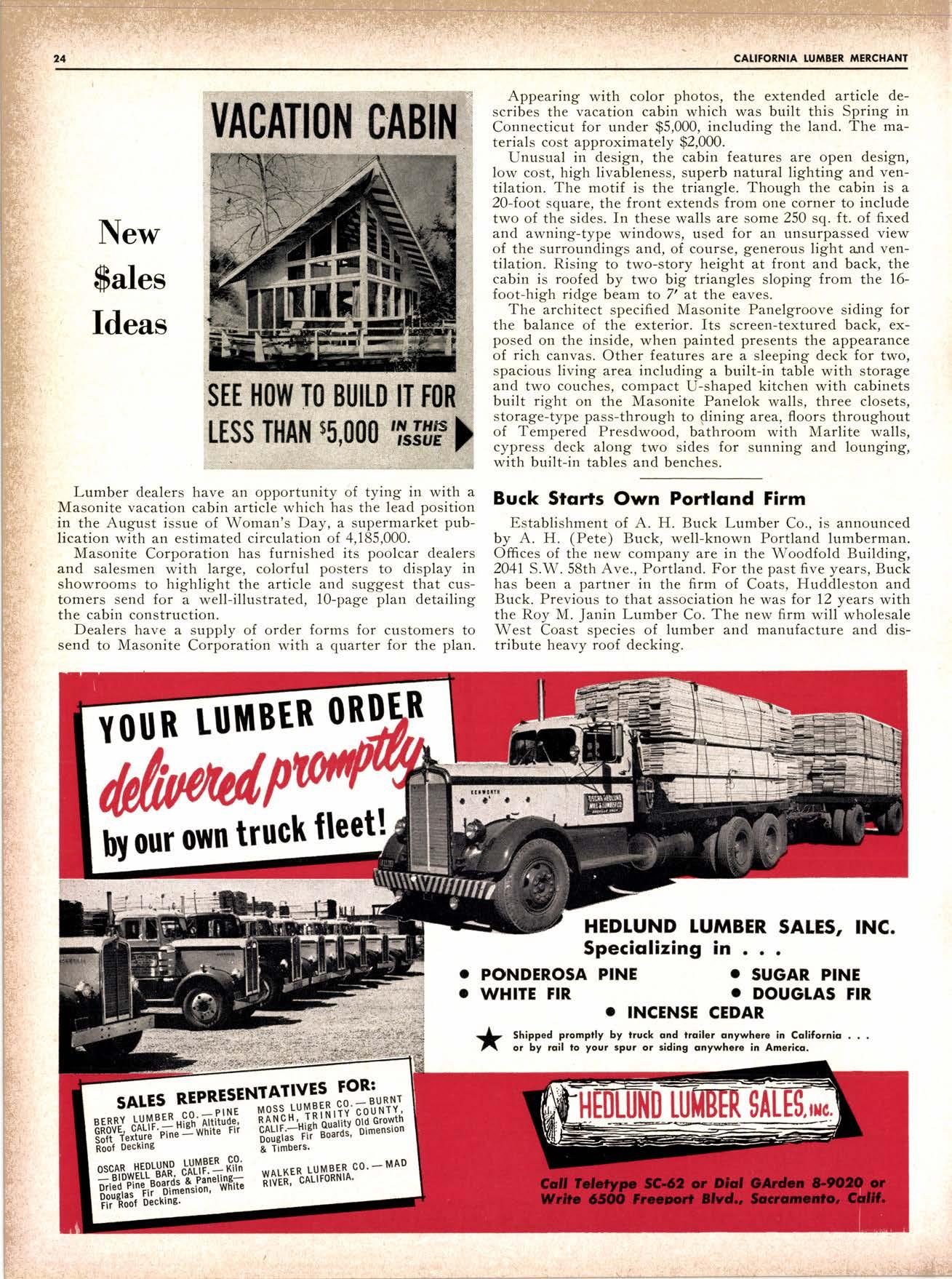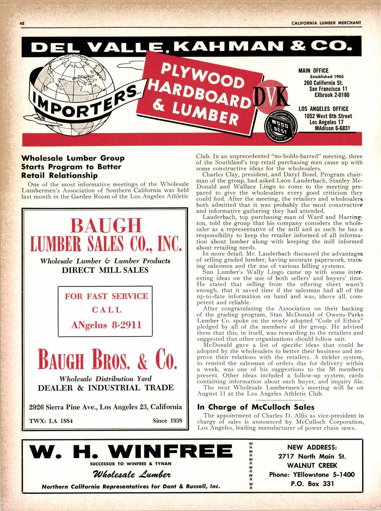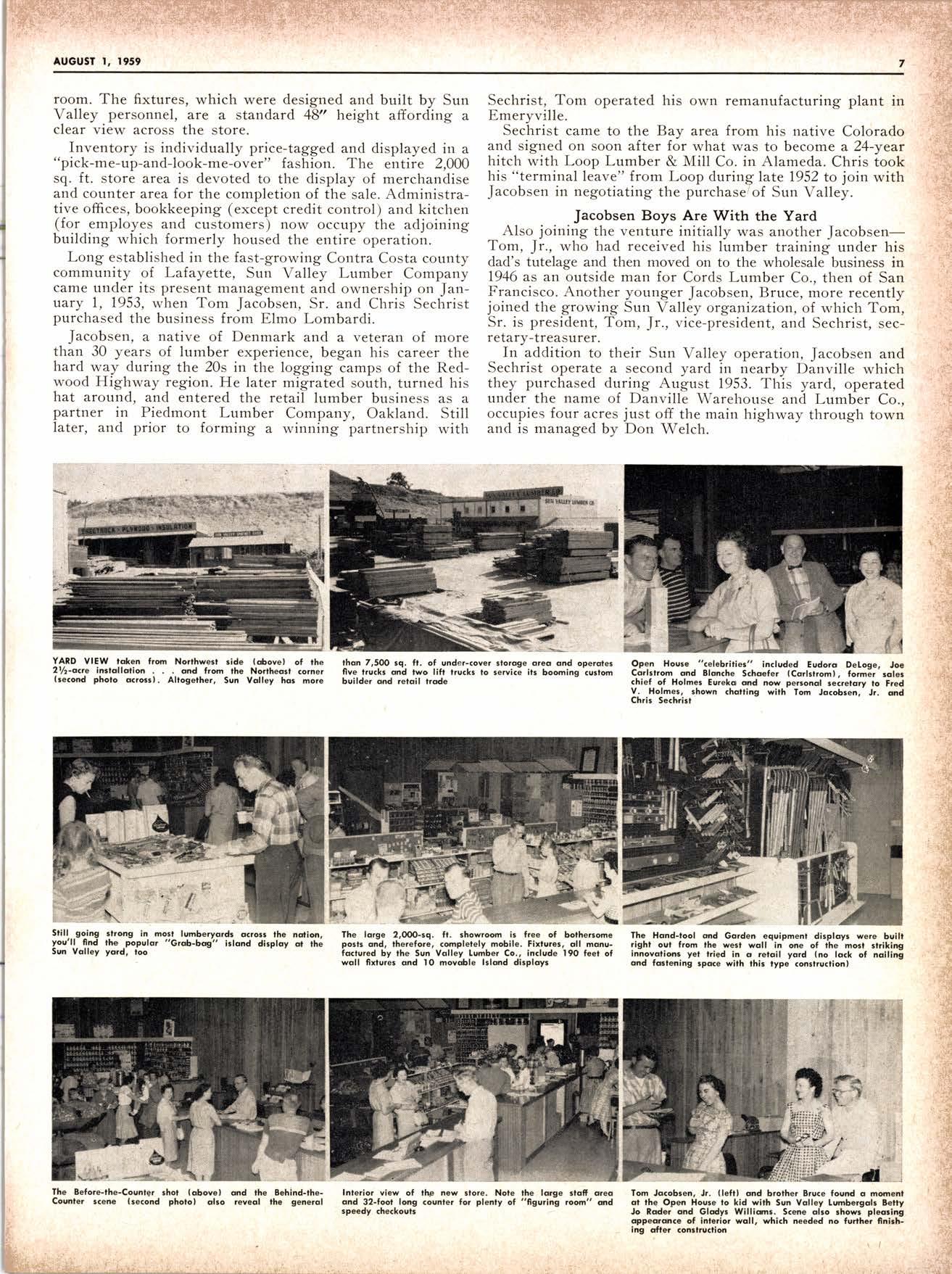 Also joining the venture initially was another JacobsenTom, Jr., who had received his lumber training under his dad's tutelage and then moved on to the wholesale business in 1946 as an outsicle man for Corcls Lumber Co., then of San Francisco. Anotl-rer young'er Jacobsen, Bruce, more recently joined the growing Sun Valley organization, of r,r'hich Tom, Sr. is presiclent, Tom, Jr., vice-president, ar.rd Sechrist, secretary-treasurer.
