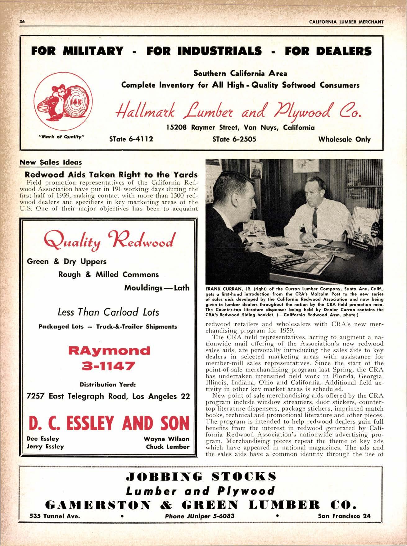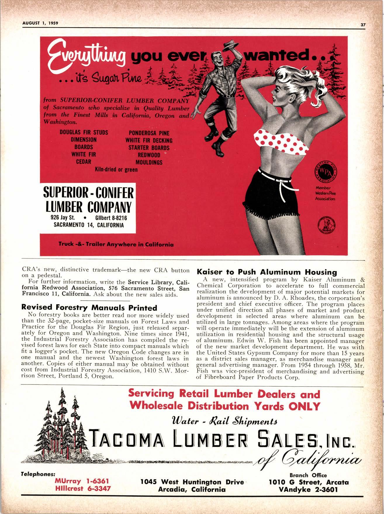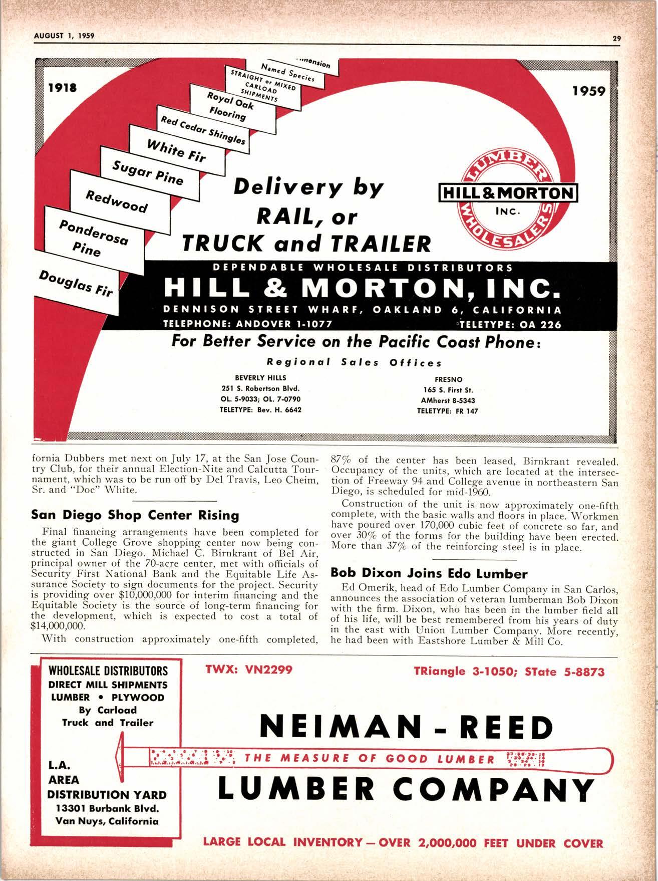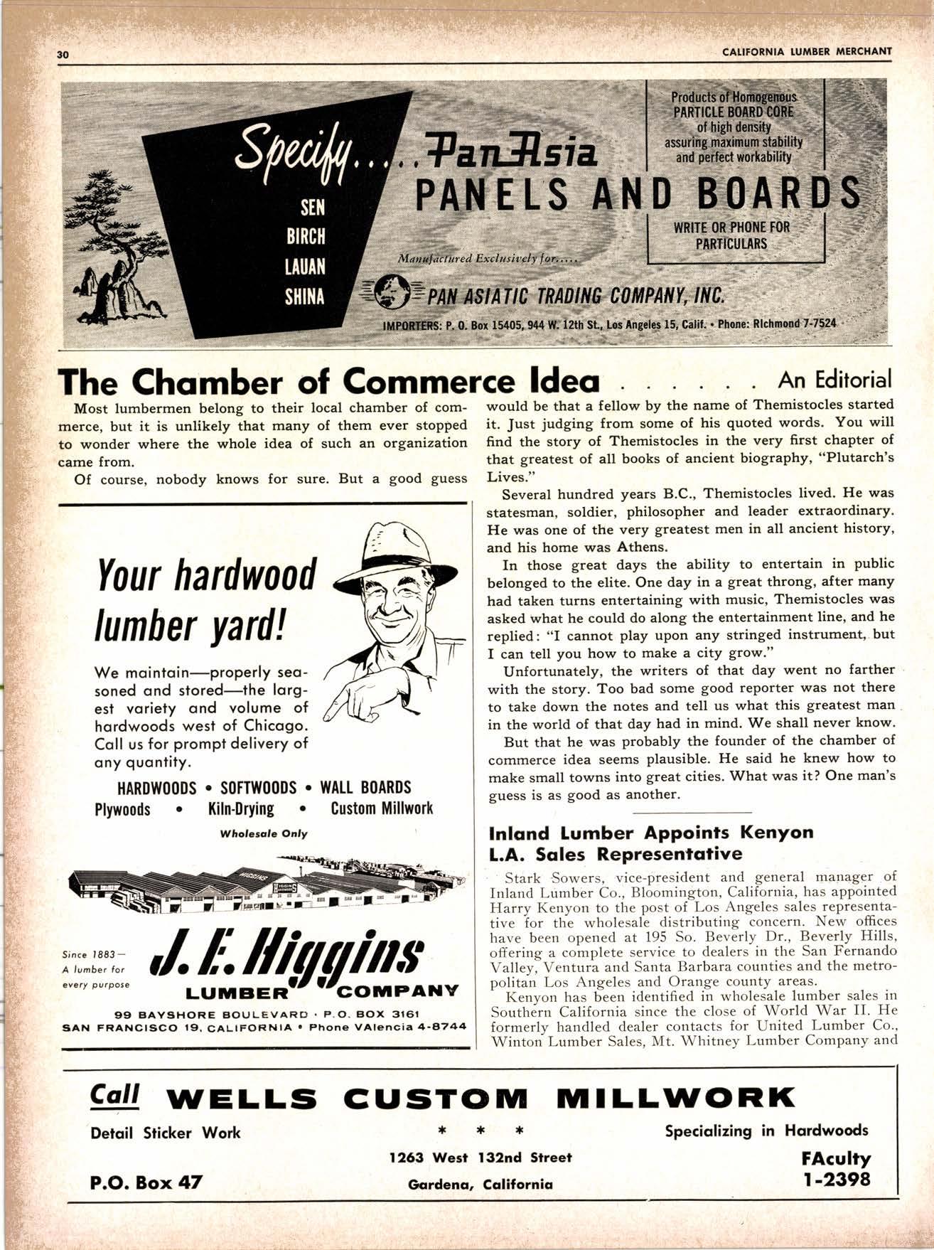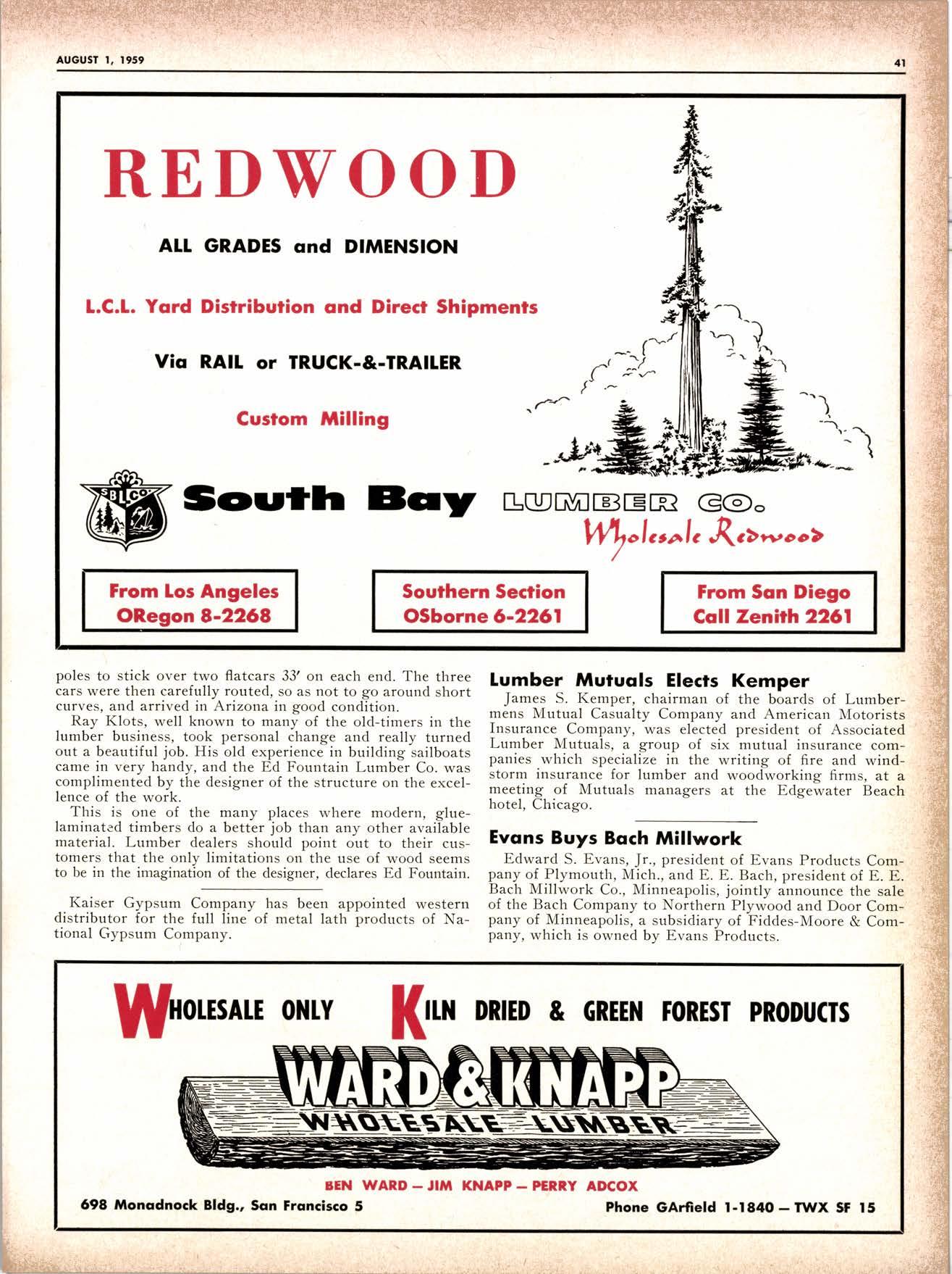 Also joining the venture initially was another JacobsenTom, Jr., who had received his lumber training under his dad's tutelage and then moved on to the wholesale business in 1946 as an outsicle man for Corcls Lumber Co., then of San Francisco. Anotl-rer young'er Jacobsen, Bruce, more recently joined the growing Sun Valley organization, of r,r'hich Tom, Sr. is presiclent, Tom, Jr., vice-president, ar.rd Sechrist, secretary-treasurer.