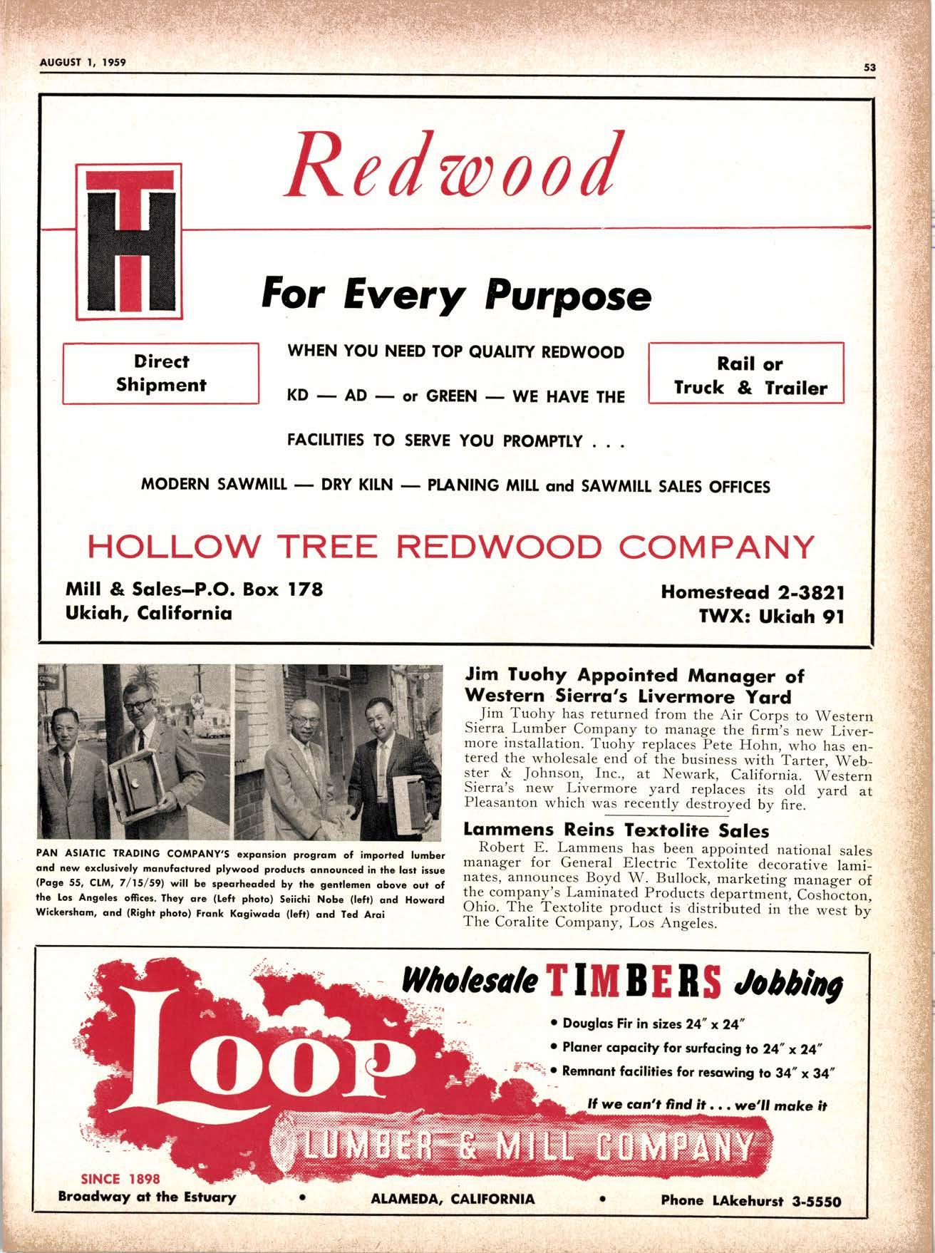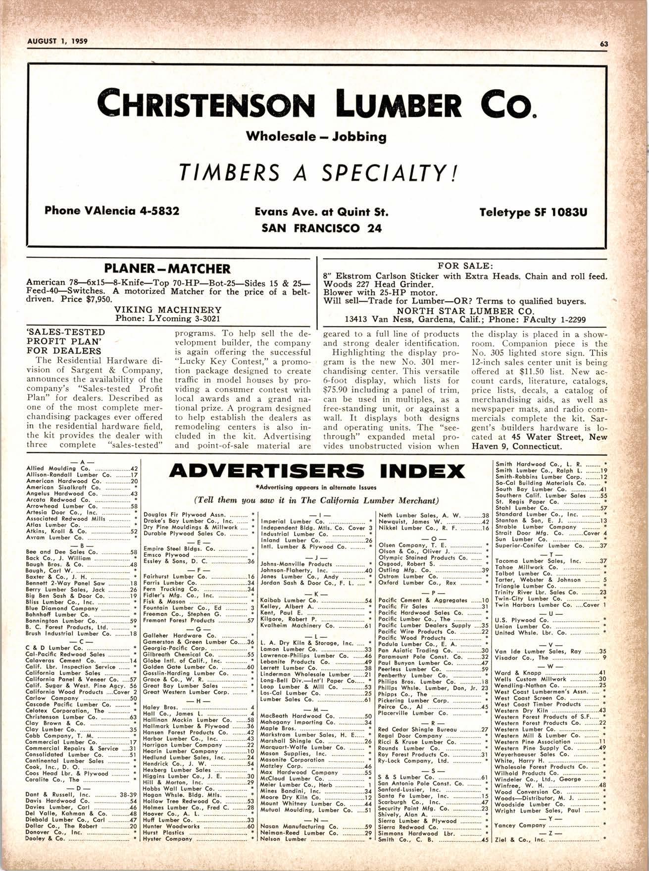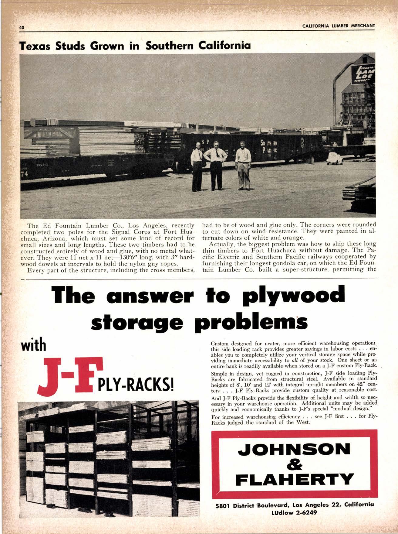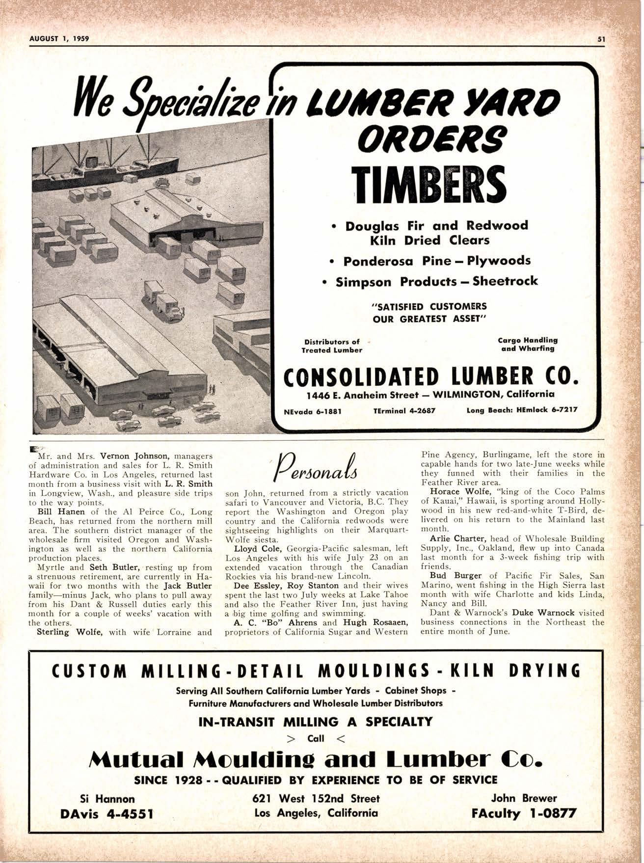 Also joining the venture initially was another JacobsenTom, Jr., who had received his lumber training under his dad's tutelage and then moved on to the wholesale business in 1946 as an outsicle man for Corcls Lumber Co., then of San Francisco. Anotl-rer young'er Jacobsen, Bruce, more recently joined the growing Sun Valley organization, of r,r'hich Tom, Sr. is presiclent, Tom, Jr., vice-president, ar.rd Sechrist, secretary-treasurer.