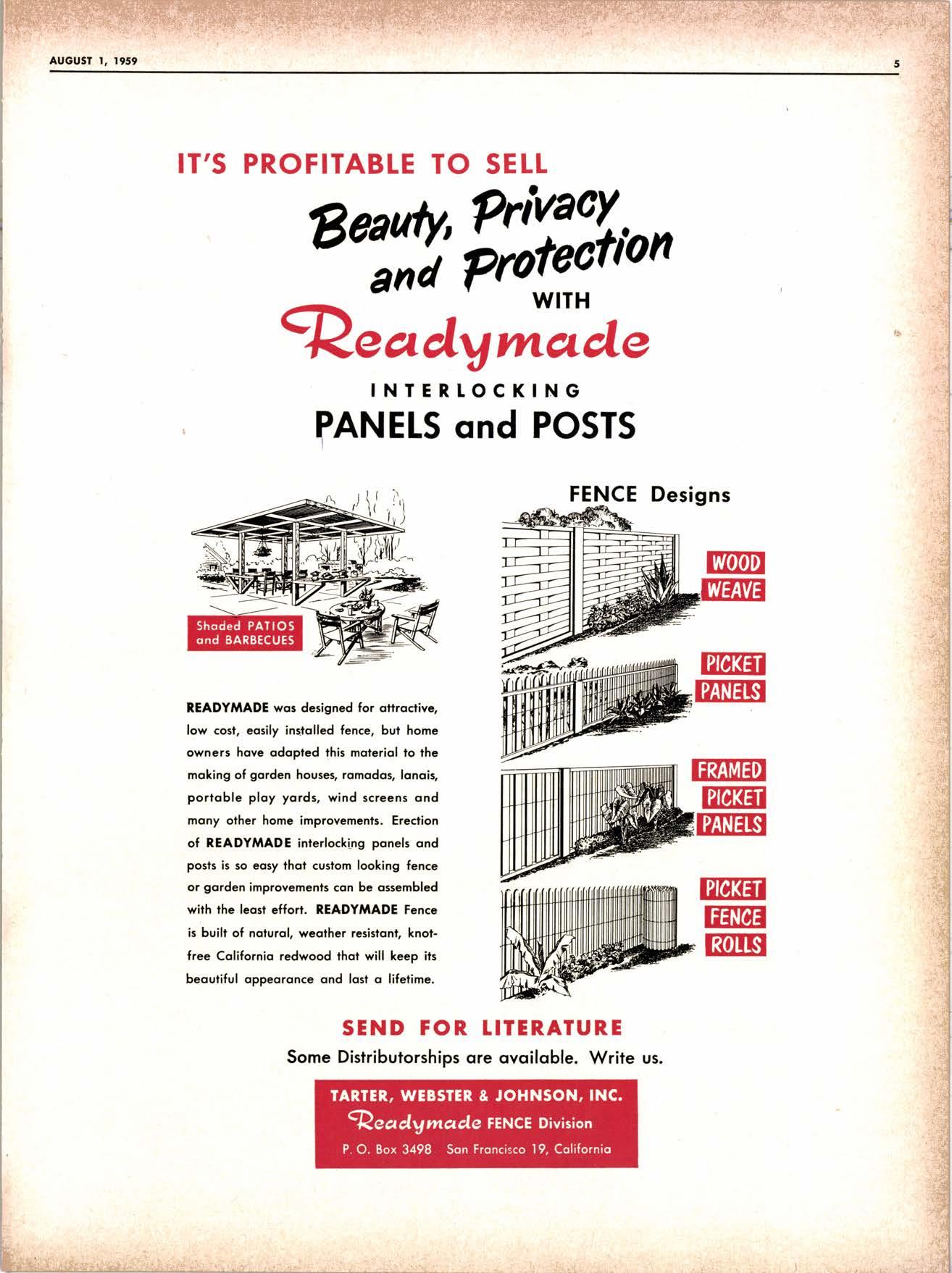 READYIYIADE wos dcsigned for otlroctive, low cosl, cosily in$olled fence, but home owners hove odoptcd this moteriol fo lhe moking of gorden houses, romodos, lonois, porloble ploy yords, wind screens ond mony olher home improvements. Erection of READYMADE interlocking ponels ond posts is so eosy lhot custom looking fence or gorden improvcmenls con bc ossembled with the leost effort. READYMADE Fence is buih of nolurol, weother resislont, knotfree Colifornio redwood thot will keep its bcoutiful oppeoronce ond lost o lifefime.