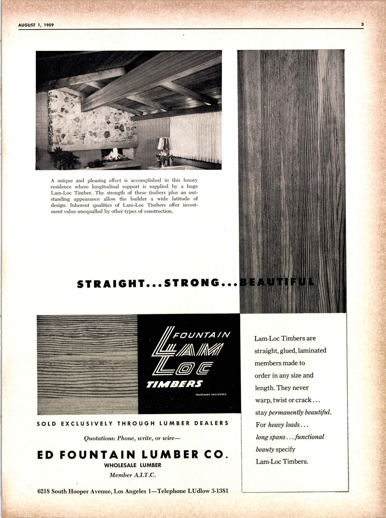 A r.rnique and pleasing effect is trccomplishecl in this luxury residence where longituclinal support is supplied by a huge Lam-Loc Timber. The strength of these timbers plus an outstanding appearance allow the builder a wide latitude of design. Inherent qualities of Lam-Loc Timbers offer investment value unequalled by other types of construction.