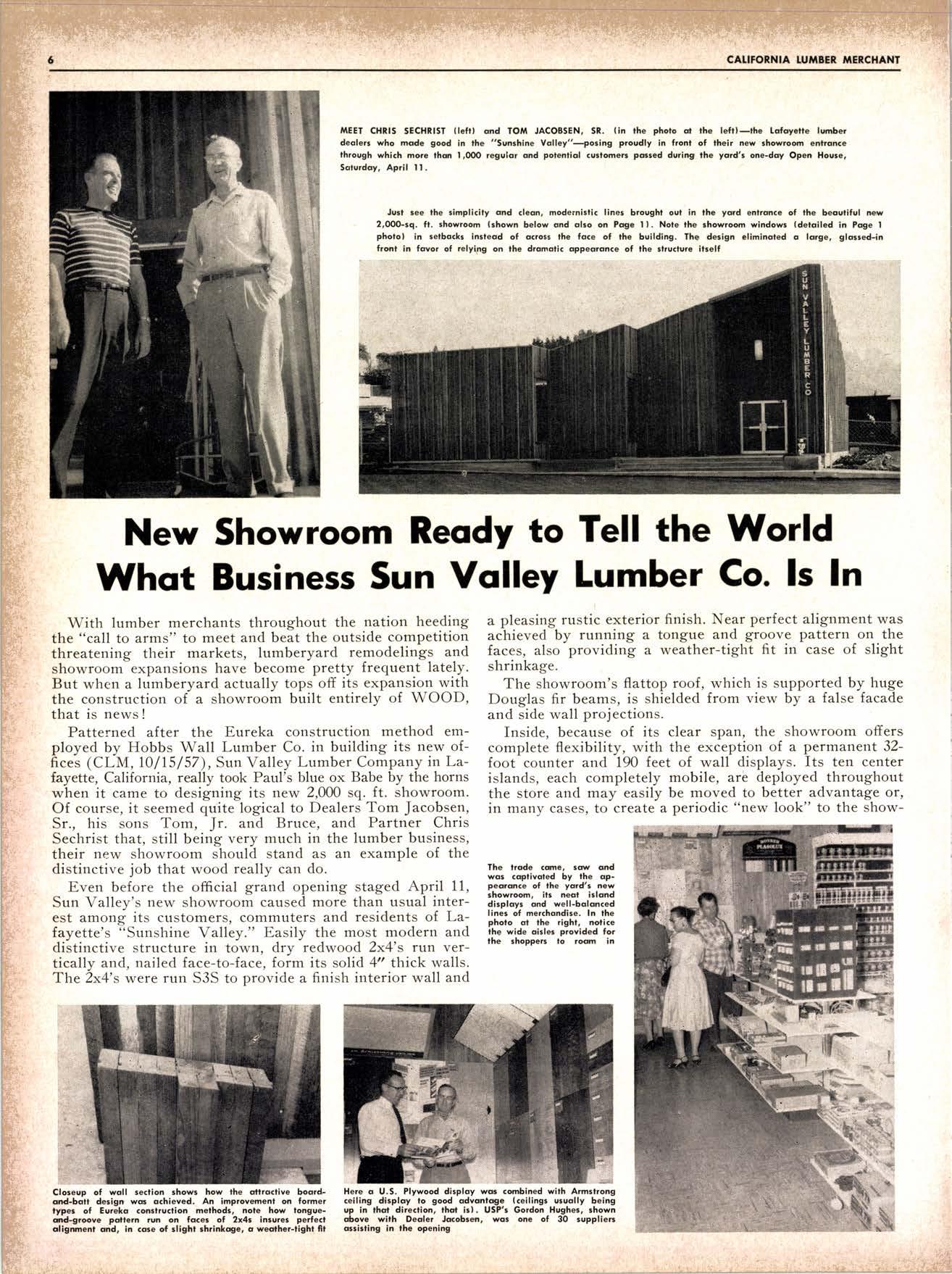 Patterned af ter the Eureka construction method employed by Hobbs Wall Lumber Co. in building its new offices (CLM , 10/15/57), Sun Valley Lumber Company in Lafayette, California, really took Paul's blue ox Babe by the horr.rs when it came to designing its new 2,000 sq. ft. showroom. Of course, it seemed quite logical to Dealers Tom Jacobsen, Sr., his sol1s Tom, Jr. and Bruce, aud Partner Chris Sechrist that, still being very much in the lumber business, their new showroom sl-rould stand as an example of the distinctive job that wood really car-r do.