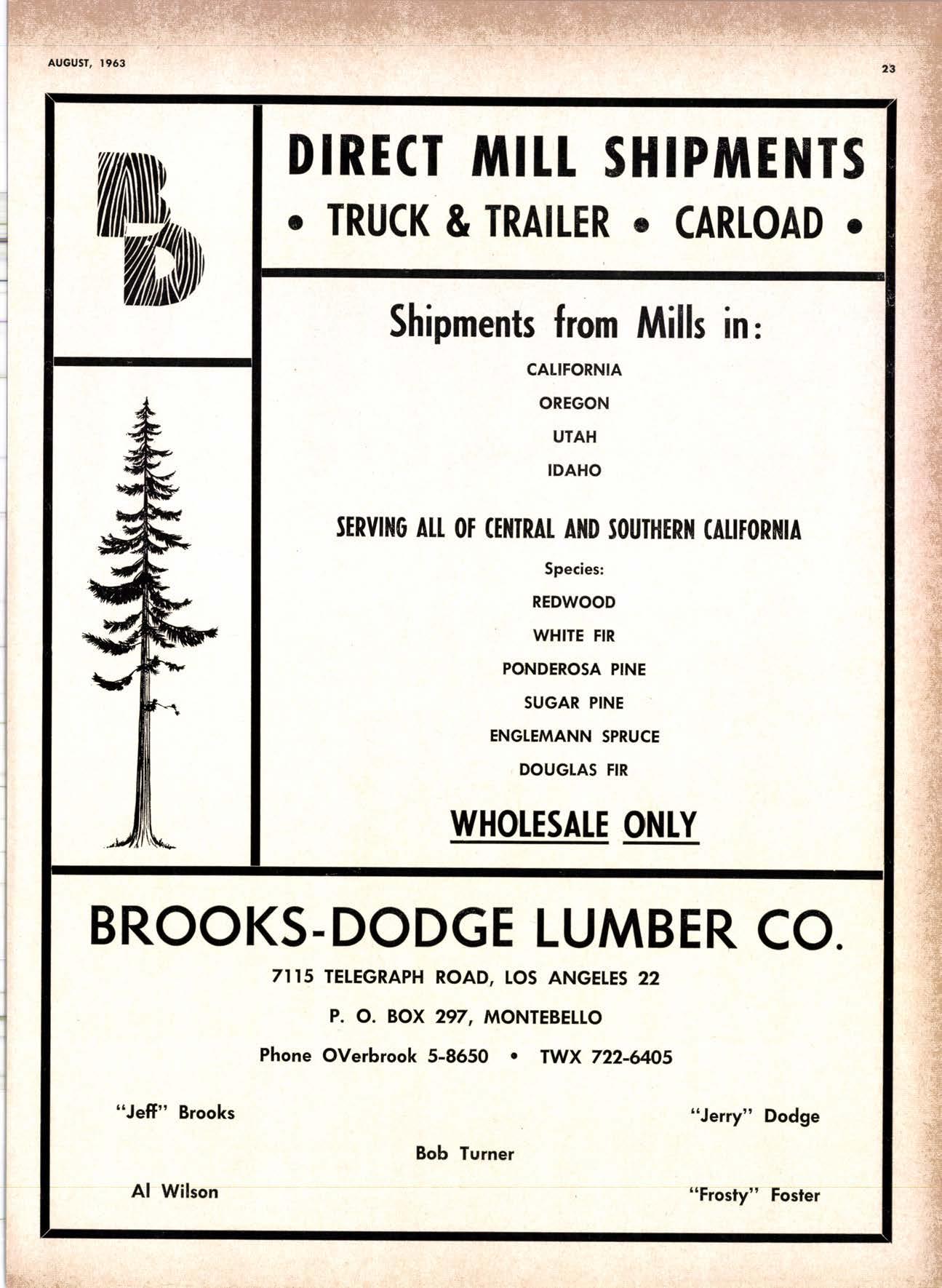 8-2881 Bruce Co.. Inc., E. L.--.----..-- ---284-1300 Buifding Moleriols Dislributors.------- .295-3741 Colifornio Lumber Soles .-.--,.-.....-.-..-.--..KElloq 4-1004 Pocific Fir Soles .-----,-.-.--.-.-------..-.-.-DAvenport 6-8864 Pocific Hordwood Soles,------------.-.---.ANdover l-6342 Pocific Slud & Posl Co..-...-.----.----.-----.-GArden 3-9222 Podulo lumber Co.. E, A. --.....----OXlord 7 -6481 Peerless Lumber Co.------,,-----"----------LOckhoven 2-7700 Son Jose Plryood [umber Co.-..-----------CHerry 3-3'120 Sonlo Fe Lumber, lnc..-..--.-------..-..---,OLympic 8-6000 Sowmifl Soles Co. .-.-..-..-..- 697-6034 Slondord Lumber Co.----.--..-.,------.-----DAvenporl 6-9669 Stroble !umber Compony..-.------.---.-TEmpelbor 2-5584 Torler, Websler & Johnson---------------SYcomore 7-2351 T. H, & F. Soles, lnc.--...-..----.-.--.--.-..DAvenporl 1-2525 Triongle Lumber Co..-..--..--...-.---.----.LAndscope 4-9595 Tri-Slole Plywood (Beckslrom & Co.l-----.----..--.----.----DAvenporl l-2012 Twin Horbors Iumber Co.------------DAvenport4-2525 U.S. Plywood Corp. (Ooklond)--------TWinooks 3-5544 U.S. Pfywood Corp. (Sonto Cloro).-..--.-CHerry 3-5286 Weslern Pine Supply Co..-.---.----------...Olympic 3-771 I While Brothers .---------ANdover l -1600 Wholesole Building Supply, Inc. ----TEmplebor 2-6964 Woodside Lumber Co.--.---------------------Dlomond 3-5644 PANETS-DOORS-SASH_SCREENS MI]IWORK_BUITDING MATERIALS Arlesio Door Co., Inc. (Son Jose)--..ANdrews 4-8862 Coloveros Cemenl Co.--------------------GLencourl 1-74QO Cobb Co., T. M.-.-.-..-.-..-..-.---.,-,--...-------..Llberty 5-7297 BUIIDING MATERIATS Coloveros Cement Co.--..--...-.----.-.----.----Gllbert 2-8991 Georgio-Pocific Worehouse--...-.--..-..--WAbosh 2-9631 lumber Deolers Moteriols Co.------,---,-WAbosh 5-2751 Notionol Whlsle. Bldg. Moteriols -----.WAbosh 2-9011 Uniled Stotes Plywood Corp. Glodstone l-2891 Weyerhoeuser Compony--...-------.-.-..--..WAbosh 2-981 I 95 sAN FRANCISCO TREATED IU'VIBER_POLES Boxler & Co., J. H...-.---...-.-.--.---.-..----..-.YUkon 2-0200 lUltBER AND tUi,lBER PROOUCTS Hott Co., Jomes !.___--..-___-._-.-..-.-..-....-.-._,.SUtter 1-752O Arcoro Redwood co.......-,.....-....... ...........yt)kon 6.2067 IiIJjl,l'"*'"1;;;;; '..............::::_l_:ll[:l i.'r3:3 Chrislenson lumber co.----------...-..."--vAlencio 4-5832 Wendling - Nothon co..--------------.---..-...--.sUtter 'l-5363 Cowen, M. S.-..-..----.-.--,.-.,..--.-..-...-,.-.,..EXbrook 2-6236 Woodside Iumber Co..----.--.--.--.--.-..-__Dlomond 3-5644 I Cofif. Sugor & Weslern Pine -....--..-..Dlomond 2-4178 Doors, Inc. DA 6-2068 Donf Foresf Producls, Inc.--.-,--.,-,------------.-......321-0620 Morsholl Shingle Co. IUcerne l-700O Duroble Plywood Soles Co.--,---------DAvenport 4-2525 Torfer, Websler & Johnson-------,--,-----SYcomore 7-2351 Fluor Producfs Co..--.--------------",-,------Templebor 4-8390 Georsio-Pocific Corp. --.-..------,---.,-.---.--.--.--...-..84e-0561 SACRAMENTO Torter, Websler & Johnson, Inc.--...-.--.PRospect 6-420O Georgio-Pocific Corp. (Son Jose).-.-----CYpress 7-780O Union Lumber Compony --.-.-...--.---.---.-Suler l{170 Golden Gole Lumber Co'---'--'-''-----'--THornwoll l-4730 tU'\^BEn WestCoostTimberProducls----....GRoystone4-393lI;?",l"1i",',,T].1..ll.-.-............]:::::i;i"'',':l9!; Weslern Foresl Producls of S.F..-----.,LOmbard 4-8760 WesternlumberCompony...-..-..-........-.Ptozo6.7|1|I:iT,;;.l""?"l',i;.t;...............::::!i1iiij3-33ilif"?lh"i:i ffuousAtE oNty l(rr DRrED&cREEN FoREsT pRoDUcTs BEN WARD Froncisco 5 HANK ALDRICH 682 Monodnock Bldg., Son t) Phone GArfteld l -1840TWX SF 15 Selling to Wholcsolcrs Only Manufon rert of Q*litl Red,wood, STUDS & POSTS Truck c,nd Trqiler Shippin g vicr Roil or PACIFIC STUD AND POST l20O River 5t. . SANTA CRUZ . COMPANY GArden 3-9f222