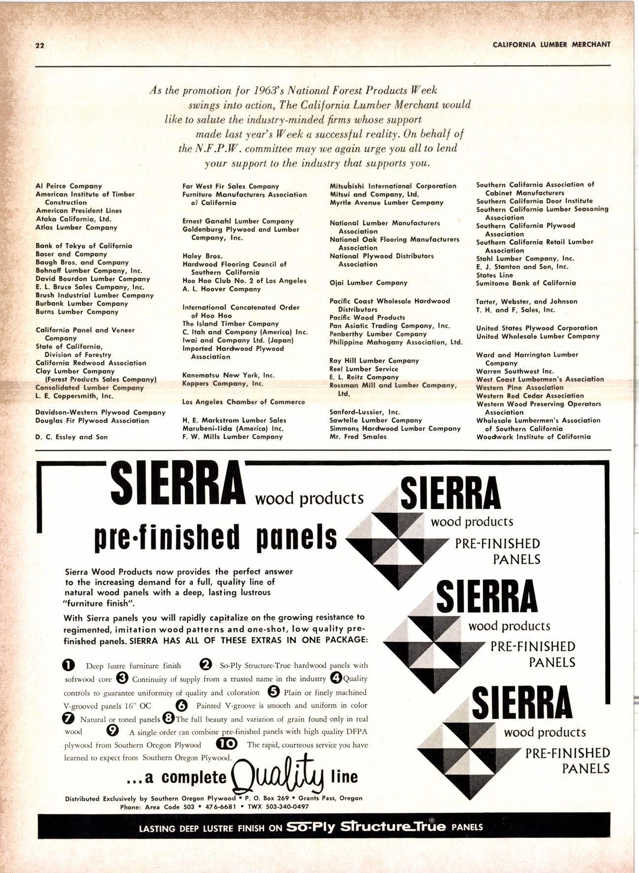 2-8143 Son Bernordino - Riverside Arrowhcod lumbcr Compony-----.----.--.-TUrncr 1'7 511 Corlow Compony.-..-...---..--.-.-.-...-----..-..-TAlbol 5'0672 Gcorgio-Pocific Worchousc.-.....-.----.OVcrlond 4'5353 Inlond tumbcr Compony.-..------.-------.---.Tninity 7'2001 Kcy Corporotion ---.-.--.---.----..----------------------875'20(0 Torlcr, Wcbrtcr & Johnson..-.....-------.Tlionglc 5-1550 San Diego TUIIIEI AND LUIITEI PTODUC'I Inlqnd Lumber Compony----........--------.GRidlcy 4'1583 lAople Bros., Inc..-.-..-------...-------.-..Hlckory 2-8895 Roltz Co., E. t..----..---.....--- -...-----..-----f l+Gt 9-1166 Rockel Chemicol Co. --...------.--------------JUniper 3'2071 Soufh Boy lumber Co. (tos Angelesf----ZEnith 2291 Torlcr, Websler & Johnson----.-----------Glidley 7'1171 Wcyerhoeuser Compony------..------------COngrcss'4'3342 IUIIDING IIATENIALS Cobb Compony, T. M..-.--...---.......-------BElnonl 3-6673 United Stotes Plywood Corp. ------.-------BElmonl 2-5O78 Northern Coliforniq ARCATA Arcoto Redwood Compony--..------..--.-----Hlllsidc 3-5Gtl Asrocioled Redwood Mills.-.---..--------VAndyke 2-211 6 Heird [umber Compony..-..---------------VAndyle 2-4641 Hofmes tumber Co', Frcd C.........----VAndyke 2-3557 Pocific Fir Sqles----.-..----...-.-------.-------VAndykc 2-2181 Tocomo Lumber Soles, lnc.---------------VAndykc 2'3601 T. H. & F. Soles, lnc..------------.-----------VAndyka 2'2971 Twin Horbors lumber Co..."----...------...-VAndykc 2-2971 ANDERSON Pcuf Bunyon Lumber Co....-----------------Elierson 5-2771 AUBERRY King's River Lumber Corp.-..-----------------.-------UL 6-2521 BAKERSFIETD Georgio-Pocif ic Worehouse.------- --------F Airview 7 -777 1 U. S. Pfywood Corp..------...-...-------------FAirview 7'7736 CTOVERDATE Art Bond !umbar Co...'..--.-..-.---------TWinbrook 4'3326 Kin Ton lumbcr Co.--.--- .-.YW 'f-25tE Rounds tumbcr Compony----------------TWinbrook 4'3362 GUATATA G & A [umber Co..-.------------.--------------fUxedo 4-3462 FORT BRAGG Aborigine Lumber Co.-------------.--------YOrktown 4-40O1 Holme.-s [umbcr Co., Frcd C.------------YOrktown 4-4058 FRESNO Buifding Moleriqls Distributors--"..--- 26r','6591 Coloveios Cemcnt Co..-....-.--.---...--.---.----ADomc 7-1831 Georgio-Pocillc Worehouse ---------------A/vihursl 8-6191 Tortei, Websfer & Johnson. Inc.----------Clinton l-5031 U.S. Plywood Corp.---.--------------------------AMhursl 6-8121 oRovlttE Centrol Volley Box & I'br ------------------------tEnox 3-6461 STOCKION Buifding Moteriols Dislributors-------- 466'2553 Worehouse 166'2551 UKIAH Bfenco Lumber Soles Co. .---.-------HOmesleod 2'7535 Hollow Tree Redwood Co.------------HOmcsteod 2'3821 wrtuTs Podulo Lumber Co,...--------....----------------Gtobc 9'2'f65 Willirs Redwood Products Co.-------------.G[obe 9-5595-' wttuAMs Sqn Antonio Pole--..--...----.----- 173'5381 Oregon BEND brooks Sconlon ...-----EVcrgrcen 2'2511 EUGENE Gcm Studs, lnc.----.--.--..---.---..------..-.-----..-..--.-Rl 7'9332 Sncllsfrom tumber Co..--.....----.....-------Dlomond 2-ll4l U.S. Plywood Corp.---..-.----......----------Dlomond 2'llll GITCHRIST Gifchrist Timber Co. --'--"""'433-2221 GRANT'S PASS Sierro Wood Products ----------176'6681 TAEDFORD Heorin Lumbcr Compony.-...------ ---------------------772'7 lgz PORTIAND lrtoorc Dry Kiln Compony--.---..---.-..----AVenuc 606i16 Tumqc Lunbcr Co..-.-.--.-...--.---.--...-.-----CApifol 666{ll U.S. Plywood Corp..-----.--..-.--....-..---.----CApirol 7-Olil7 Woshington r-;;rri'it t' : t' -3CAI,IFORNIA IUftIIER XIETCHANT ,ir .itr TACO'YIA Chcncy lunbcr 3-2121