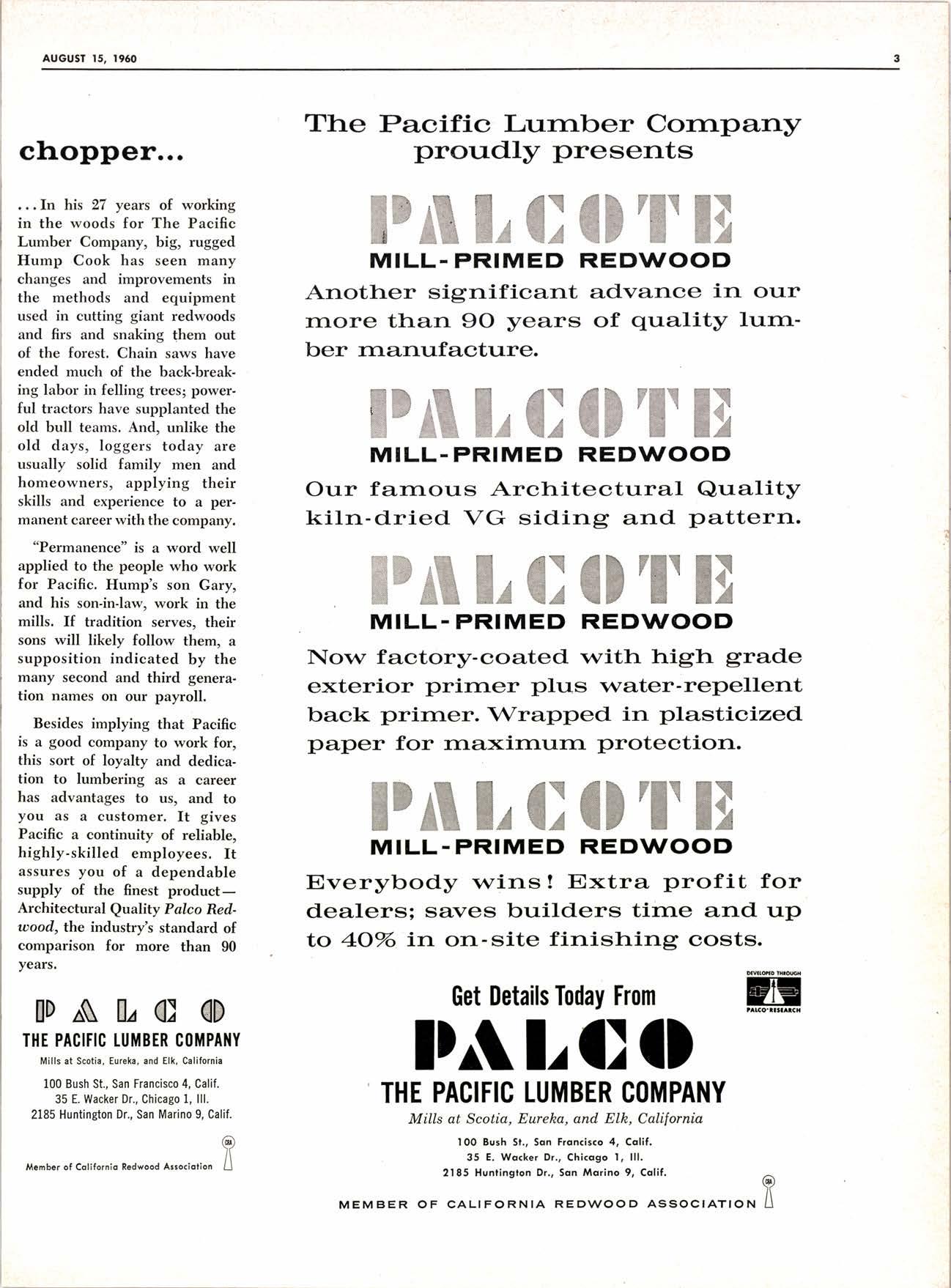 Get Details Today From pAl,l)l) THE PACIFIC LUMBER C(IMPANY Mills at Scotia, Eureha, and Elk, California 100 Eush 51., Son Froncisco 4, Colif. 35 E. Wqcker Dr., Chicogo l, lll. 2185 Hunfington Dr., Son Mqrino 9, Colif. A ll MEMBER OF cALIFoRNIA REDWOOD ASSOCTATION II ttr I]I