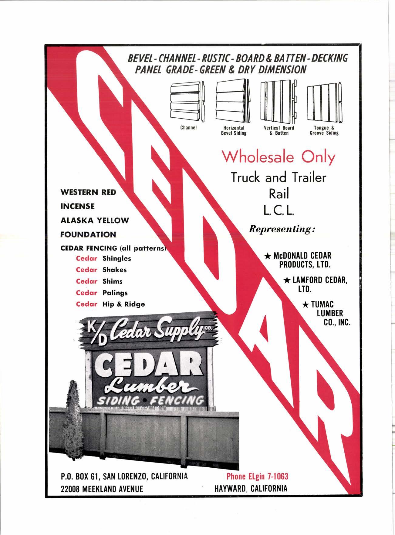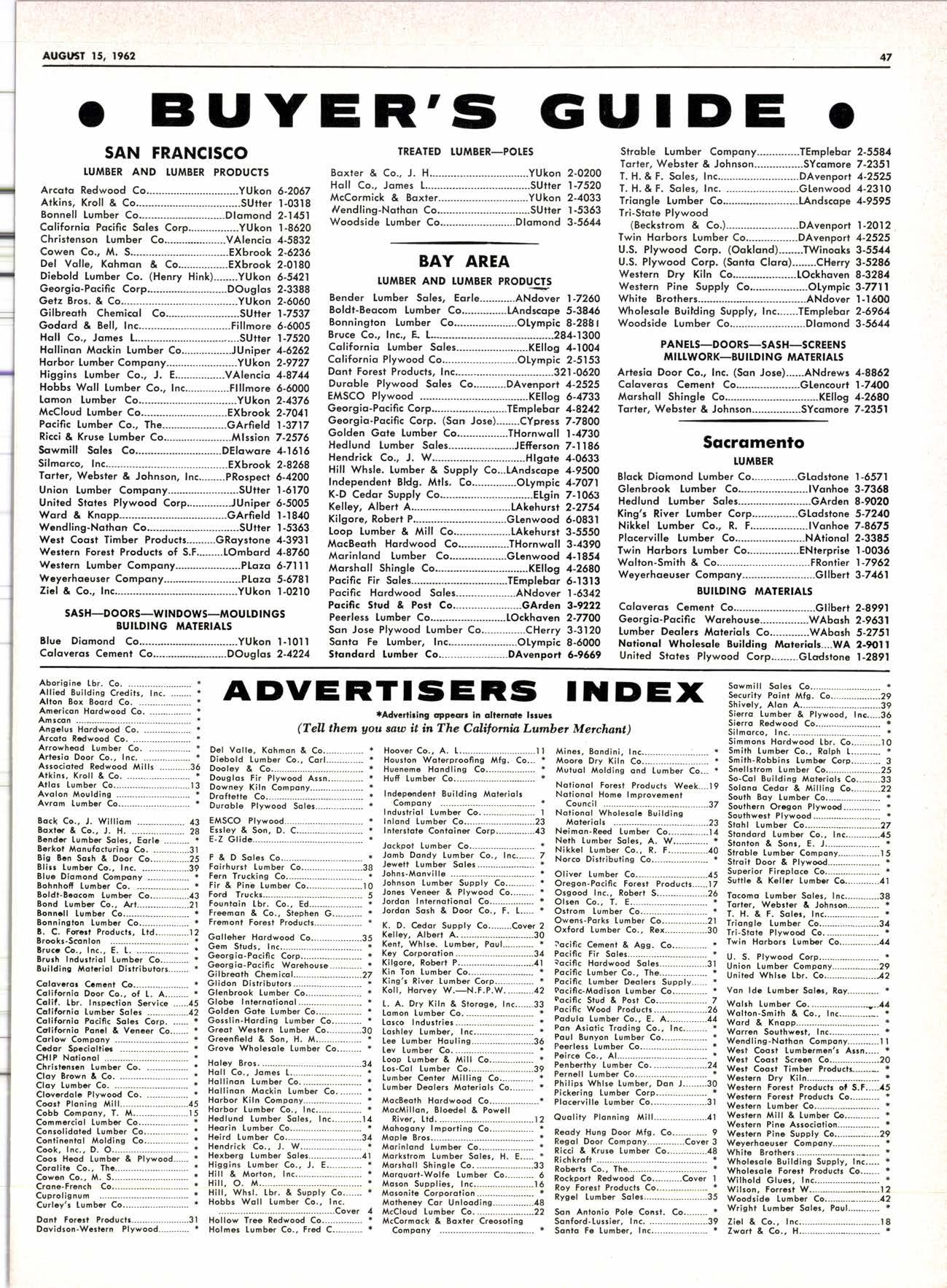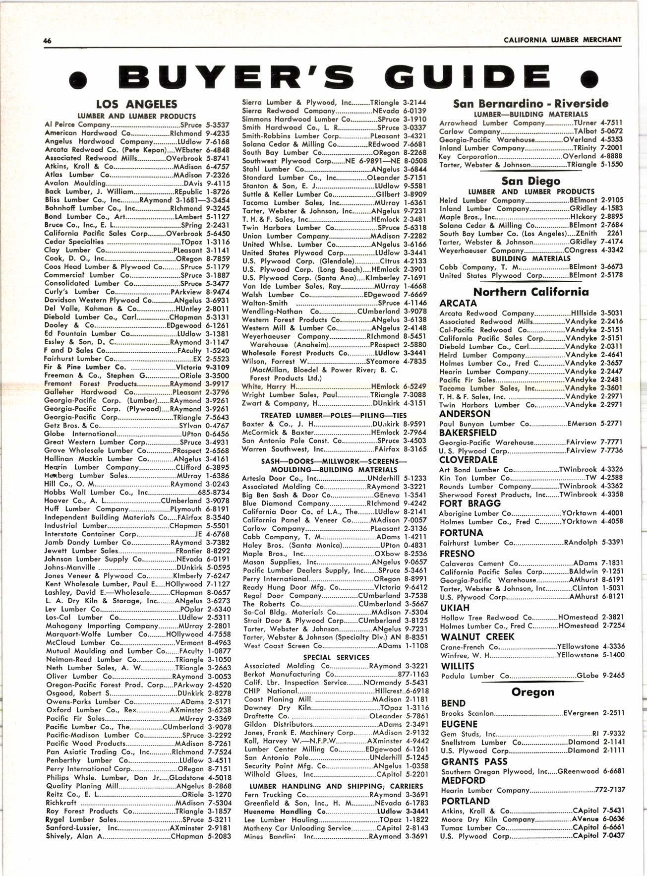 IUIIBER AND I.UMBER PRODUCTS Bender Lumber Sqlet, Eqrle..-..-..-...ANdover I-7260 Boldt-Beqcom Lumber Co..-.--..-......lAndrope 5-3846 Bonningfon Lumber Co........-...........O[ympic 8-288f Bruce Co., Inc., E L.--.-..... -...284-t300 Cqlifornio Lumber Sqlec...-....................KE11og 4.1004 Colifornio Plywood Co.........--.---.-----.-..Olympic 2-5153 Dont Foresl Products, Inc.....---..-..........- -...--....-321 -0620 Duroble Plywood Salec Co.-.........DAvcnport 4-2525 EIISCO Plywood .-.--...........--.-............-...KEllos 6-4733 Georgio-Pocific Corp........----.....---....-TEmplebor 4-8242 Georgio-Pocific Corp. (Son Joso)........CYprcct 7 -7800 Golden Gatc Lumber Co...-.............THornwq11 l-4730 llcdlund lumber Sqler.-...-..--............JEficruon 7-1186 Hendrick Co., J. W.....-.-.------..-.--.Hlgote 4-0633 Hill Whslc. lumbcr & Supply Co...lAndscopc 4-9500 fndependeni Bldg. Mtls. Co...............O1ympic 1-7071 K-D Cedqr Supply Co...............................Etgin 7-1063 Kelley, Albe* A.............-.-.-.-.............tAkehurcr 2-2754 Kilgorc, Robert P....-.-.-..--.---.-.-.........GLcnwood 5-0831 Loop lumber & Mill Co.-.............--.-[Akchunt 3-5550 MqcBeoth Hordwood Co.-.-...-...---..-THornwoll 3-4390 Morinfqnd Lumber Co.---.-..-.....-....Glcnwood 1-1851 Morsholl Shingle Co.-.----....--.-......-----....KEllog 4-2680 Pocific Fir So1es..........-..--..--.......--....TEmplcbar 5-l 3l 3 Pcciffc Hordwood Soles--.-................ANdovr l-6342 Pociftc Stud & Post Co.......-..-............GArden 3-9222 Peerlesr Lumber Co....-.-.-.-..-.-....-...-LOckhoven 2-7700 Son Jose Plywood Lumber Co..-.........-.-CHerry 3-3120 Sonlo Fe Lumber, 1nc,.........-------Olympic 8-6000 Stondord lumbcr Co.-".-...-.....-...-....DAvenport b9669 Stroble Lumbcr Compony...------.-.-.TEmplebor 2-5584 Torler, Websler & Johnson-....---.--.....SYcomorc 7-2351 T. H. & F. Soles, 1nc.....-....-...-..---...-..-DAvenport 4-252!i T. H. & F. Sqles, Inc. ..----."..-.-....--.-...G[enwood ,{-2310 Tricngle Lumber Co,..........-..-.-.--.....lAndscope 4.9595 Tri-Stote Plywood (Beckstrom & Co.)....-.......---..-.--...DAvenpori 1 -2012 Twin Horbors [umber Co,.-.--...----.-.-DAvenporl 4-2525 U.S. Plywood Corp. (Ooklond)..-..-..fWinoqkr 3-5!144 U.S. Plywood Corp. (Sonto Cloro)-.-...-.Cllgrry 3-5286 Western Dry Kiln Co...,.-...............1,Ockhqven 8-328f Woslcrn Pine Supply Co..------.....-...--OLympic 3.7711 White Brothers ----.----.ANdovcr l-16{X) Wholesqle Building Supply, Inc..-...-TEmplebor 2-6964 Woodside Lumber Co.........................D1omond 3-5644 PANEI.HOORS_sASH_SCREENS TIITWORK-BUIIDING IIATERIAIS Arlaciq Door Co,, Inc. (Son Jore)--....ANdrewr 4-8852 Coloverqs Cemenl Co..-..-......-..-...--GLcncourt l-710O Morsholl Shinglc Co.---.-.-.....-....-----..-.-.-.KEllog 4-2680 Tsrfer, Webster & Johnson....--.--.--.-.-SYccmoro 7-2351 Socromenlo TUMIER Blqck Diomond lumber Co.....-.........Glodslone l-6571 Glenbrook Lumbcr Co.-.........-.---.......lVonhoc 3-7368 Hcdlund Lumbcr Soler...--.-.-....-.-.....GArden 8-9020 King'r River Lumber Corp..-.....----.-.Glodstone 5-721O Nikkcl [umber Co., R. F..-......-...-.....lVonhoc 7-8675 Plqcerville Lumbcr Co..-....................NAtionq1 2-3385 Twin Hqrborr Lumber Co.....--..--......ENterprirc 1.0036 Wolton-Smith & Co..--.--.......-.-.--....-..-...FRontier l-7962 Weycrhoeuter Compony....-----------.-.......G11bcrf 3-7451 BUIIDING IAATERIATS Coloveros Cement Co......--.-...-.....-..---..Gllbcrt 2-8991 Gcorgio-Pocific Worehouse---.---.-.......WAbqrh 2-9631 Lumber Deolcrr A{qtcriqls Co..--..-..-.-.WAborh 5-2751 Notionol Wholesole Building lVloferiols-...WA 2-9Oll United Stofes Plywood Corp..-...-..G[odstone I-2891