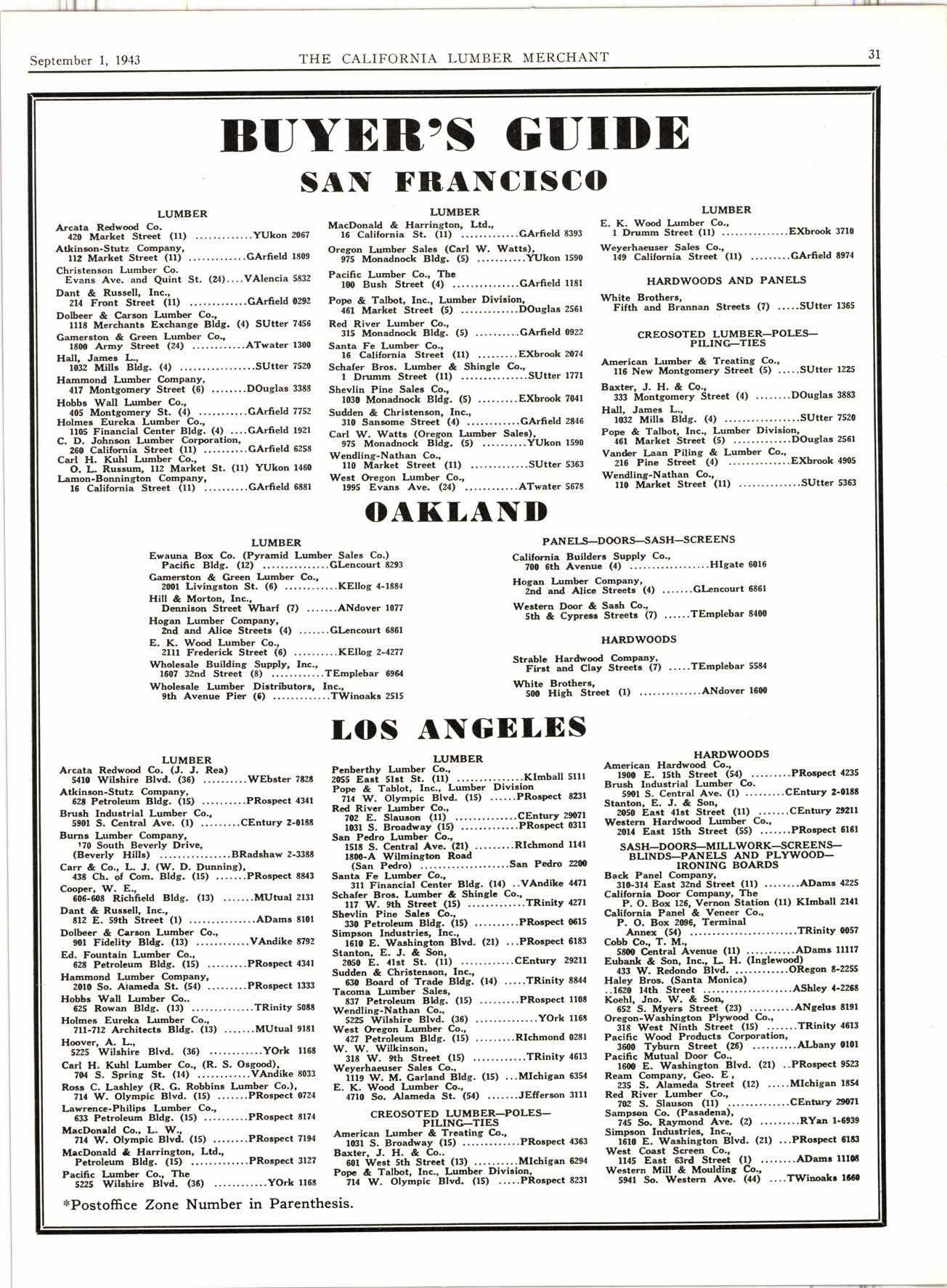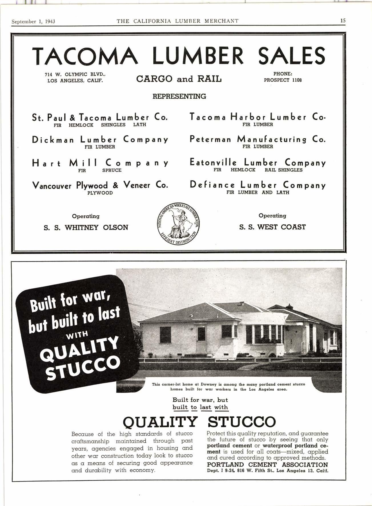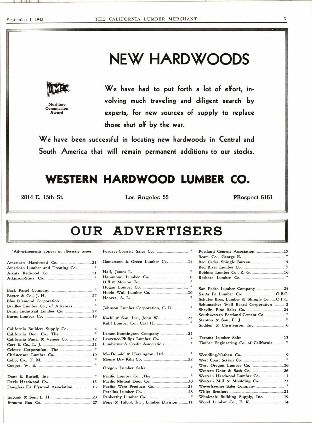 }YESTERN 2014 E lsrh St. HARDWOOD LUMBER CO. Ios Angeles 55 PRospect 616l OUR ADVERTISERS Fordyce.Crossett Sales Co. Potland C,cment Arcociation -----------------------15 Ream Co., George E. -- ----------Red Cedar Shingte Bureau --------------------------- 5 Red River Lr'-ber Cr. -----------------------.----------- 7 Robbins Lumber.Co, R. G. ------ --------------------16 Rosboro Lumber Co. -.-----------.San Pedro Lumber C,ompany ------------------------24 Santa Fe Lumbet C,o. ---------.------------------O.B.C. Schafer Bros. Lumber & Shingle Co. ----O.F.C. Schumacher VaIl Board Corporation -------- 2 Shevlin Pine Sales Co. -------------------------------24 Southwectern Portland Cement Co. ---------------* Stanton & Son, E. J. Sudden & Christenson, Inc. ------------------------ 6 Tacoma Lumber Saler 15 Timber Engineering C,o. of California -----* Wendling-Nathan Co. ------------- 9 Wect Coast Screen C,o. Wert Oregon Lumber Co. ---------------------------2It Vestern Door & Sash Co. ---------------------.----26 Vestcrn Hardwood Lumber C,o. ------------------t Vestern Mill & Moulding C,r. -----------------.2t Weyerhaeuser Saler Gompany -----------------..---* Vhite Brothers --------- ------- ------- --------------..-----2I Vholesale Building Supply, fnc. --------------19 Vood Lumbet Co., E. K. --,,------------------'---14